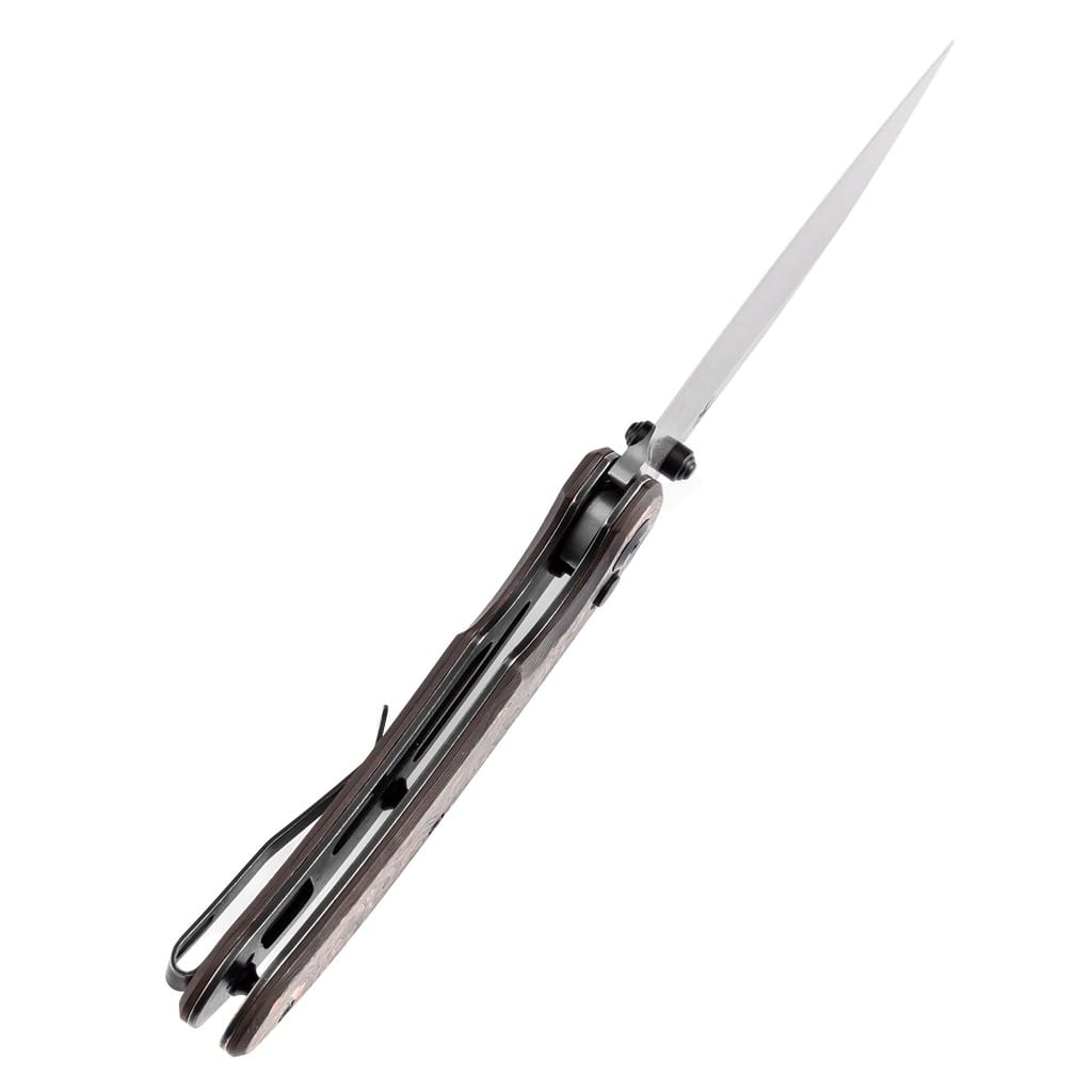 Nesstreet firmy Kansept to elegancki nóż składany, który świetnie sprawdzi się jako uzupełnienie do garderoby na służbowe spotkanie. Szerokie ostrze o funkcjonalnym profilu Sheepsfoot wykonano ze stali damasceńskiej o interesującym wzorze, bardzo dobrze ukrywającym wszelkie niedoskonałości powstające podczas eksploatacji. Klingę osadzono na ceramicznych łożyskach kulkowych, która przy wykorzystaniu obustronnego kołka umieszczonego na głowni wysuwa się płynnie i gładko. Prosta obsługa jedną ręką zadowoli zarówno osoby prawo, jak i leworęczne. Dodatkowo model można rozłożyć intuicyjnym przyciskiem od blokady guzikowej, znajdującym się na okładzinie chwytu. Mechanizm Button Lock dba o bezpieczeństwo użytkownika, chroniąc przed przypadkowym złożeniem się narzędzia, gdy jest w użyciu. Rękojeść z ultralekkiego i wytrzymałego włókna węglowego wzbogacona o elementy miedziane wygląda pięknie i oryginalnie. Dzięki głębokiemu wyprofilowaniu pod palec świetnie układa się w dłoni gwarantując pewny chwyt. Konstrukcję uzupełnia klips mocujący, pozwalający na wygodne przenoszenie noża w kieszeni spodni lub przy wyposażeniu. W zestawie znajduje się ściereczka z mikrofibry oraz wysokiej jakości pokrowiec do bezpiecznego transportowania narzędzia, a całość zapakowano w czarne pudełko prezentowe. Kansept Knives to uosobienie najnowocześniejszych technologii i praktycznego wzornictwa. Jej motto brzmi “Nie tylko produkujemy noże, czynimy je lepszymi”, co doskonale oddaje charakter tej marki. Firma wyróżnia się z tłumu innowacyjnymi koncepcjami angażując do współpracy najlepszych projektantów z branży. Każdy element obrabiany jest skrupulatnie ręcznie lub za pomocą zaawansowanych maszyn, co tworzy znakomite połączenie kunsztu i estetyki.