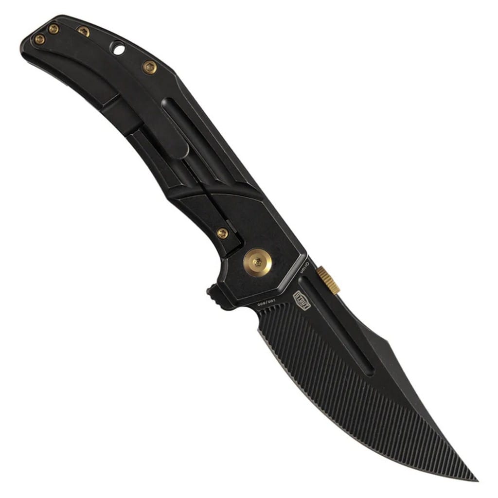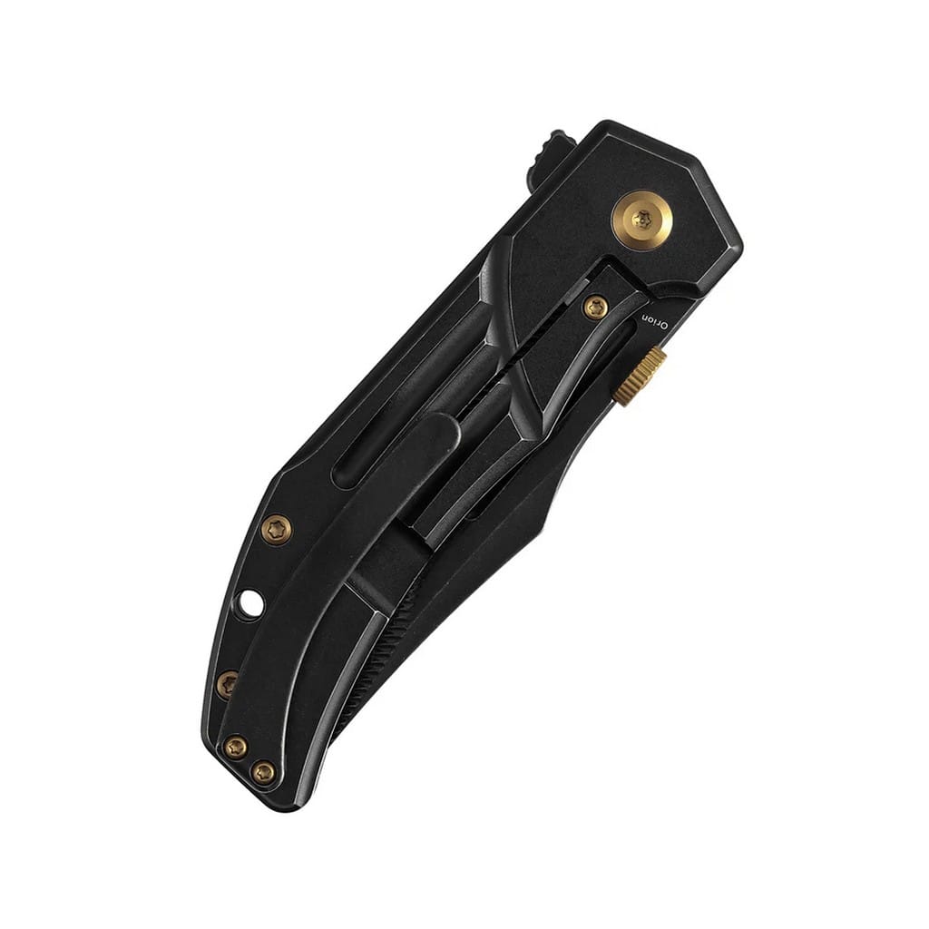 JB Stout z zawodu jest mechanikiem, który z pasją tworzy również noże, a model Orion to prawdziwe dzieło sztuki. Został zaprojektowany dla firmy Kanspet Knives i wyprodukowany w limitowanej ilości 800 sztuk. Fakt ten z pewnością ucieszy kolekcjonerów poszukujących folderów z ograniczoną dostępnością na rynku, co stanowi swoistą perełkę w gablocie. Orion posiada ostrze o profilu Clip Point zrobione z amerykańskiej stali nierdzewnej klasy premium CPM S35VN. Odpowiednio dobrane proporcje wanadu i niobu wpływają na jej twardość, wytrzymałość i odporność na korozję. Wykończenie głowni na czarno metodą Blackwash pozostawia nieregularną powłokę dobrze maskującą rysy i zadrapania powstające podczas eksploatacji. Przyciągające wzrok frezowania na klindze nadają interesującego i unikatowego wyglądu. Ostrze osadzono na ceramicznych łożyskach kulkowych, która przy wykorzystaniu dysku lub dużego flippera, pełniącego również funkcję jelca, wysuwa się płynnie i gładko. Prosta obsługa jedną ręką zadowoli zarówno osoby prawo, jak i leworęczne. Bezpieczeństwo pracy zapewnia solidny i niezawodny mechanizm Frame Lock skutecznie blokujący narzędzie po rozłożeniu. Ergonomicznie wyprofilowana, tytanowa rękojeść gwarantuje wysoki komfort użytkowania. Na zakończeniu umieszczono otwór umożliwiający przełożenie breloka ozdobnego lub paracordu ułatwiających chwytanie noża. Konstrukcję uzupełnia klips mocujący z tytanu służący do wygodnego przenoszenia foldera w kieszeni spodni. W zestawie znajduje się ściereczka z mikrofibry oraz wysokiej jakości pokrowiec transportowy, a całość zapakowano w czarne pudełko prezentowe. Kansept Knives to uosobienie najnowocześniejszych technologii i praktycznego wzornictwa. Jej motto brzmi “Nie tylko produkujemy noże, czynimy je lepszymi”, co doskonale oddaje profil tej marki. Firma wyróżnia się z tłumu innowacyjnymi koncepcjami angażując do współpracy najlepszych designerów z branży. Każdy element jest skrupulatnie obrabiany za pomocą zaawansowanych maszyn lub ręcznie, tworząc znakomite połączenie kunsztu i estetyki.