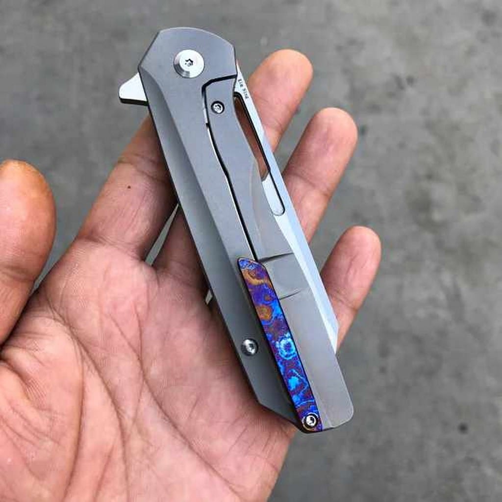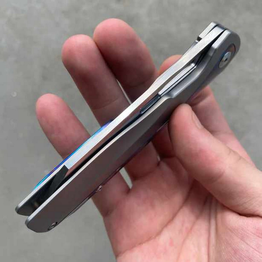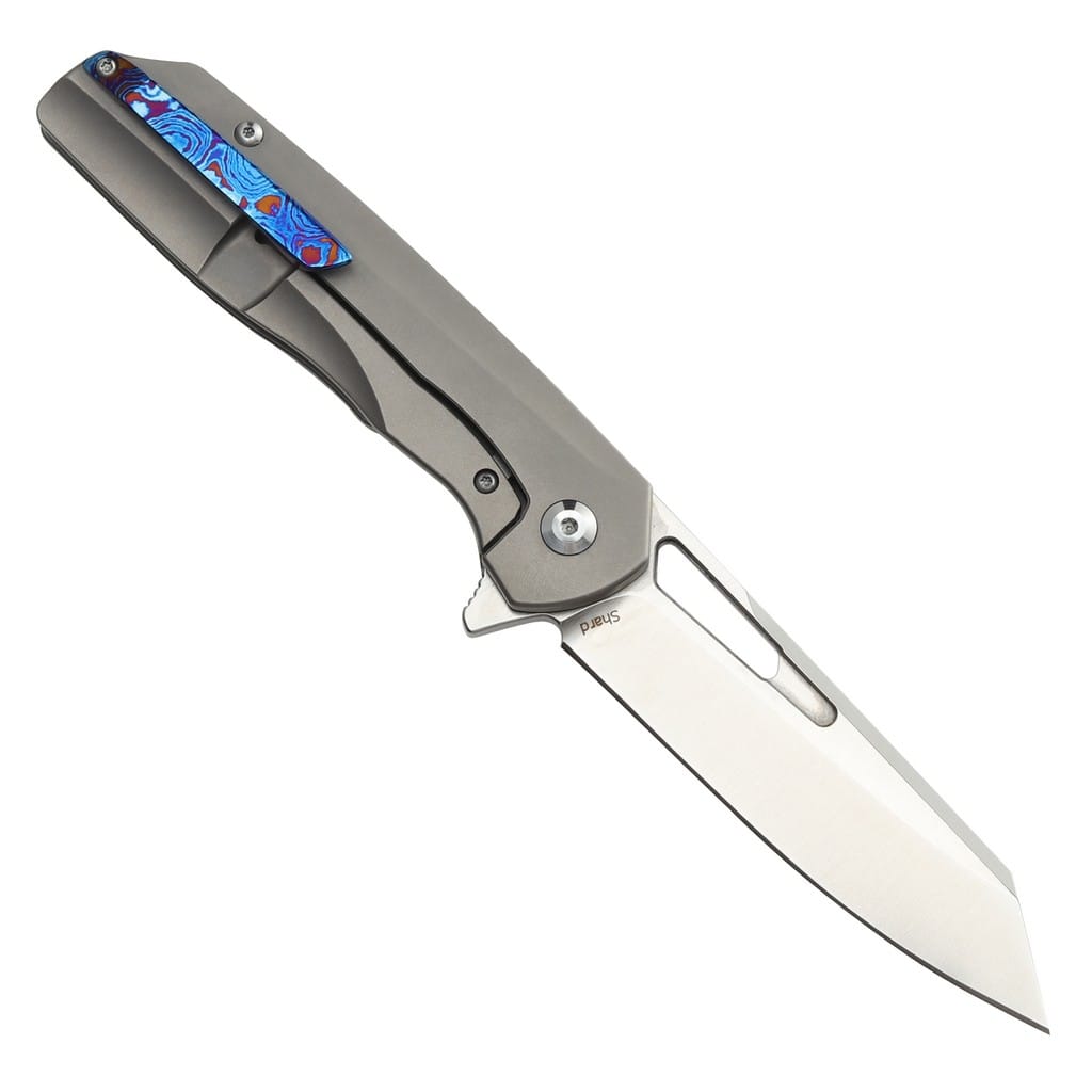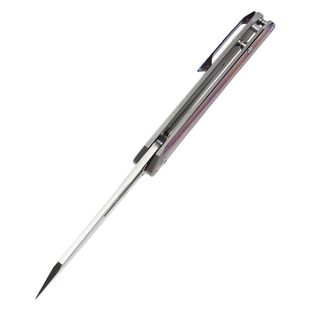 Shard firmy Kansept Knives to innowacyjny projekt o wysokiej jakości wykonania, gwarantujący niezawodność i wydajność na najwyższym poziomie. Model posiada głownię o profilu Reverse Tanto wykonaną z amerykańskiej stali nierdzewnej klasy premium CPM S35VN. Odpowiednio dobrane proporcje wanadu i niobu wpływają na jej twardość, wytrzymałość i odporność na korozję. Wykończenie jej metodą Satin pozostawia drobne ryski lekko matujące powierzchnię, co daje efekt niedokładnego wypolerowania. Klingę osadzono na ceramicznych łożyskach kulkowych, która przy wykorzystaniu otworu na głowni lub flippera, pełniącego także funkcję jelca, wysuwa się płynnie i gładko. Prosta obsługa jedną ręką zadowoli zarówno osoby prawo jak i leworęczne. Bezpieczeństwo pracy zapewnia solidny i niezawodny mechanizm Frame Lock chroniący przed przypadkowym złożeniem się noża, gdy jest w użyciu. Rękojeść to połączenie gładkiego tytanu z materiałem o nazwie Timascus, powstającym z dwóch lub więcej stopów tytanu o ekskluzywnym wyglądzie damastu. Frezowane krawędzie chwytu i wcięcie pod palec sprawiają, że folder komfortowo układa się w dłoni użytkownika. Konstrukcję uzupełnia tytanowy klips mocujący, pozwalający na wygodne przenoszenie narzędzia w kieszeni spodni. W zestawie znajduje się ściereczka z mikrofibry oraz wysokiej jakości pokrowiec do bezpiecznego transportowania produktu, a całość zapakowano w czarne pudełko prezentowe. Shard stanowi idealne uzupełnienie jako elegancki dodatek do garderoby na formalnych spotkaniach i nie tylko. Kansept Knives to uosobienie najnowocześniejszych technologii i praktycznego wzornictwa. Jej motto brzmi “Nie tylko produkujemy noże, czynimy je lepszymi”, co doskonale oddaje charakter tej marki. Firma wyróżnia się z tłumu innowacyjnymi koncepcjami angażując do współpracy najlepszych projektantów z branży. Każdy element obrabiany jest skrupulatnie ręcznie lub za pomocą zaawansowanych maszyn, co tworzy znakomite zespolenie kunsztu i estetyki.