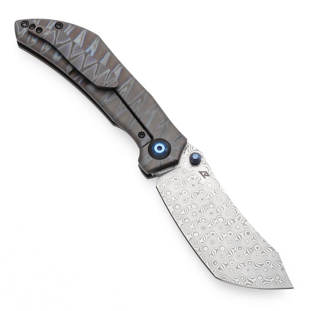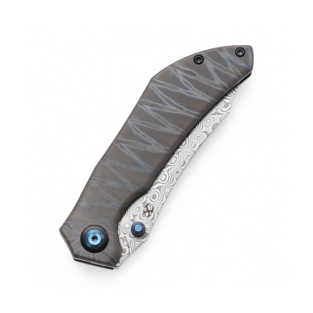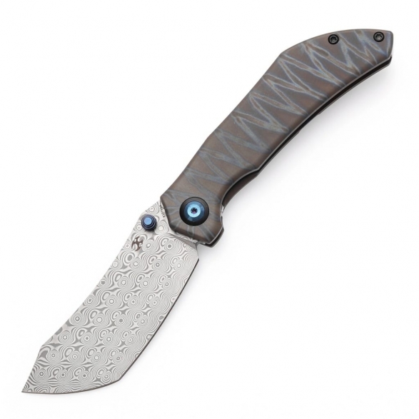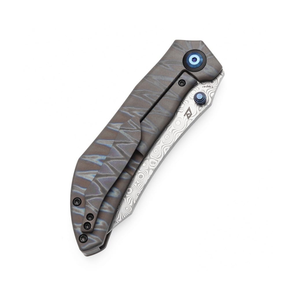 Tipper firmy Kansept Knives odznacza się dość szalonym i nietypowym kształtem przyciągającym wzrok, dlatego warto dodać go do swojej kolekcji. Nóż oferuje wysokiej jakości materiały, dzięki czemu świetnie sprawdzi jako model codziennego użytku dostarczający niezawodność w każdej sytuacji. Ostrze o zmodyfikowanym profilu Cleaver wykonano ze stali damasceńskiej o oryginalnym wzorze dobrze ukrywającym niedoskonałości powstające podczas eksploatacji. Klingę osadzono na ceramicznych łożyskach kulkowych, która przy wykorzystaniu obustronnego kołka wysuwa się płynnie i gładko. Prosta obsługa jedną ręką zadowoli zarówno osoby prawo, jak i leworęczne. Bezpieczeństwo pracy zapewnia solidny i niezawodny mechanizm Frame Lock skutecznie blokujący narzędzie po rozłożeniu. Tytanowa rękojeść o ergonomicznym wyprofilowaniu i solidnej budowie dobrze układa się w dłoni użytkownika. Dopełnie stanowi klips mocujący z tytanu służący do wygodnego przenoszenie foldera w kieszeni spodni. Dodatkowo konstrukcję zdobią anodowane na niebiesko akcenty nadające unikatowego charakteru całości. W zestawie znajduje się ściereczka z mikrofibry oraz gatunkowy pokrowiec transportowy zapakowany w czarne pudełko prezentowe. Kansept Knives to uosobienie najnowocześniejszych technologii i praktycznego wzornictwa. Jej motto brzmi “Nie tylko produkujemy noże, czynimy je lepszymi”, co doskonale oddaje profil tej marki. Firma wyróżnia się z tłumu innowacyjnymi koncepcjami angażując do współpracy najlepszych projektantów z branży. Każdy element jest skrupulatnie obrabiany za pomocą zaawansowanych maszyn lub ręcznie, tworząc znakomite połączenie kunsztu i estetyki.