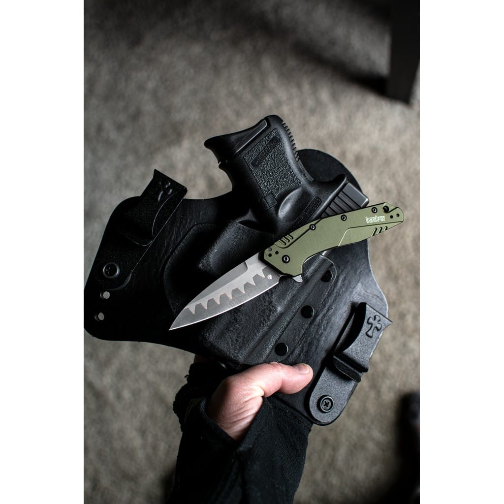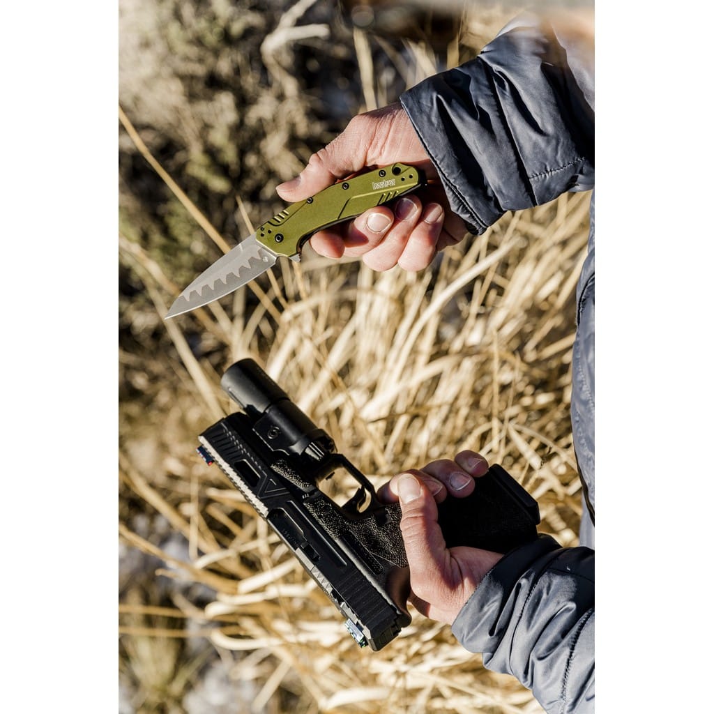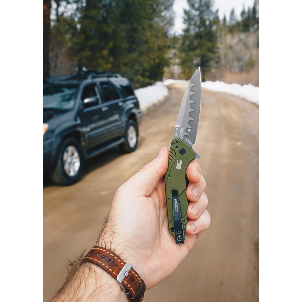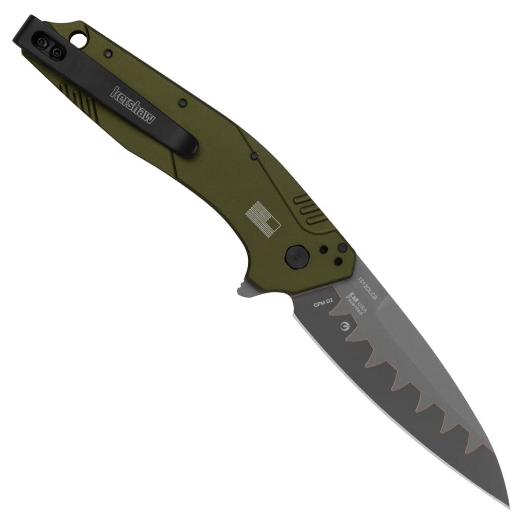 Dividend wyprodukowany w USA przez firmę Kershaw urzeka wyglądem i jakością wykonania. Stanowi idealny wybór dla miłośników noży, a także osób szukających niezawodnego narzędzia na co dzień. Model posiada głownię o profilu Drop Point zrobioną z kompozytu dwóch stali, oddzielonych linią o kształcie zębów ptaka. Górna część klingi to Bohler N690 o wysokiej odporności na korozję i wyjątkowej twardości, dolna to stal narzędziowa D2 świetnie trzymającej ostrość. Matowy efekt na jej powierzchni uzyskano poprzez zastosowanie wykończenia Bead Blast. Do szybkiego rozłożenia noża służy sporych rozmiarów flipper, pełniący jednocześnie funkcję jelca. Dodatkowo wspomaganie wysuwania ostrza w postaci wewnętrznej sprężyny, sprawia że model jest gotowy do działania w ułamku sekundy. Blokada Liner Lock dba o bezpieczeństwo użytkownika chroniąc przed przypadkowym złożeniem się narzędzia, gdy jest w użyciu. Ergonomicznie wyprofilowana rękojeść, z aluminium anodowanego na piękny, zielony kolor, gwarantuje pewny chwyt i zapewnia wysoki komfort pracy. Na zakończeniu znajduje się otwór umożliwiający przełożenie paracordu lub breloka ozdobnego. Konstrukcję uzupełnia dwupozycyjny klips mocujący do wygodnego przenoszenia noża w kieszeni spodni.