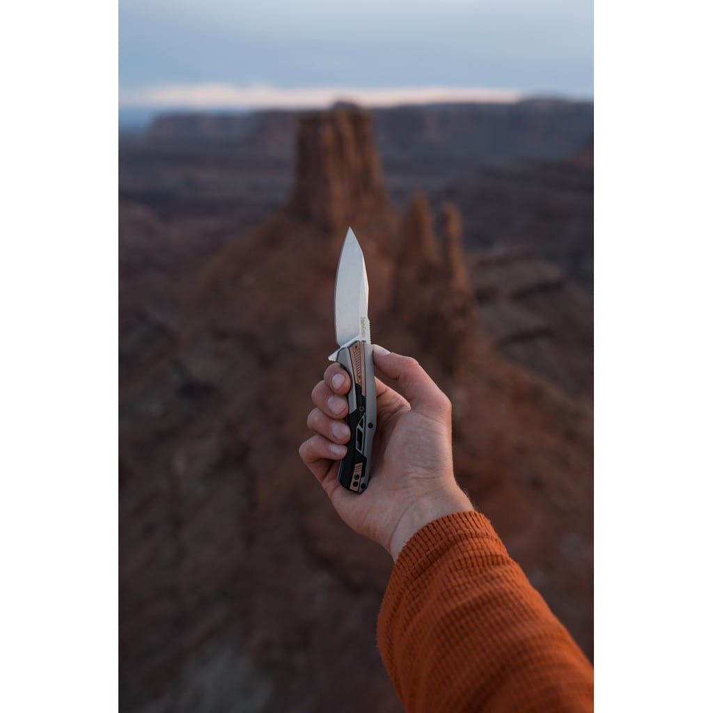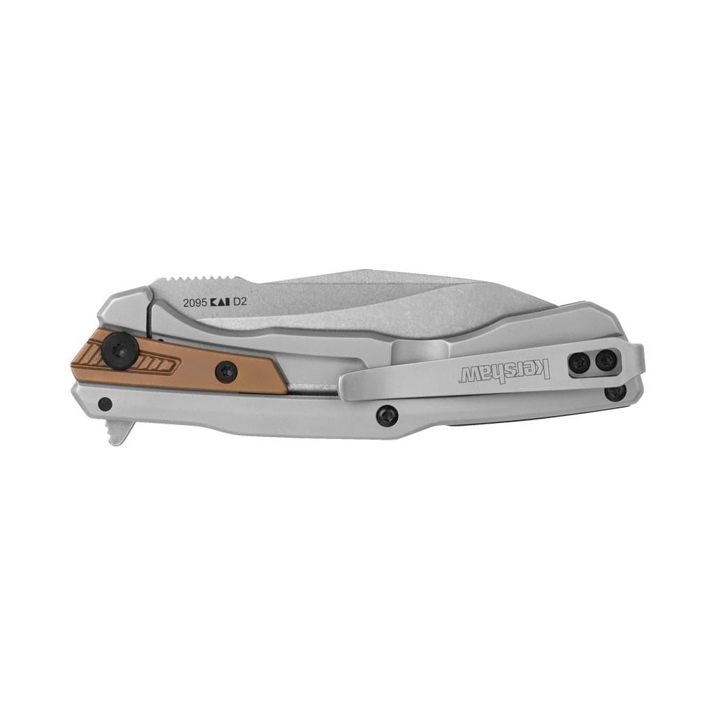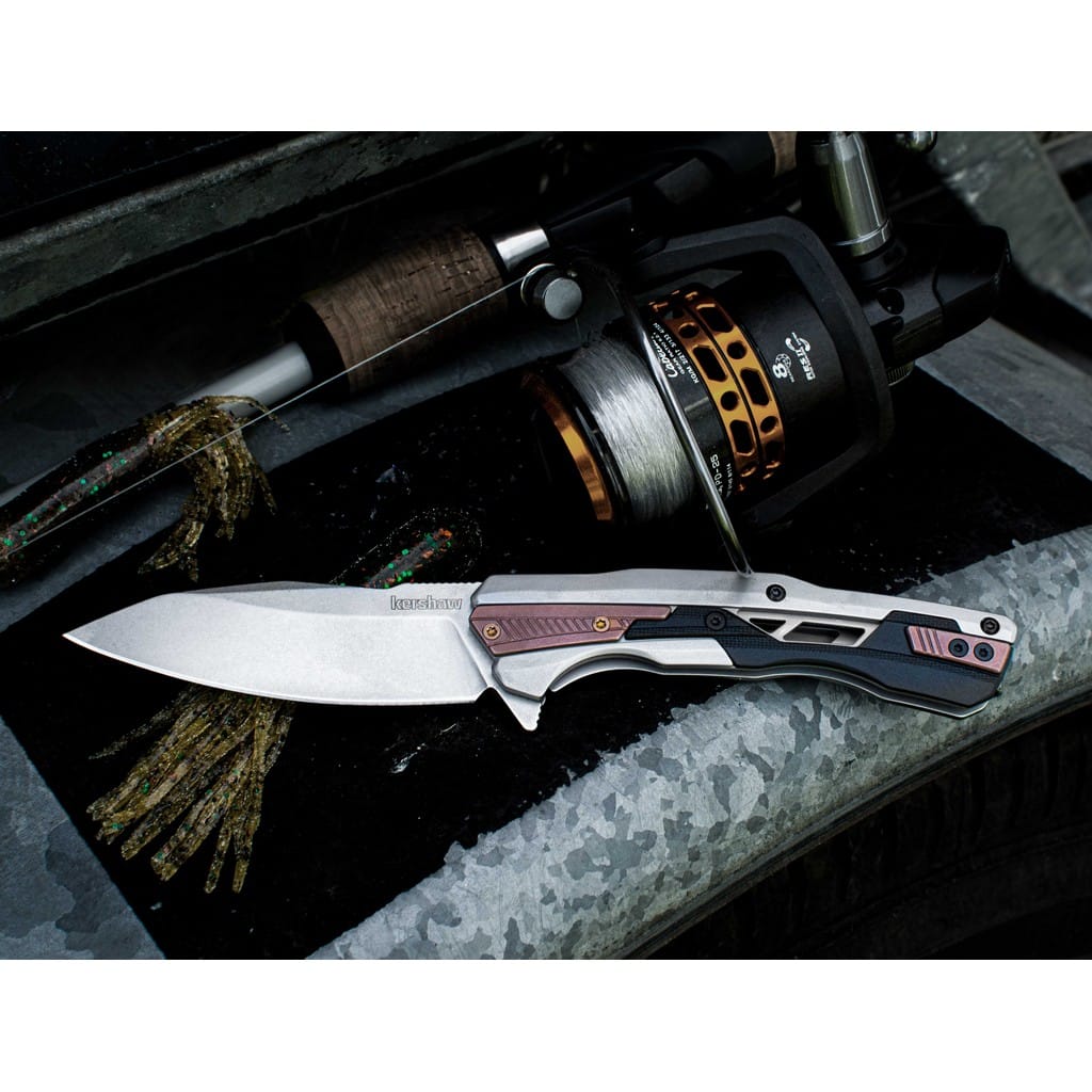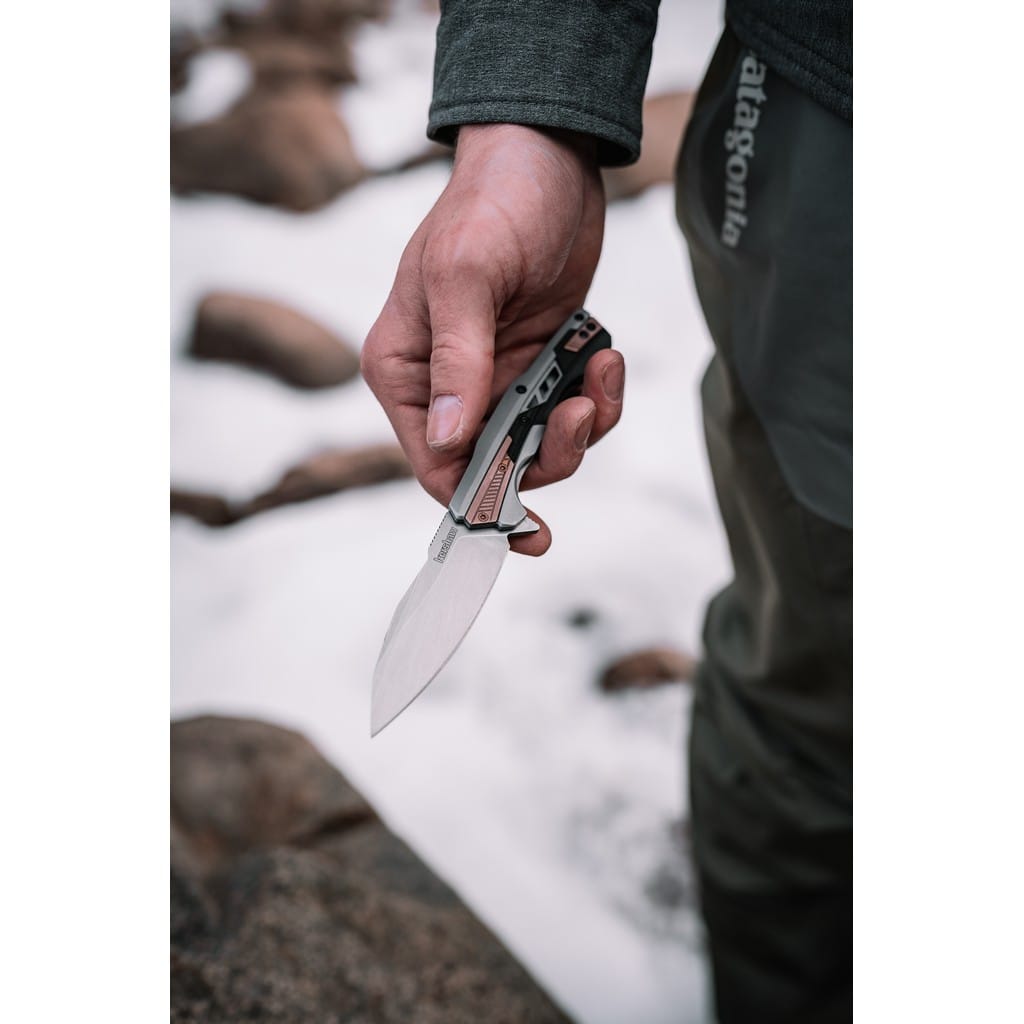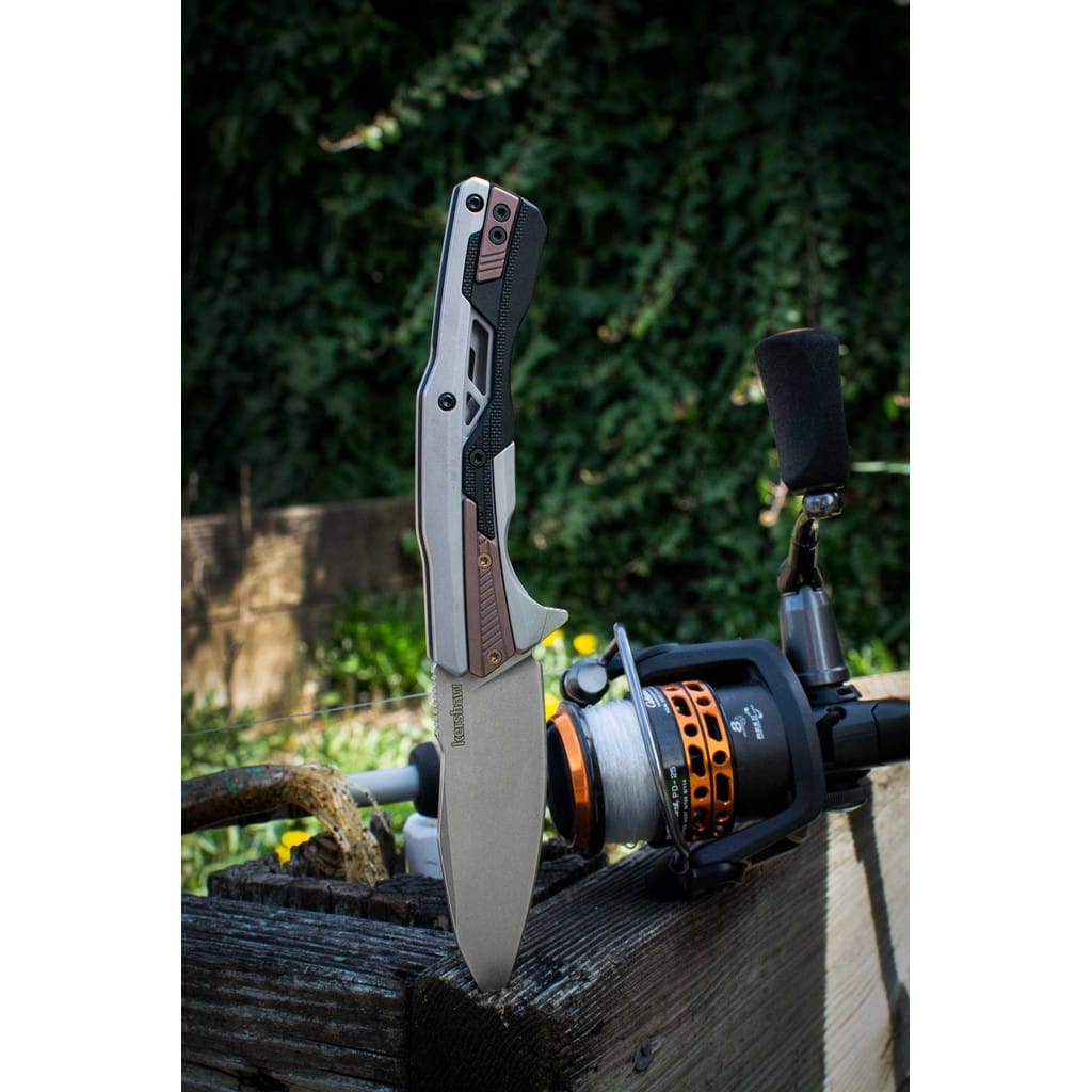 Wysoka jakość materiałów, złożone elementy projektu i praktyczna użyteczność to cechy charakteryzujące model Endgame zaprojektowany przez firmę Kershaw. Szerokie ostrze o profilu Drop Point zostało wykonane z wysokiej jakości stali narzędziowej D2 długo utrzymującej ostrość i bardzo wytrzymałej. Wykończenie jej metodą Stonewash pozostawia nieregularną powłokę dobrze maskującą rysy powstające podczas eksploatacji. Nad bezpieczeństwem pracy czuwa solidna blokada Frame Lock, a także karbowany grzbiet głowni stanowiący stabilne podparcie dla kciuka. Szybkie i płynne rozłożenie noża jedną ręką przy wykorzystaniu flippera pełniącego jednocześnie funkcję jelca umożliwia łożyskowy systemem KVT (Kershaw Velocity Technology). Stalową rękojeść wzbogacają brązowe wstawki pokryte powłoką PVD oraz czarny element z nylonu wzmocnionego włóknem szklanym o antypoślizgowej fakturze. Chwyt odpowiednio wyprofilowano, aby zapewnić komfort podczas użytkowania. Konstrukcję uzupełnia dwupozycyjny klips mocujący do wygodnego przenoszenia narzędzia w kieszeni spodni lub przy wyposażeniu.