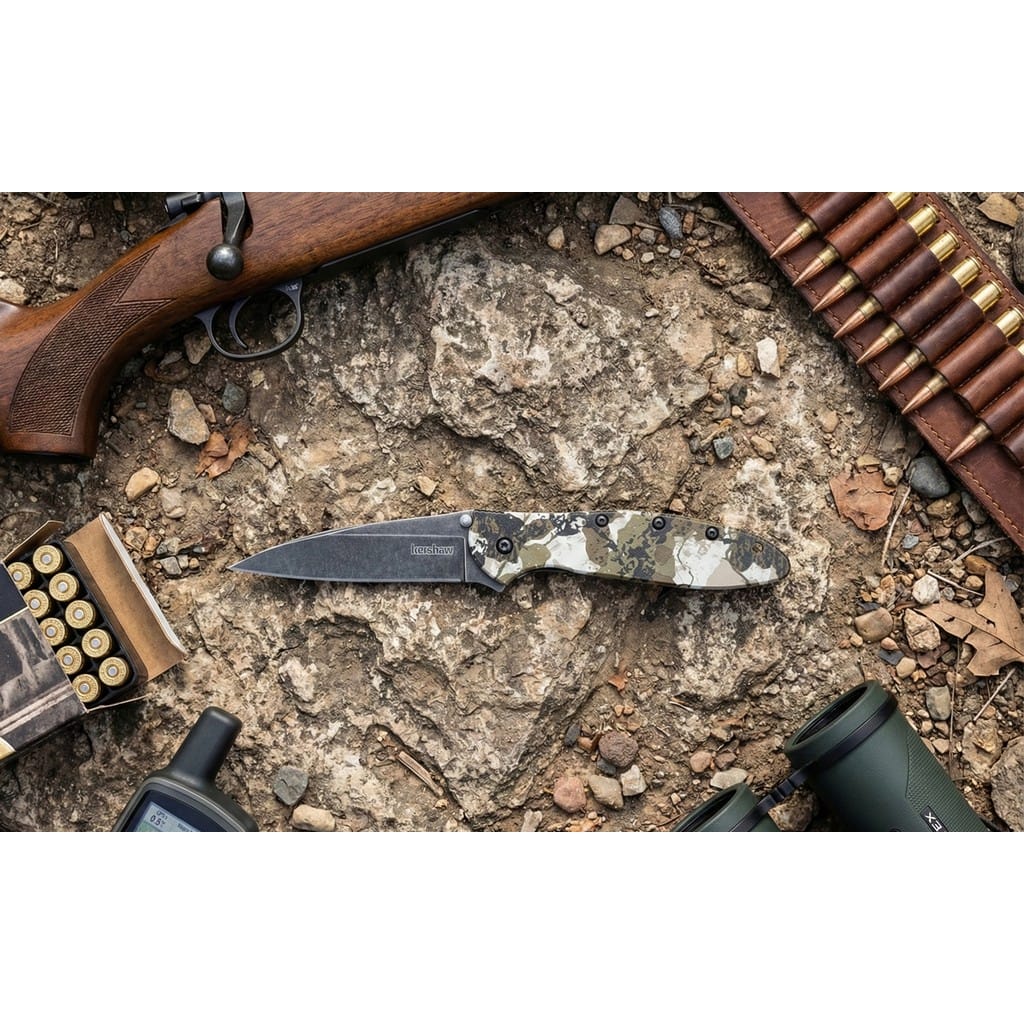 Leek Kings Camo, wyprodukowany w USA, to wyjątkowy folder zaprojektowany dla wszystkich miłośników leśnych przygód i polowań. Ze względu na optymalne rozmiary i niedużą wagę stanowi idealny wybór na model EDC. Powstał przy współpracy firmy Kershaw z wybitnym knifemakerem Kenem Onionem. Łączy nie tylko wysoką jakość wykonania, ale również nowoczesny i unikatowy design oraz funkcjonalność, jakiej oczekuje się od noża codziennego użytku. Głownia o profilu Wharncliffe została zrobiona ze szwedzkiej stali nierdzewnej Sandvik 14C28N o bardzo dobrej odporności na korozję i odpowiednio twardej. Wykończenie jej na czarno metodą Blackwash pozostawia nieregularną powłokę dobrze maskującą rysy i zadrapania powstające podczas eksploatacji. Do szybkiego rozłożenia narzędzia jedną ręką służy obustronny kołek lub dyskretny flipper. Wspomaganie wysuwania ostrza gwarantuje płynne działanie oraz sprawia, że folder jest gotowy do pracy w ułamku sekundy. Bezpieczeństwo użytkowania zapewnia blokada Liner Lock, a także niewielkie karbowanie na grzbiecie klingi dające stabilne wsparcie dla kciuka. Dodatkowe zabezpieczenie Tip Lock, znajdujące się na zakończeniu chwytu, chroni przed przypadkowym złożeniem się noża, gdy jest w użyciu. Delikatnie wyprofilowana aluminiowa rękojeść dobrze układa się w dłoni oferując pewny chwyt. Zdobi ją autentyczny wzór kamuflażu XK7 naniesiony przy wykorzystaniu nowoczesnej technologii, dzięki czemu jest trwały i doskonale odwzorowuje detale. Na zakończeniu znajduje się otwór na linkę umożliwiający przełożenie paracordu lub breloka ozdobnego. Konstrukcję uzupełnia dwupozycyjny klips mocujący do wygodnego przenoszenia narzędzia w kieszeni spodni lub przy wyposażeniu. Model 1660KC to idealny pomysł na prezent dla myśliwego, a także wszystkich amatorów survivalu.
