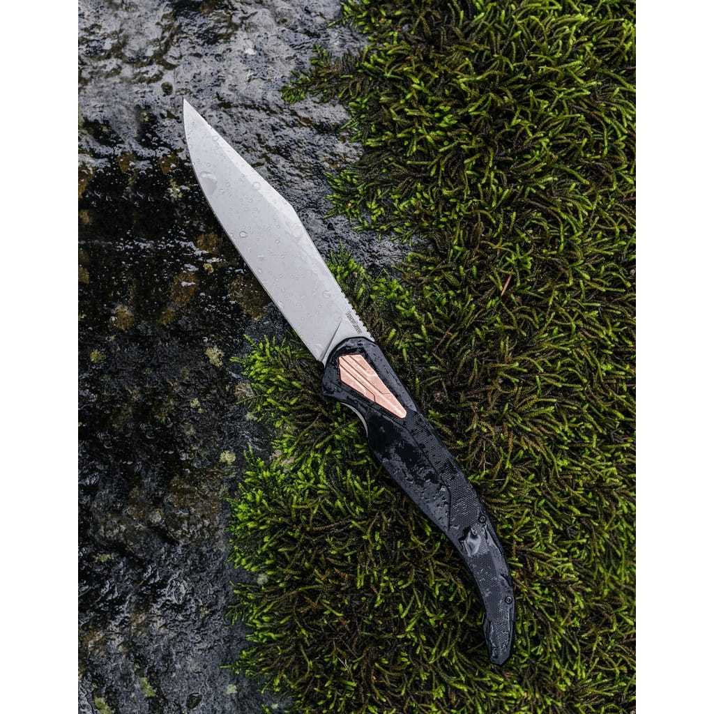 Do powstania modelu Strata zainspirowały firmę Kershaw hiszpańskie noże Navaja, które w XIX wieku zostały zaadaptowane przez mieszkańców jako defensywne narzędzia bojowe dla obywateli klasy robotniczej. Folder 2076 przekształca ten tradycyjny styl w nowoczesny design, który z powodzeniem może być używany do codziennych zadań. Szerokie ostrze Clip Point wykonano z wysokiej jakości stali narzędziowej D2, która długo utrzymuje właściwą ostrość i jest wytrzymała. Wykończono ją metodą Beadblast, dzięki której uzyskano matową powłokę. Nad bezpieczeństwem pracy czuwa solidna blokada Frame Lock, a także karbowany grzbiet głowni stanowiący stabilne podparcie dla kciuka. Szybkie i płynne rozłożenie noża jedną ręką w ułamku sekundy umożliwia łożyskowy systemem KVT (Kershaw Velocity Technology) przy wykorzystaniu dyskretnego flippera. Rękojeść to połączenie lekkiego tworzywa G10 o antypoślizgowej fakturze na jednej ze stron, ze stalą nierdzewną na drugiej. Całość odpowiednio wyprofilowano, tak aby zapewnić jak najwyższy komfort użytkowania. Ozdobne miedziane elementy na chwycie dodają charakteru konstrukcji. Całość dopełnia klips mocujący do wygodnego i dyskretnego przenoszenia foldera głęboko w kieszeni spodni lub przy wyposażeniu.