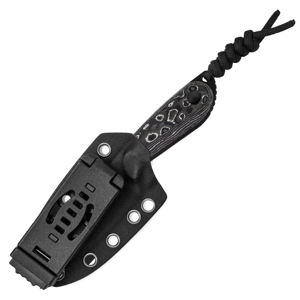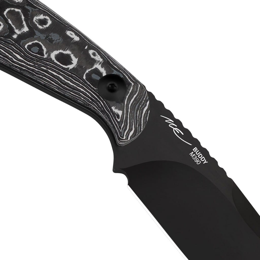 Kompaktowy, lekki i piękny - taki właśnie jest nóż z ostrzem stałym zaprojektowany dla firmy Kizer przez Maksima Epifantsev. Model charakteryzuje się konstrukcją full tang, co dodatkowo zwiększa jego wytrzymałość podczas pracy. Buddy idealnie sprawdzi się do lżejszych aktywności na świeżym powietrzu, gwarantując satysfakcjonujące użytkowanie. Ostrze o uniwersalnym profilu Drop Point zostało wykonane z wysokiej jakości, austriackiej stali nierdzewnej Bohler M390 oferującej doskonałą odpornością na korozję i ścieranie. Odpowiednia kompozycja wanadu, molibdenu i wolframu sprawia, że krawędź tnąca pozostaje ostra na stosunkowo długi czas. Głownię wykończono metodą Satin Brush, a następnie, w celu zabezpieczenia przed negatywnym działaniem czynników zewnętrznych, pokryto czarną i antyodblaskową powłoką DLC (Diamond Like Carbon) o twardości zbliżonej do diamentu. Mocno karbowany grzbiet klingi stanowi stabilne wsparcie dla kciuka, co pomaga przy precyzyjnych zadaniach. Rękojeść zrobiono z unikalnego materiału FAT Carbon, należącego do klasy premium, cechującego się niepowtarzalnym i eleganckim wyglądem. Na zakończeniu umieszczono otwór z zamocowanym brelokiem z paracordu, ułatwiającym chwytanie narzędzia. W zestawie znajduje się pochwa z kydexu wraz z funkcjonalnym mocowaniem typu Tek-Lok, dzięki któremu możemy bezpiecznie transportować nóż na pasku spodni, blisko ciała. Przelotki na krawędziach kabury oferują dodatkowe opcje montażu produktu do wyposażenia. Do kompletu dołączono również ściereczkę z mikrofibry, a całość zapakowano w czarne pudełko prezentowe. Firma Kizer współpracuje z projektantami z całego świata i skutecznie przekształca koncepcje w rzeczywistość. Wykorzystuje materiały pochodzące z USA i Japonii, aby dopracowanie każdego egzemplarza było na najwyższym poziomie. Posiada centrum badawczo-rozwojowe, a także linię przemysłową z nowoczesnymi i precyzyjnymi maszynami, które dostarczają funkcjonalność i niezawodność. Nie uznaje dróg na skróty, żadnych kompromisów, a każdy etap produkcji realizuje we właściwy i efektywny sposób.