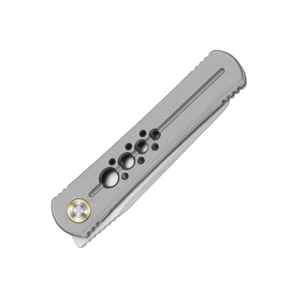 Kizer Feist 2 to nowoczesny nóż składany o kompaktowej budowie, należący do limitowanej edycji wyprodukowanej w ilości 200 sztuk. Wysoka jakość, precyzja i dopracowane detale to jego największe walory. Każdy egzemplarz po wewnętrznej stronie okładziny posiada nadrukowany indywidualny numer seryjny. Ograniczona dostępność to kolejna zaleta dla użytkowników poszukujących unikatowych perełek do swojej kolekcji. Ostrze o profilu Reverse Tanto zostało wykonane z austriackiej stali nierdzewnej klasy premium Bohler M390 charakteryzującej się doskonałą odpornością na korozję i ścieranie. Odpowiednia kompozycja wanadu, molibdenu i wolframu sprawia, że krawędź tnąca pozostaje ostra na stosunkowo długi czas. Wykończenie głowni metodą Stonewash pozostawia nieregularną powłokę dobrze maskującą rysy i zadrapania powstające podczas eksploatacji. Klingę osadzono na ceramicznych łożyskach kulkowych, która przy wykorzystaniu front flippera wysuwa się płynnie i gładko. Prosta obsługa jedną ręką zadowoli zarówno osoby prawo, jak i leworęczne. Karbowany grzbiet ostrza stanowi stabilne wsparcie dla kciuka, co pomaga przy zadaniach wymagających większej precyzji. Bezpieczeństwo pracy zapewnia niezawodny mechanizm Frame Lock blokujący narzędzie po rozłożeniu. Tytanową rękojeść zdobią okrągłe otwory oraz złote pierścienie wokół pivota. Konstrukcję dopełnia klips mocujący z tytanu do wygodnego przenoszenia noża w kieszeni spodni. W zestawie znajduje się miękki pokrowiec z zamykaniem na suwak, ściereczka z mikrofibry oraz zapasowe śrubki, a całość zapakowano w czarne pudełko prezentowe. Firma Kizer współpracuje z designerami z całego świata i skutecznie przekształca koncepcje w rzeczywistość. Wykorzystuje komponenty pochodzące z USA i Japonii, aby dopasowanie i wykończenie każdego egzemplarza było na najwyższym poziomie. Posiada centrum badawczo-rozwojowe, a także linię przemysłową z zaawansowanymi i precyzyjnymi maszynami dostarczającymi wydajność i niezawodność. Nie uznaje dróg na skróty, żadnych kompromisów, a każdy etap produkcji wykonuje we właściwy i efektywny sposób.