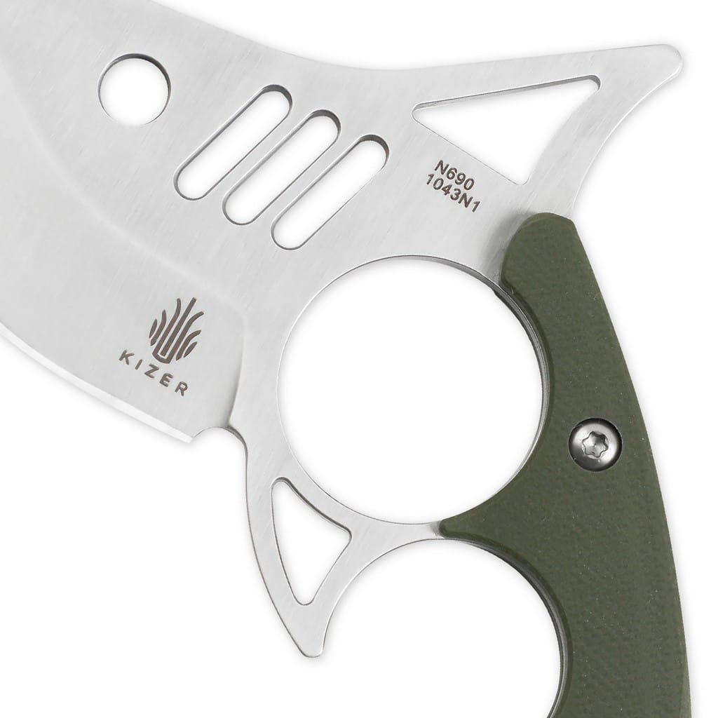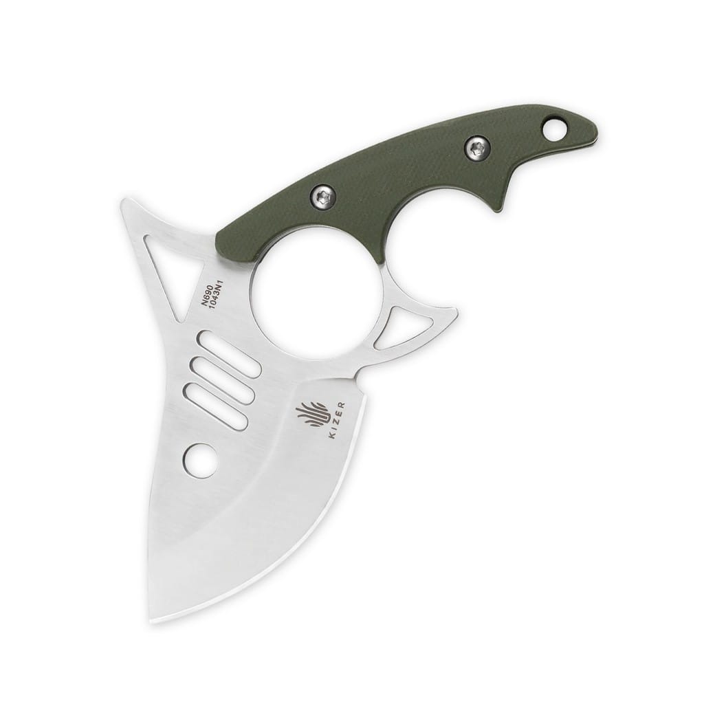 The Shark Tooth firmy Kizer to drapieżny i kompaktowy nóż zaprojektowany przez Eddiego Diaza z Machoblades do codziennego noszenia. Budową przypomina głowę rekina stąd też jego nazwa. Szerokie ostrze o charakterystyce Drop Point zostało wykonane ze stali nierdzewnej klasy premium Bohler N690 długo trzymającej właściwą ostrość. Wykończenie głowni metodą Satin pozostawia drobne ryski lekko matujące powierzchnię. Bezpieczeństwo pracy zapewnia obustronny jelec chroniący dłoń przed jej przypadkowym zsunięciem się na krawędź tnącą. Do stalowej konstrukcji przymocowano śrubami okładziny z antypoślizgowego tworzywa G10 w zielonym kolorze. Ich ergonomiczne wyprofilowanie w połączeniu z pierścieniem na palec gwarantuje pewny chwyt i zapewnia świetną kontrolę nad nożem. Wagę konstrukcji minimalizują wycięcia na klindze, która dodają charakteru projektowi. Całość dopełnia otwór na linkę typu paracord co umożliwia stworzenie oplotu na nadgarstek. W zestawie znajduje się pochwa z tworzywa do wygodnego przenoszenia narzędzia na pasku oraz ściereczka z mikrofibry do jego czyszczenia. Produkt zapakowany w czarne pudełko prezentowe. Firma Kizer współpracuje z projektantami z całego świata i skutecznie przekształca koncepcje w rzeczywistość. Wykorzystuje materiały pochodzące z USA i Japonii, aby dopasowanie i wykończenie każdego egzemplarza było na najwyższym poziomie. Posiada centrum badawczo-rozwojowe, a także linię przemysłową z nowoczesnymi i precyzyjnymi maszynami, które dostarczają wydajność i niezawodność. Nie uznaje dróg na skróty, żadnych kompromisów, a każdy etap produkcji wykonuje we właściwy i efektywny sposób.