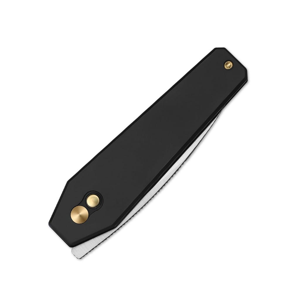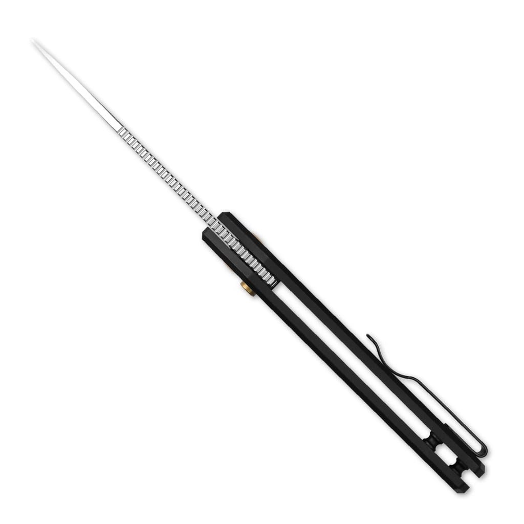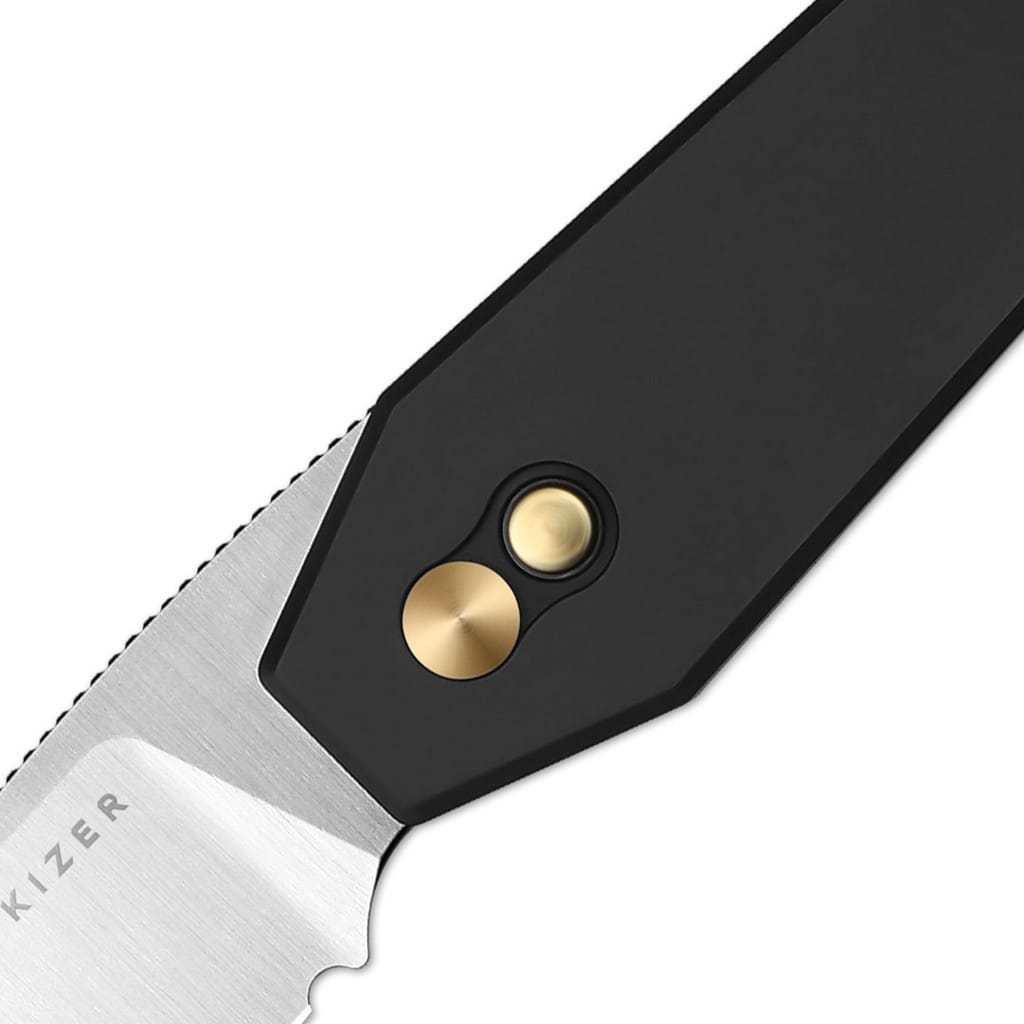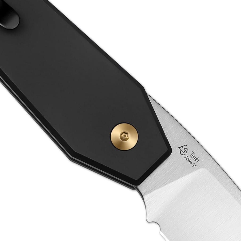 Tomb firmy Kizer to osobliwy model charakteryzujący się rękojeścią w kształcie trumny, której wnętrze skrywa linersy z wyciętym laserowo wzorem szkieletu. Nóż urzeka kreatywnością i oryginalnością wykonania, zachowując funkcjonalną formę zaprojektowaną do codziennego użytku. Ostrze o profilu Drop Point zrobiono z niemieckiej stali nierdzewnej Nitro-V wzbogaconej o azot i wanad. Pierwiastki te zwiększają twardość i deklarują wyjątkową wydajność krawędzi tnącej, a także odporoność na korozję. Wykończenie głowni metodą Satin pozostawia drobne ryski lekko matujące powierzchnię, dające efekt niedokładnego wypolerowania. Klingę osadzono na ceramicznych łożyskach kulkowych, która przy wykorzystaniu front flippera wysuwa się płynnie i gładko. Prosta obsługa jedną ręką zadowoli zarówno osoby prawo, jak i leworęczne. Dodatkowo folder można alternatywnie rozłożyć za pomocą intuicyjnego przycisku na rękojeści. Mocne karbowanie na grzbiecie ostrza stanowi stabilne wsparcie dla kciuka, co pomaga przy precyzyjnych pracach. Skuteczna blokada Button Lock chroni przed przypadkowym złożeniem się narzędzia, gdy jest w użyciu. Eleganckie okładziny chwytu z aluminium zdobią złote akcenty doskonale komponujące się z intensywną czernią rękojeści. Konstrukcję uzupełnia klips mocujący pozwalający na wygodne przenoszenie foldera w kieszeni spodni lub przy wyposażeniu. W zestawie znajduje się ściereczka z mikrofibry do czyszczenia narzędzia oraz zestaw zapasowych śrubek, a całość zapakowano w czarne pudełko prezentowe. Firma Kizer współpracuje z projektantami z całego świata i skutecznie przekształca koncepcje w rzeczywistość. Wykorzystuje materiały pochodzące z USA i Japonii, aby dopasowanie i wykończenie każdego egzemplarza było na najwyższym poziomie. Posiada centrum badawczo-rozwojowe, a także linię przemysłową z nowoczesnymi i precyzyjnymi maszynami dostarczającymi wydajność i niezawodność. Nie uznaje dróg na skróty, żadnych kompromisów, a każdy etap produkcji realizuje we właściwy i efektywny sposób.