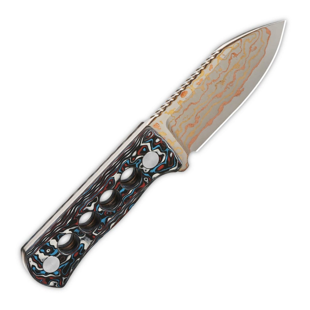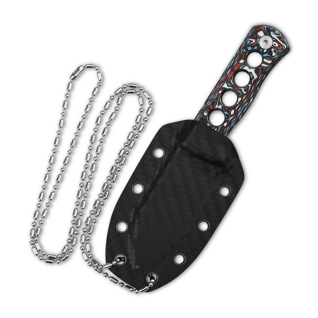 Canary firmy QSP Knives to mały i lekki nóż z ostrzem stałym o spektakularnym wyglądzie, cechujący się wysokim poziomem komponentów. Głownię o uniwersalnym profilu Drop Point wykonano ze stali damasceńskiej wzbogaconej o warstwę z miedzi i mosiądzu, tworzącą ciekawy wzór na jej powierzchni. Mocno karbowany grzbiet ostrza stanowi stabilne podparcie dla kciuka i ułatwia realizację zadań wymagających większej precyzji. Do stalowej konstrukcji full tang, zwiększającej wytrzymałość narzędzia, przytwierdzono śrubami okładziny z kolorowego włókna węglowego. Perforacje na rękojeści zmniejszają wagę i dodają charakteru całości. W zestawie znajduje się pochwa z kydexu wyposażona w srebrny łańcuszek kulkowy, pozwalający na wygodne przenoszenie noża na karku. Canary to świetny wybór na model EDC, który sprawdzi się zarówno w pracy, na mieście, jak i w terenie podczas aktywności na świeżym powietrzu. Nazwa firmy QSP to akronim od słów Quality, Service, Price odzwierciedlający zaangażowanie producenta w te podstawowe wartości. Produkty cechują się topowymi materiałami, mistrzowskim wzornictwem i perfekcyjnym wykończeniem, a wszystko to w rozsądnej cenie. Każdy egzemplarz jest rygorystycznie weryfikowany na etapie końcowym, co zapewnia najwyższą jakość.