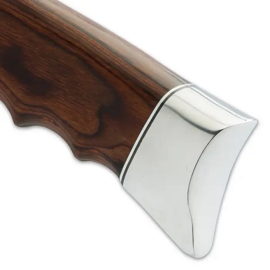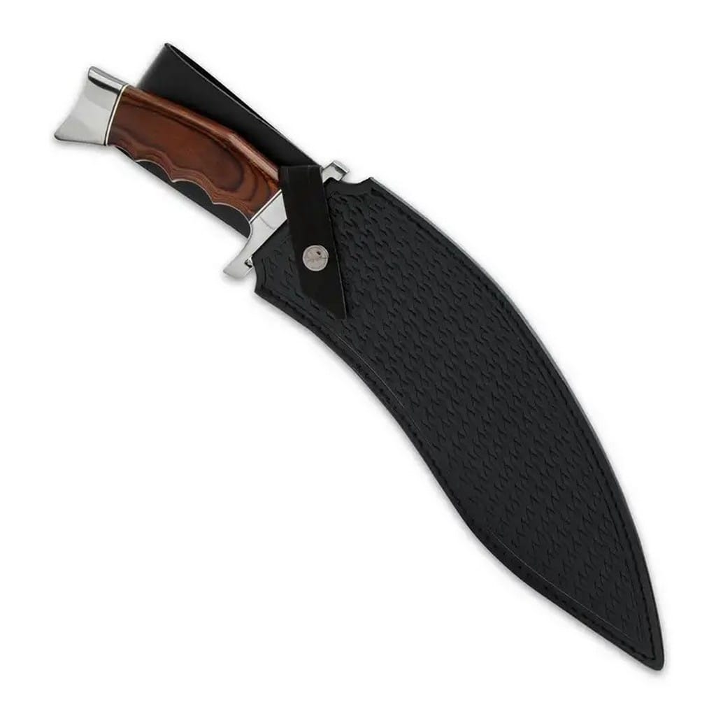 GH5095 to potężne i eleganckie kukri niczym bestia zaprojektowane przez Gila Hibbena - znaną i cenioną postać zyskującą coraz większą popularność wśród miłośników i kolekcjonerów ostrych narzędzi. Model posiada ostrze wykonane ze stali nierdzewnej 5Cr15MoV, które zostało wypolerowane na lustro co przekłada się na znakomity efekt wizualny. Duży, obustronny jelec zabezpiecza dłoń przed jej przypadkowym zsunięciem się na krawędź tnącą. Rękojeść o odpowiednim wyprofilowaniu pod zaciskającą się dłoń użytkownika zrobiono z impregnowanego drewna w intensywnym brązowym kolorze. Całość dopełnia stalowa głowica o lustrzanym wykończeniu. W zestawie znajduje się skórzana pochwa, dzięki które użytkownik może wygodnie transportować kukri na pasku. Jest to narzędzie o wszechstronnym zastosowaniu, które doskonale sprawdzi się w terenie oraz do prac w ogrodzie.