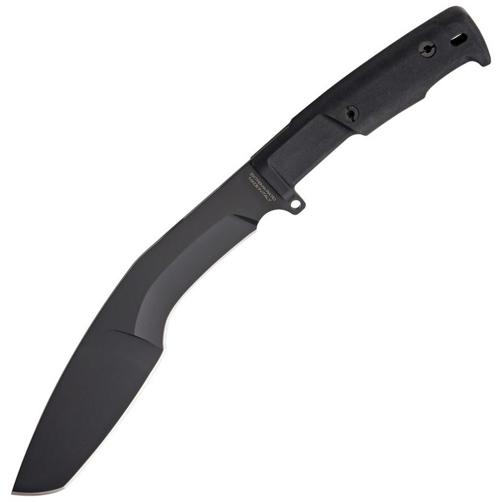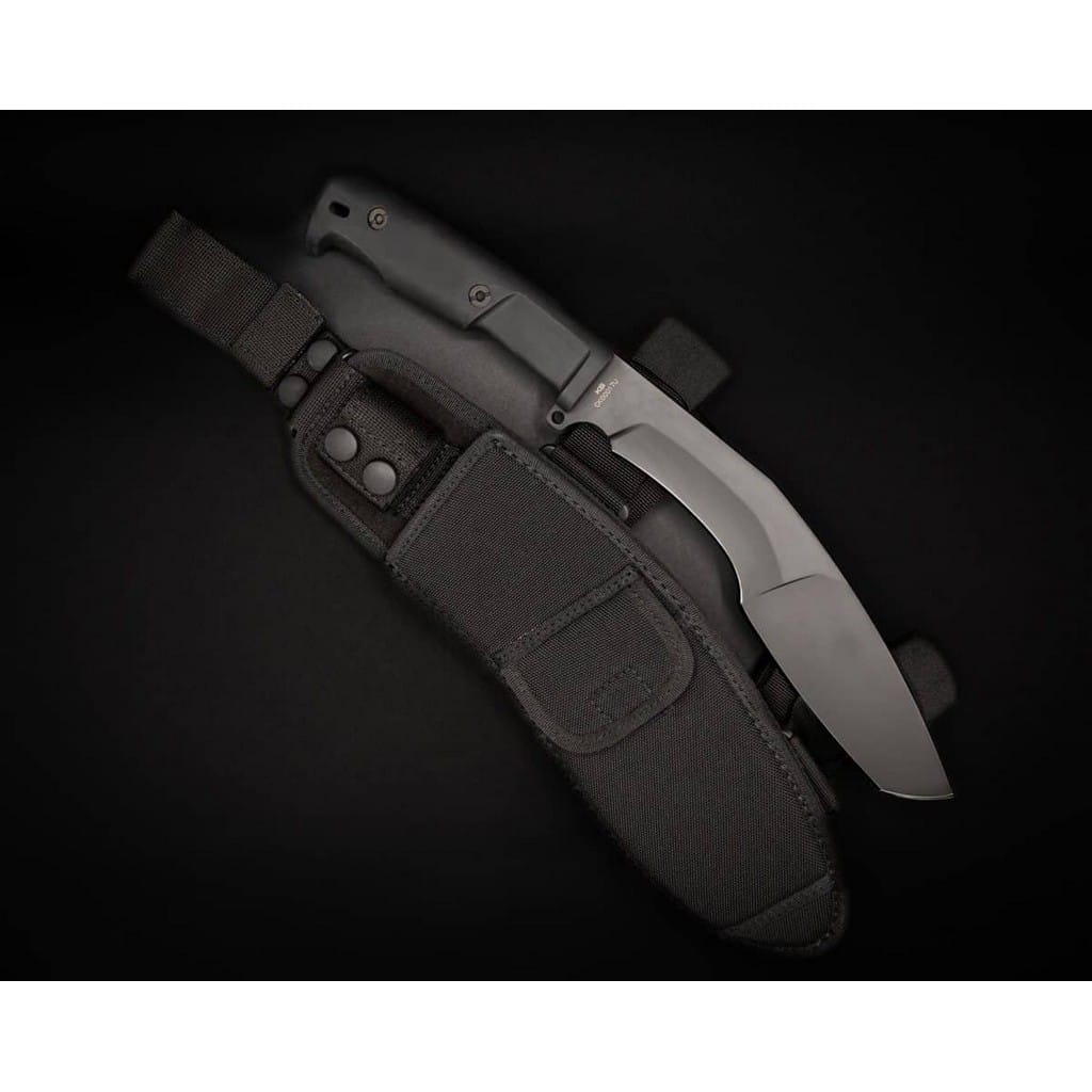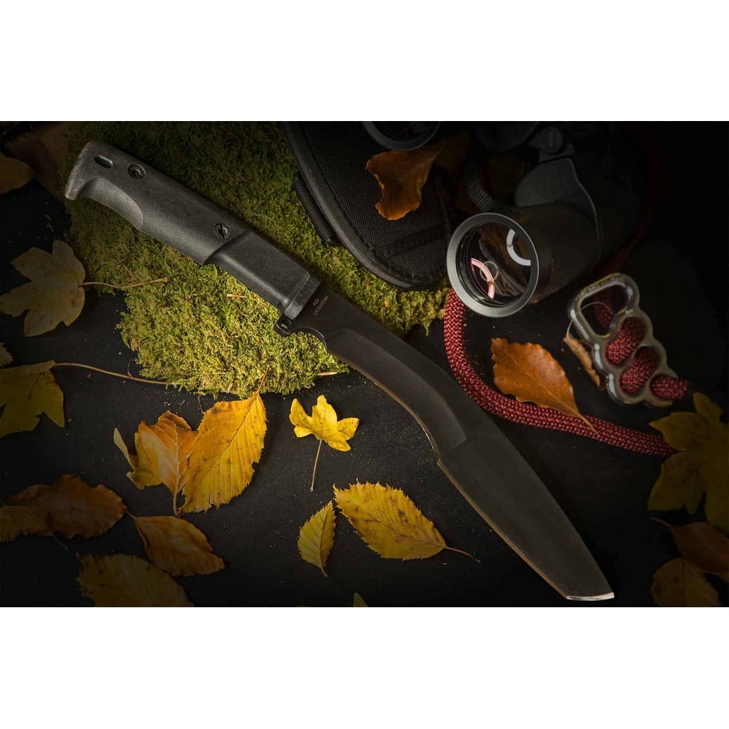 Model KS firmy Extrema Ratio to kompaktowa maczeta łącząca nowoczesny styl z antyczną koncepcją. Zaprojektowana w oparciu o kukri, tradycyjny nóż wojowniczego ludu Ghurków, pochodzących z Nepalu, który wywodzi się ze starożytnych greckich mieczy w kształcie sierpów. Model posiada odpowiednio wyważoną i wytrzymałą konstrukcję, dlatego idealnie sprawdzi się jako narzędzie do wymagających zadań w terenie. Bez problemu przenika przez drewno oraz tnie uporczywą roślinność. Grubą na ponad sześć milimetrów głownię wykonano z austriackiej stali nierdzewnej Bohler N690 charakteryzującej się wysoką odpornością na korozję i długim trzymaniem ostrości. W celu zabezpieczenia jej przed zarysowaniami i negatywnym działaniem czynników zewnętrznych pokryto ją czarną i antyodblaskową powłoką MIL-C-13924. Bezpieczeństwo użytkowania zapewnia jelec chroniący palce przed ich przypadkowym zsunięciem się na krawędź tnącą. Rękojeść z termoplastycznego elastomeru o nazwie Forprene gwarantuje doskonałą ergonomię chwytu świetnie dopasowując się do dłoni, nawet gdy jest ona w rękawicy. Cechuje się niewrażliwością na chemikalia oraz ekstremalne temperatury, co pozwala jej przechodzić rygorystyczne testy NATO. Całość dopełnia otwór umożliwiający zamocowanie linki i stworzenie oplotu na nadgarstek. W zestawie znajduje się wielofunkcyjna pochwa z odpornego na przetarcia nylonu, kompatybilna z systemem Molle. Umożliwia ona wygodne transportowanie maczety w pozycji pionowej przy pasie lub wyposażeniu. Dodatkowo posiada kieszonkę na drobne akcesoria oraz dwie taśmy do mocowania całości do uda. Extrema Ratio to włoska manufaktura z siedzibą w Prato, w regionie Toskanii. Firma od 1997 roku mistrzowsko projektuje niesamowicie mocne noże taktycznie i myśliwskie, które nie mają sobie równych w przemyśle militarnym. Produkcja opiera się jedynie na wysokiej jakości materiałach i najnowocześniejszych technologiach. Co w połączeniu z tradycyjnym rzemiosłem i ręcznym wykończeniem każdego egzemplarza tworzy produkt spełniający najostrzejsze normy wojskowe.
