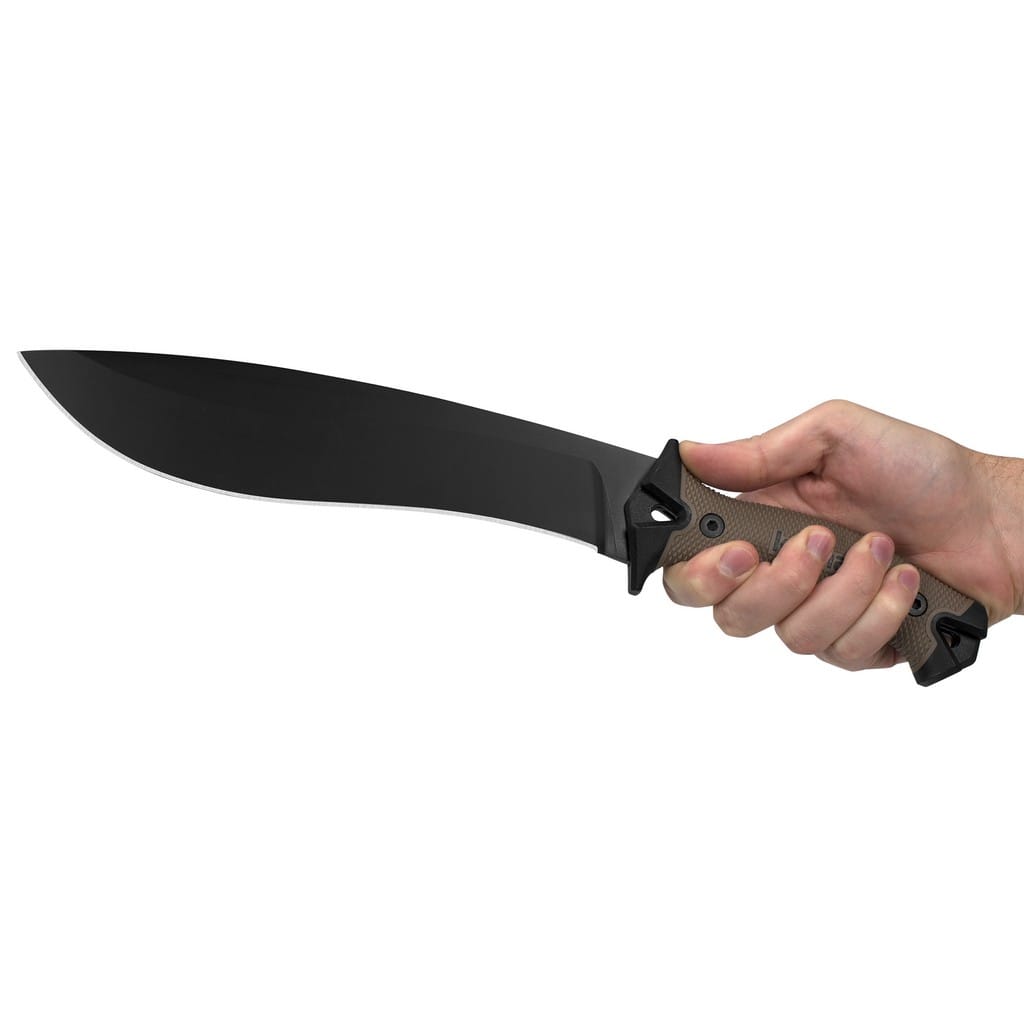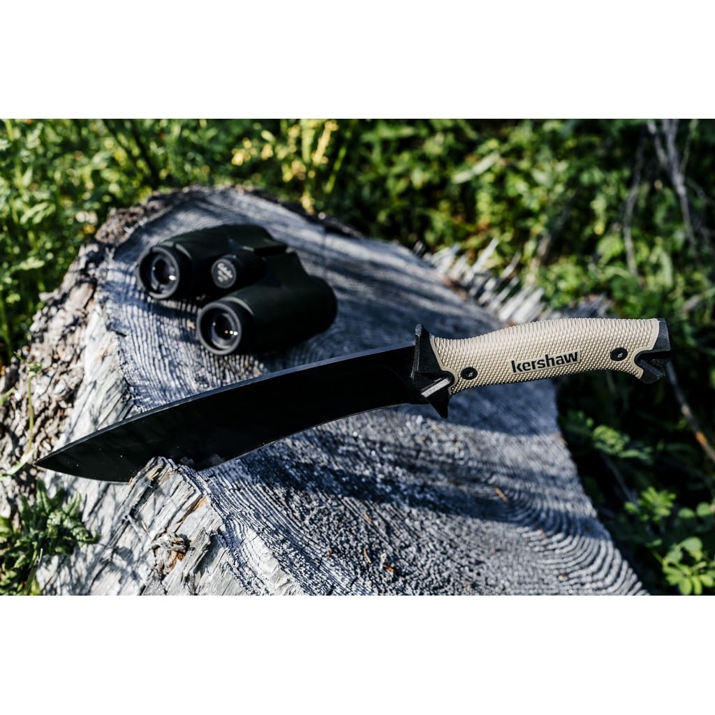 Camp 10 to popularna maczeta survivalowa firmy Kershaw zaprojektowana w jasnobrązowej kolorystyce. Kompaktowe rozmiary ułatwiają jej transportowanie w czym pomaga dołączona pochwa wykonana z nylonu wzmocnionego włóknem szklanym. Możemy z łatwością zamocować ją na nodze, przy pasie lub wyposażeniu za pomocą taśm, które posiada. Model wykonano z jednego kawałka stali węglowej 65Mn, dzięki czemu doskonale nadaje się do ciężkiej i wymagającej pracy, a gdy krawędź tnąca ulegnie stępieniu łatwo i szybko ponownie przywrócimy jej ostrość. Głownia pokryta proszkowo czarną farbą sprawdzi się nawet w najbardziej ekstremalnych warunkach oraz ochroni przed korozją i wyeliminuje odbijanie światła. Gumowa rękojeść nie tylko redukuje zmęczenie dłoni podczas długotrwałej pracy ale także amortyzuje drgania przenoszone przez klingę. Bezpieczeństwu pracy sprzyja obustronny jelec, który zabezpiecza rękę przed zsunięciem się na ostrze. Dla większej użyteczności maczeta posiada dwa otwory w uchwycie pozwalające na przełożenie linki i jej wszechstronne przenoszenie. Camp 10 idealnie sprawdzi się w lesie, przy pracach ogrodowych jak również do innych aktywności outdoorowych.