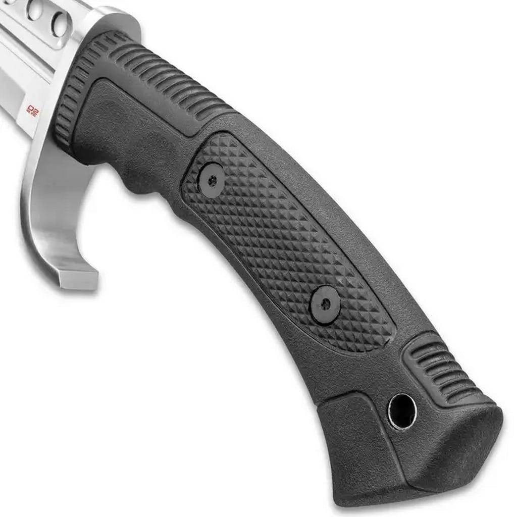 Miecz Spartan firmy United Cutlery to wyjątkowe uzupełnienie taktycznej linii Honshu, która posiada w swojej kolekcji solidne narzędzia bojowe. Ostrze o satynowym wykończeniu wykonane z niewiarygodnie twardej i wytrzymałej stali narzędziowej D2 wyposażono w podłużne zbrocze oraz cztery nowoczesne otwory zmniejszające wagę konstrukcji. Nad bezpieczeństwem pracy czuwa duży jelec chroniący dłoń przed jej zsunięciem się na krawędź tnącą. Wyprofilowana rękojeść z antypoślizgowego tworzywa TPR zapewnia komfort użytkowania oraz gwarantuje pewny chwyt i daje dobrą przyczepność do ręki, a także pełną kontrolę nad narzędziem. Na jej zakończeniu znajduje się otwór do zamocowanie linki typu paracord i stworzenia oplotu na nadgarstek. Do zestawu dołączono również skórzaną pochwę, dzięki której możemy wygodnie przenosić miecz blisko ciała na pasku.