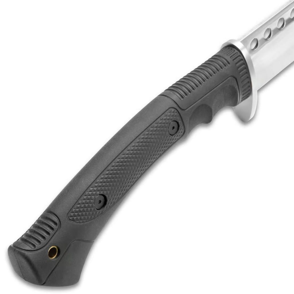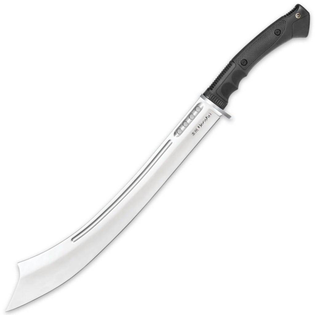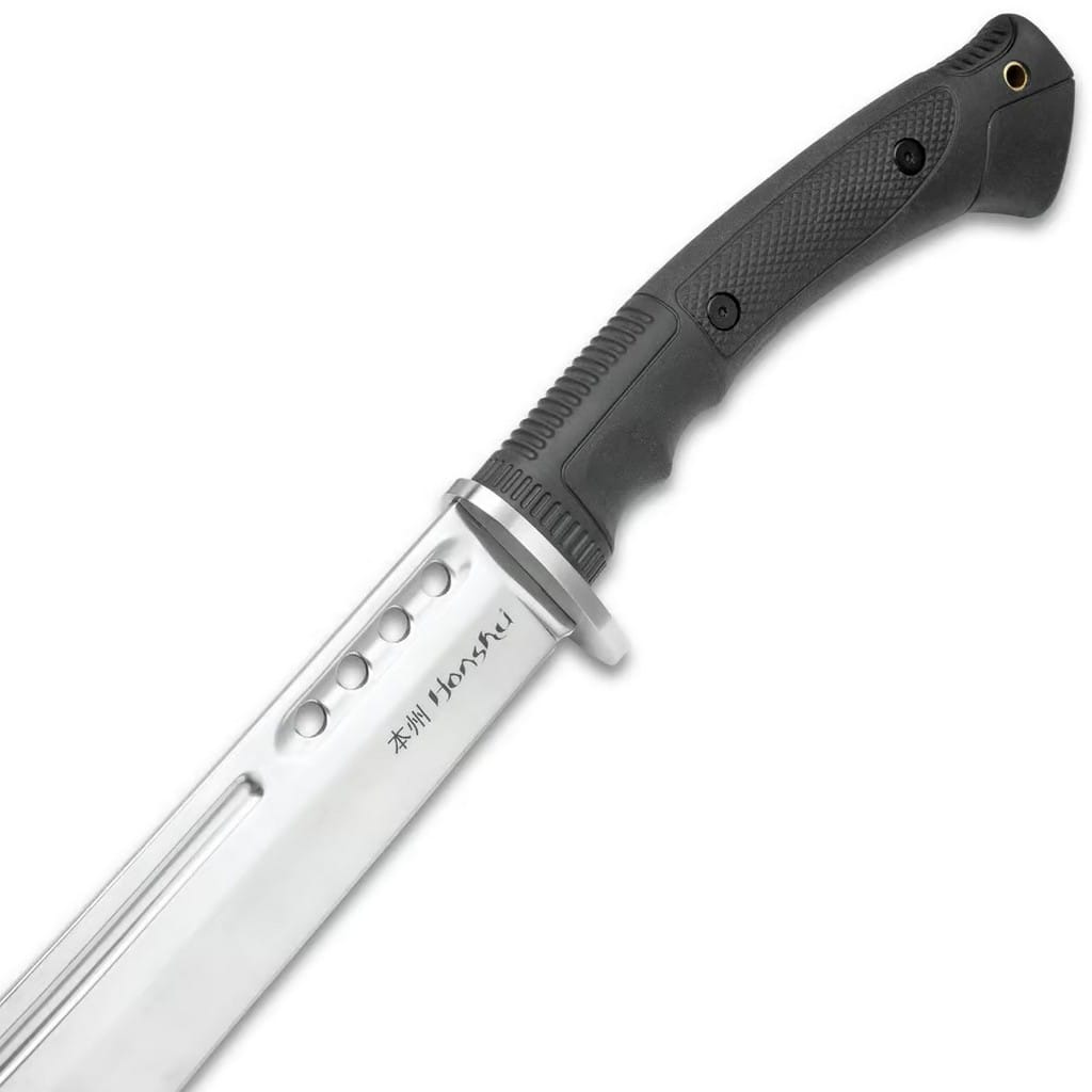 Miecz o nowoczesnym wyglądzie należący do wyjątkowej linii Honshu firmy United Cutlery. Stanowi obowiązkową pozycję do kolekcji wyróżniającą się eleganckim i subtelnym designem. Klinga została wykonana ze stali węglowej 1065 odpornej na wykruszenia i pęknięcia. Wykończenie jej metodą Satin pozostawia drobne ryski lekko matujące powierzchnię, co daje efekt niedokładnego wypolerowania. Bezpieczeństwo pracy zapewnia jelec chroniący palce przed ich przypadkowym zsunięciem się na krawędź tnącą i skaleczeniem. Rękojeść z antypoślizgowego tworzywa gwarantuje dobrą przyczepność do dłoni i komfortowy chwyt w każdych warunkach. Na zakończeniu znajduje się otwór na linkę umożliwiający przełożenie paracordu i stworzenie oplotu na nadgarstek. Dodatkowo do zestawu dołączono skórzaną pochwę do wygodnego transportowania narzędzia na pasku, blisko ciała.