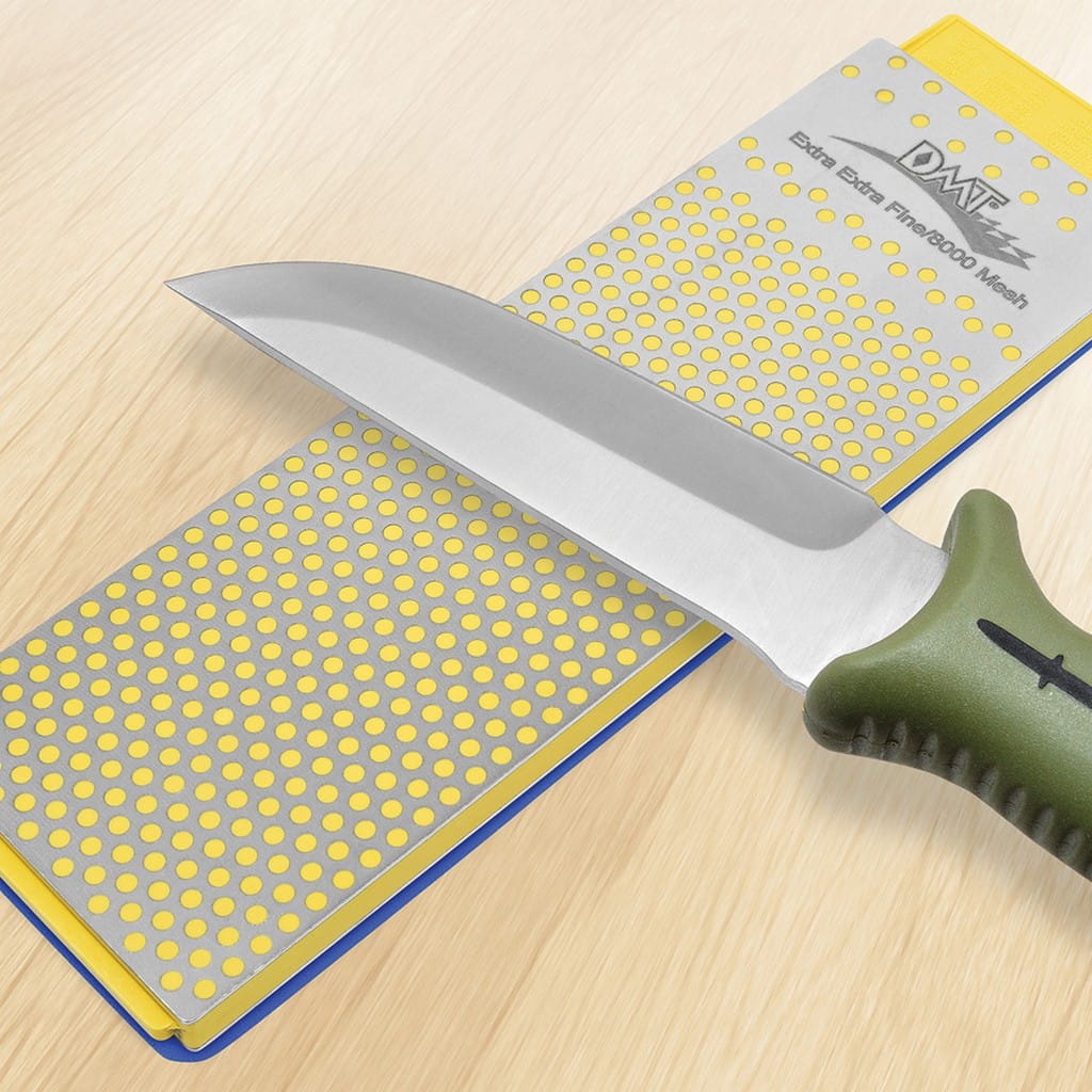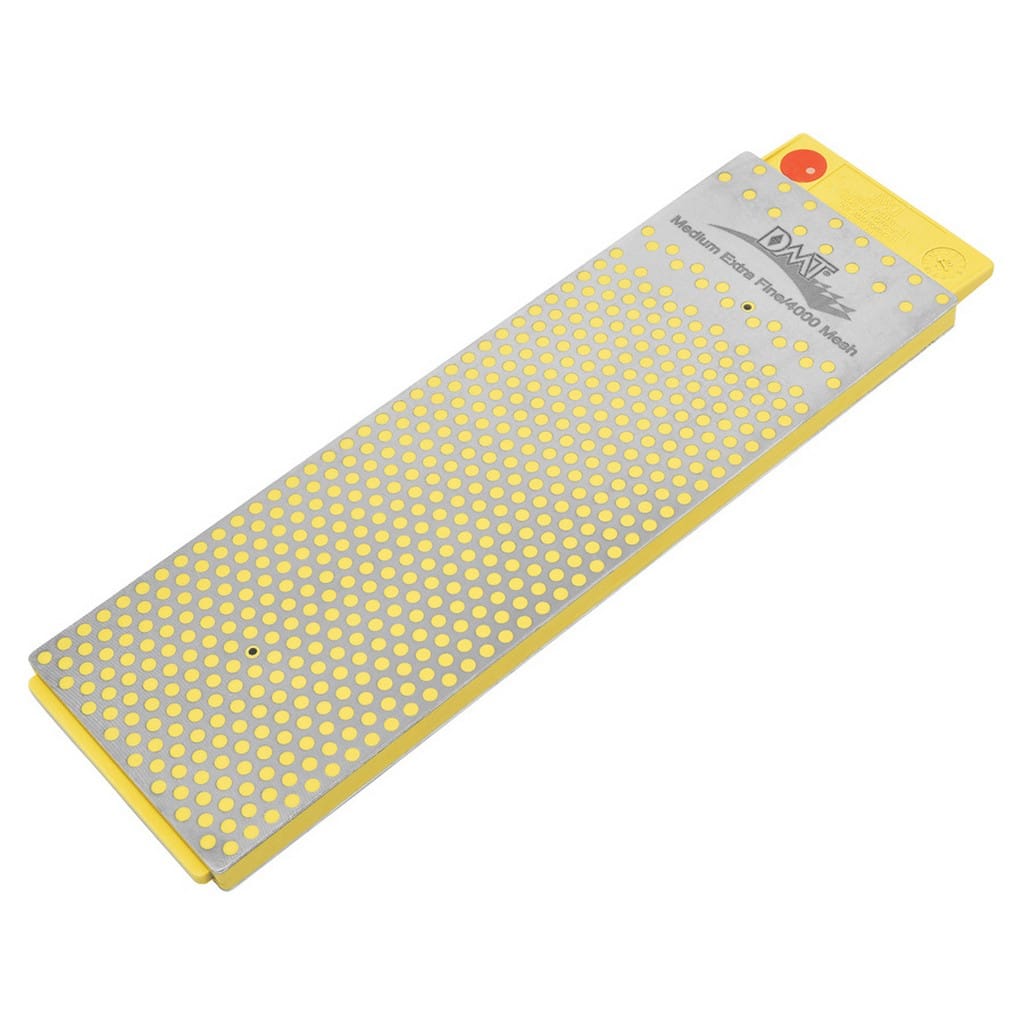 WM8EEME to innowacyjny, dwustronny kamień diamentowy amerykańskiej firmy DMT. Model należy do serii DuoSharp Plus charakteryzującej się perforowaną powierzchnią płytki stalowej, na którą nałożone zostały diamenty monokrystaliczne, wytwarzane w wyniku zastrzeżonego procesu dostarczającego niemal idealną spójność wielkości ziarna. Otwory mają za zadanie wyłapywać metalowe resztki powstające podczas pracy, co zapewnia ciągły i czysty kontakt krawędzi ostrzącej z kamieniem. W porównaniu do tańszych odpowiedników, wykonanych z diamentu polikrystalicznego, produkty DMT są zdecydowanie bardziej odporne na zużycie. Ostrzałka posiada również fragment ciągłej powierzchni do małych i miniaturowych narzędzi. Zastosowanie dwóch typów ziarnistości w jednej osełce czyni z niej wszechstronny model i pozwala zaoszczędzić miejsce podczas przechowywania. Płytka oferuje gradację Extra Fine służącą do ostatecznego wygładzania i uzyskania ostrości brzytwy oraz Extra Extra Fine do perfekcyjnego wypolerowania krawędzi tnącej. Stanowi nie lada gratkę dla hobbystów, którzy nie są w stanie zadowolić się tradycyjnym wykończeniem ostrza. Nie wymaga stosowania żadnych olejków, które brudzą wszystko wokół, jest niezwykle prosta i wygodna w użyciu. Możemy ostrzyć nią na sucho lub przy użyciu niewielkiej ilości wody każdy rodzaj stali, nawet tej najtwardszej. Wytrzymała konstrukcja gwarantuje długie lata wydajnego ostrzenia. W zestawie znajduje się niebieska mata antypoślizgowa zapobiegająca przesuwaniu się kamienia podczas pracy. Model zda egzamin zarówno w kuchni, jak i w warsztacie do noży o różnorakim przeznaczeniu, a także do toporków, siekier, maczet lub innych dużych narzędzi. Firma DMT to rozpoznawalny, światowy lider produkujący ostrzałki diamentowe od 1976 roku. W jej ofercie znajdziemy szeroki wybór modeli ostrzących, spełniających oczekiwania wymagających użytkowników, dla których niezawodność i trwałość są zawsze na pierwszym miejscu.