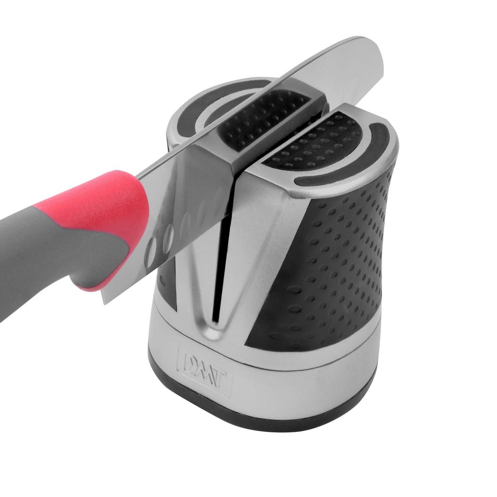 SIMPLE-Sharp to propozycja ostrzałki kuchennej zaprojektowanej przez renomowaną firmę DMT - światowego lidera w produkcji diamentowych kamieni ostrzących. Produkt posiada owalna obudowę o antypoślizgowej podstawie, która zapobiega przemieszczaniu się podczas użytkowania. Gumowane boki zapewniają dobry chwyt nawet gdy nasza dłoń jest mokra. Obsługa modelu jest bardzo prosta, wystarczy umieścić nóż w szczelinie i zaczynając od miejsca przy rękojeści przesuwać ostrze w kierunku czubka. Czynność należy powtórzyć około 5-6 razy. Gradacja Fine doskonale sprawdzi się do szybkiego przywrócenia ostrości lekko stępionym nożom, a wysokiej jakości wbudowane kamienie diamentowe gwarantuje długie lata wydajnej i niezawodnej pracy. Zaletą ostrzałki jest to, że nie wymaga stosowania żadnych olejków oraz fakt, że obie krawędzie tnące są ostrzone jednocześnie.