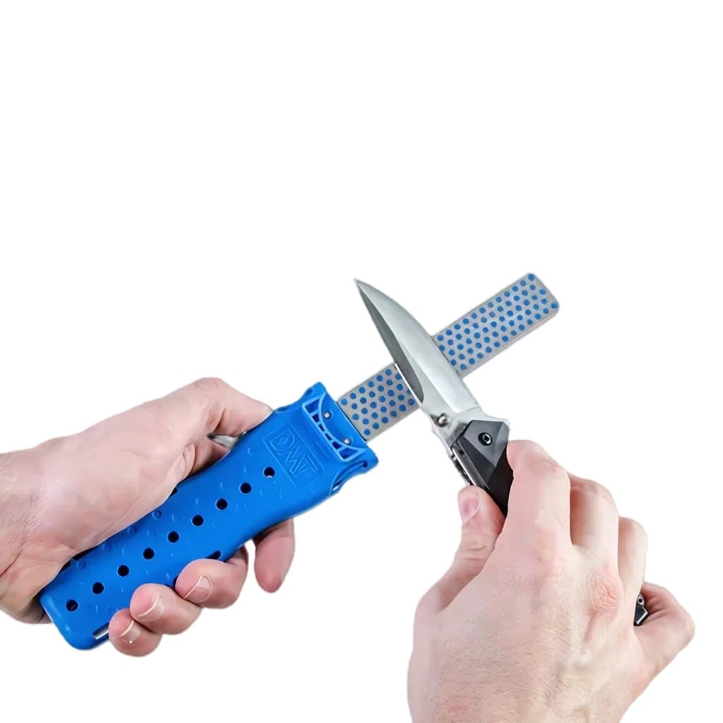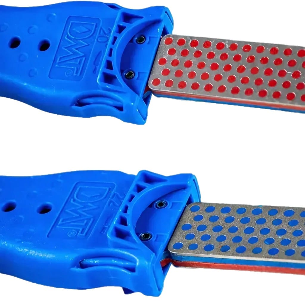 DoubleFlip to kompaktowa ostrzałka należąca do serii EdgeSharp amerykańskiej firmy DMT. Model charakteryzuje się niebieską obudową, która pewnie leży w dłoni podczas pracy. Element ostrzący to płaski, dwustronny kamień diamentowy o dwóch różnych ziarnistościach. Gradacja Coarse szybko przywraca ostrość tępym krawędziom przygotowując je do dalszego szlifowania. Fine na drugiej stronie stanowi uniwersalną gradację do codziennego ostrzenia. Dodatkowo wbudowane prowadnice pozwalają na ostrzenie pod kątem 20° i 22° w zależności od indywidualnych potrzeb. Kamień posiada perforowaną powierzchnię płytki stalowej, na którą nałożone zostały diamenty monokrystaliczne. Otwory mają za zadanie wyłapywać metalowe resztki powstające podczas użytkowania, co zapewnia ciągły i czysty kontakt krawędzi ostrzącej z kamieniem. W porównaniu do tańszych odpowiedników, wykonanych z diamentu polikrystalicznego, produkty DMT są zdecydowanie bardziej odporne na zużycie. Model nie wymaga stosowania żadnych olejków, które brudzą wszystko wokół, jest niezwykle prosty i wygodny w użyciu oraz łatwy w czyszczeniu. Możemy ostrzyć na sucho lub przy użyciu niewielkiej ilości wody każdy rodzaj stali, nawet tej najtwardszej. Składana konstrukcja oszczędza miejsce oraz ułatwia przechowywanie. Całość dopełnia otwieracz do butelek. Firma DMT to rozpoznawalny, światowy lider produkujący ostrzałki diamentowe od 1976 roku. W jej ofercie znajdziemy szeroki wybór modeli ostrzących, spełniających oczekiwania wymagających użytkowników, dla których niezawodność i trwałość są zawsze na pierwszym miejscu.