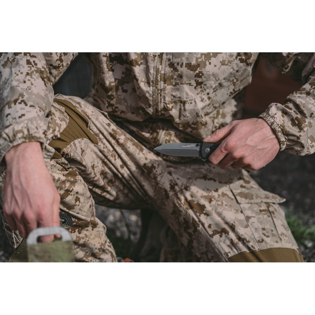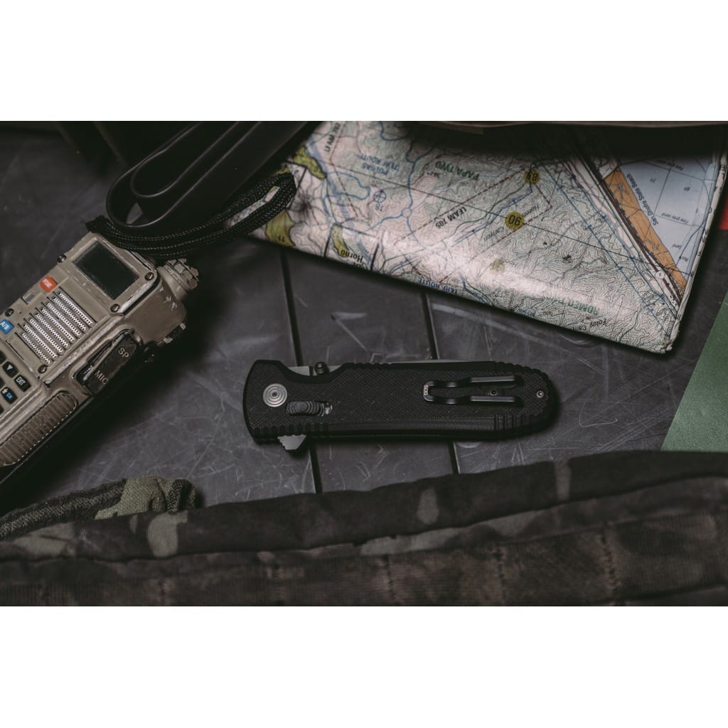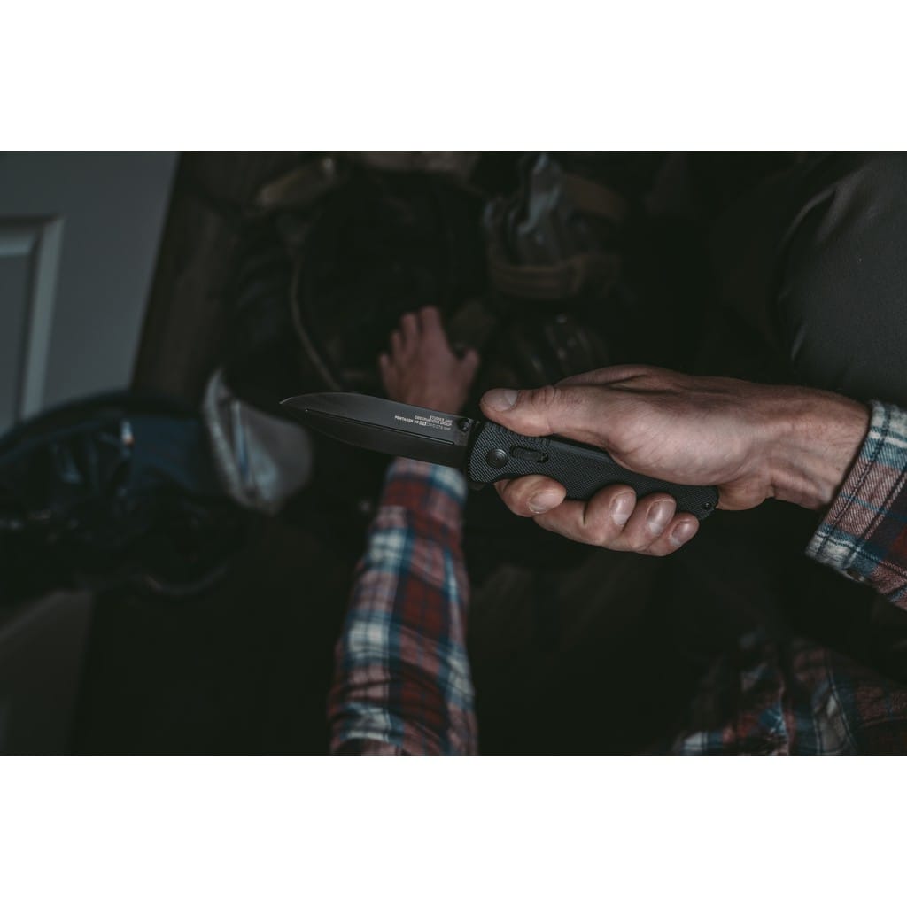 Wersja LTE to model lżejszy o 35% od noża Pentagon XR, który jako pierwszy został stworzony przez amerykańską firmę Sog. Tym razem producent zastosował rozwiązanie redukujące wagę foldera poprzez umieszczenie linersów z włókna węglowego. Pentagon XR LTE posiada ostrze o profilu Spear Point, charakteryzujące się bardzo dobrymi zdolnościami penetrującymi. Głownię wykonano ze stali nierdzewnej klasy premium CRYO CTS XHP poddanej kriogenicznej obróbce cieplnej, przez co zyskuje ona swoje optymalne właściwości. Klingę pokryto czarnym azotkiem tytanu odpornym na zarysowania, chroniącym przed korozją i odblaskami. Konstrukcję uzupełnia lekka rękojeść z wytrzymałego tworzywa G10 w czarnym kolorze, o antypoślizgowej fakturze oraz wyprofilowaniu pod palec. Wszystko to zapewnia bardzo dobrą przyczepność do dłoni i gwarantuje pewny chwyt bez względu od panujących warunków zewnętrznych. Kolejną wartością dodaną noża jest jego karbowana krawędź poprawiająca kontrolę nad narzędziem. Folder charakteryzuje się innowacyjnym systemem blokującym XR pozwalającym na rozłożenia go jedną ręką na trzy różne sposoby. Przy pomocy flippera, pełniącego jednocześnie funkcję jelca, obustronnego kołka lub suwaka umieszczonego na rękojeści. W zależności od indywidualnych preferencji i przyzwyczajeń użytkownik ma do wyboru najlepszą dla siebie z metod. Całość dopełnia dwupozycyjny klips mocujący umożliwiający wygodne przenoszenie noża w kieszeni spodni lub przy wyposażeniu. Pentagon XR LTE to jeden z najlepszych folderów taktycznych do codziennego użytku, zaprojektowany dla profesjonalistów. Można polegać na nim w każdej, nawet trudnej i wymagającej sytuacji.