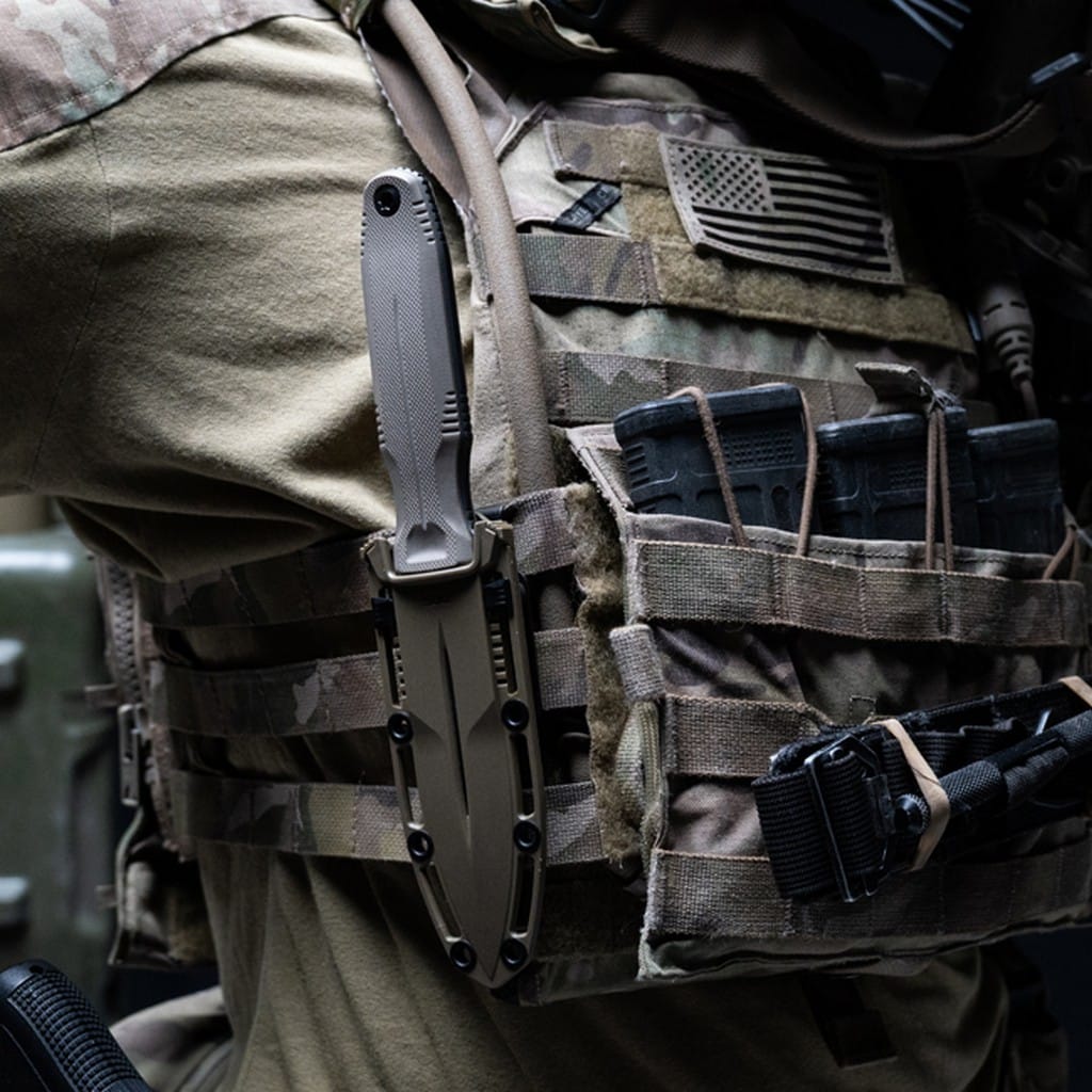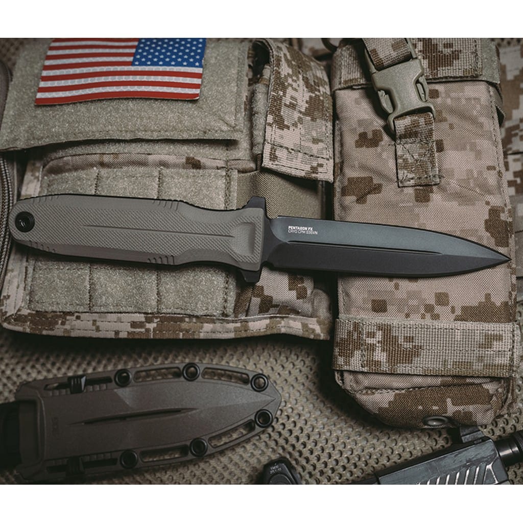 Pentagon FX amerykańskiej firmy Sog to pełnowymiarowy nóż z ostrzem stałym stworzony dla współczesnego wojownika. Model został zaprojektowany, aby sprostać wymaganiom różnych misji i przekraczać oczekiwania swoich użytkowników. W zestawie znajduje się pochwa z tworzywa GRN wyposażona w uniwersalne akcesoria, które umożliwiają kilka opcji przenoszenia w zależności od indywidualnych potrzeb i preferencji. Z ich pomocą zamocujemy narzędzie na kamizelce, plecaku czy na pasku przy spodniach. Kabura doskonale zabezpiecza nóż przed wypadnięciem oraz charakteryzuje się regulacją siły wyciągania ostrza. Głownię typu Spear Point o obustronnie naostrzonej krawędzi tnącej wykonano ze stali nierdzewnej klasy premium CRYO CPM S35VN i poddano kriogenicznej obróbce cieplnej, dzięki czemu zyskała swoje optymalne właściwości. Dodatek niobu i wanadu zwiększają plastyczność i wytrzymałość oraz odporność na korozję i ścieranie. Klingę pokryto czarnym azotkiem tytanu Titanium Nitride chroniącym przed odblaskami i zarysowaniami. Na uwagę zasługują również demontowalne okładziny rękojeści z tworzywa G10 o antypoślizgowej fakturze poprawiającej przyczepność do dłoni i gwarantujące pewny chwyt nawet w rękawicy. Po zdjęciu uchwytów uzyskujemy smuklejszy profil i zmniejszamy wagę konstrukcji, co może okazać się niezwykle użyteczne przy realizowaniu określonych zadań. Dodatkowo jelec zabezpiecza rękę przed jej przypadkowym zsunięciem się na ostrze zwiększając komfort pracy. Pentagon FX to świetny towarzysz na każde warunki, z którym rozpoczyna się prawdziwa przygoda, dlatego warto mieć go w swojej kolekcji.
