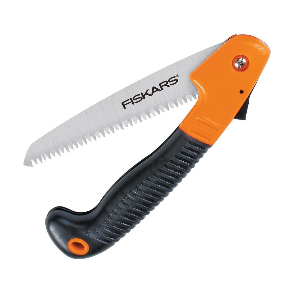 Składana piła marki Fiskars, należącej do renomowanego producenta Gerber. Narzędzie posiada ergonomicznie wyprofilowaną rękojeść zapewniającą dobry komfort użytkowania. Uchwyt został wykonany z tworzywa oraz dodatkowo powleczony czarną powłoką o właściwościach antypoślizgowych. Na zakończeniu znajduje się otwór umożliwiający zamocowanie linki typu paracord. Bezpieczeństwo pracy gwarantuje system blokujący ostrze, znajdujący się na grzbiecie narzędzia. Agresywne zęby na głowni umożliwiają skuteczne cięcie gałęzi i cienkich konarów drzew. Składana forma pozwala wygodnie spakować piłę do plecaka i zabrać ją w teren, gdy planujemy aktywność na świeżym powietrzu.