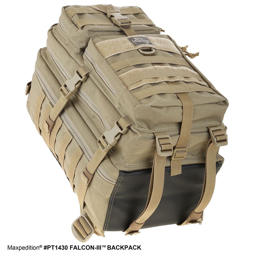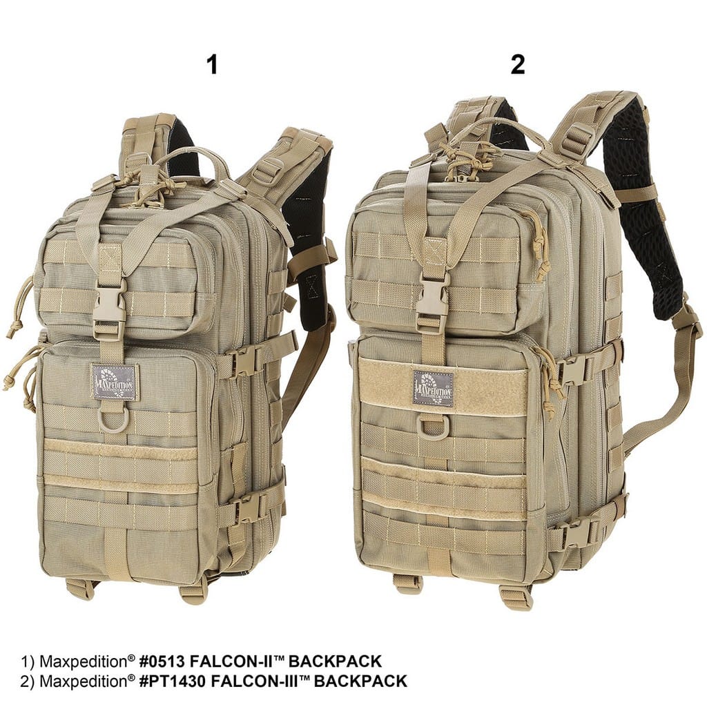 Falcon III to kolejna odsłona popularnego plecaka produkowanego przez firmę Maxpedition. Za sprawą swojej uniwersalnej budowy oraz odpowiedniej wielkości, która nadaje się zarówno na krótkie patrole czy też wyprawy w góry, plecak cieszy się dużym uznaniem wśród wojska i cywili. Jest niezwykle rozbudowany, posiada szereg kieszeni, schowków, a dodatkowo wewnątrz znajduje się także miejsce na 3 litrowy wkład hydracyjny. Noszenie plecaka nie sprawia dyskomfortu, gdyż zarówno plecy jaki i szelki od wewnątrz zostały wzmocnione miękką pianką, absorbującą uderzenia oraz odprowadzającą wilgoć. Szelki naramienne obszyto taśmami poziomymi Pals, a także wszyto D-Ringi, dzięki którym możemy na nich montować dodatkowe oporządzenie, jak również rurki od camelbaków, czy anteny od radiostacji. Po bokach plecaka znajdują się taśmy kompresyjne, które mogą służyć do troczenia śpiwora, karimaty lub do zmniejszenia objętości plecak. Spód od zewnętrznej strony został wzmocniony czarnym, antypoślizgowym tworzywem Hypalon, w celu zwiększenia wytrzymałości. Dla polepszenia komfortu i lepszej stabilizacji podczas marszu, Falcon III wyposażono także w pas piersiowy i biodrowy z możliwością regulacji, oba zapinane na klamry UTX-Duraflex. Model został przystosowany również dla strzelców, gdyż wnętrze środkowej komory obszyto panelem Velcro co umożliwia zamocowanie kabury CCW Holster oraz bezpieczne przenoszenie broni. Całość obszyta jest taśmami Molle przez co plecak może być rozbudowywany o dodatkowe oporządzenie. Falcon III to duży plecak o pojemności 32 litrów, który z pewnością sprawdzi się na dłuższych wyprawach, łączy w sobie pojemność z wygodą noszenia.