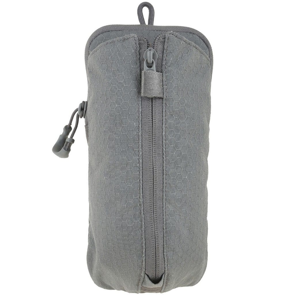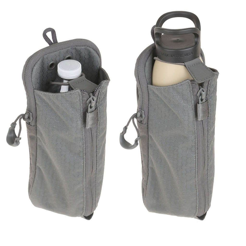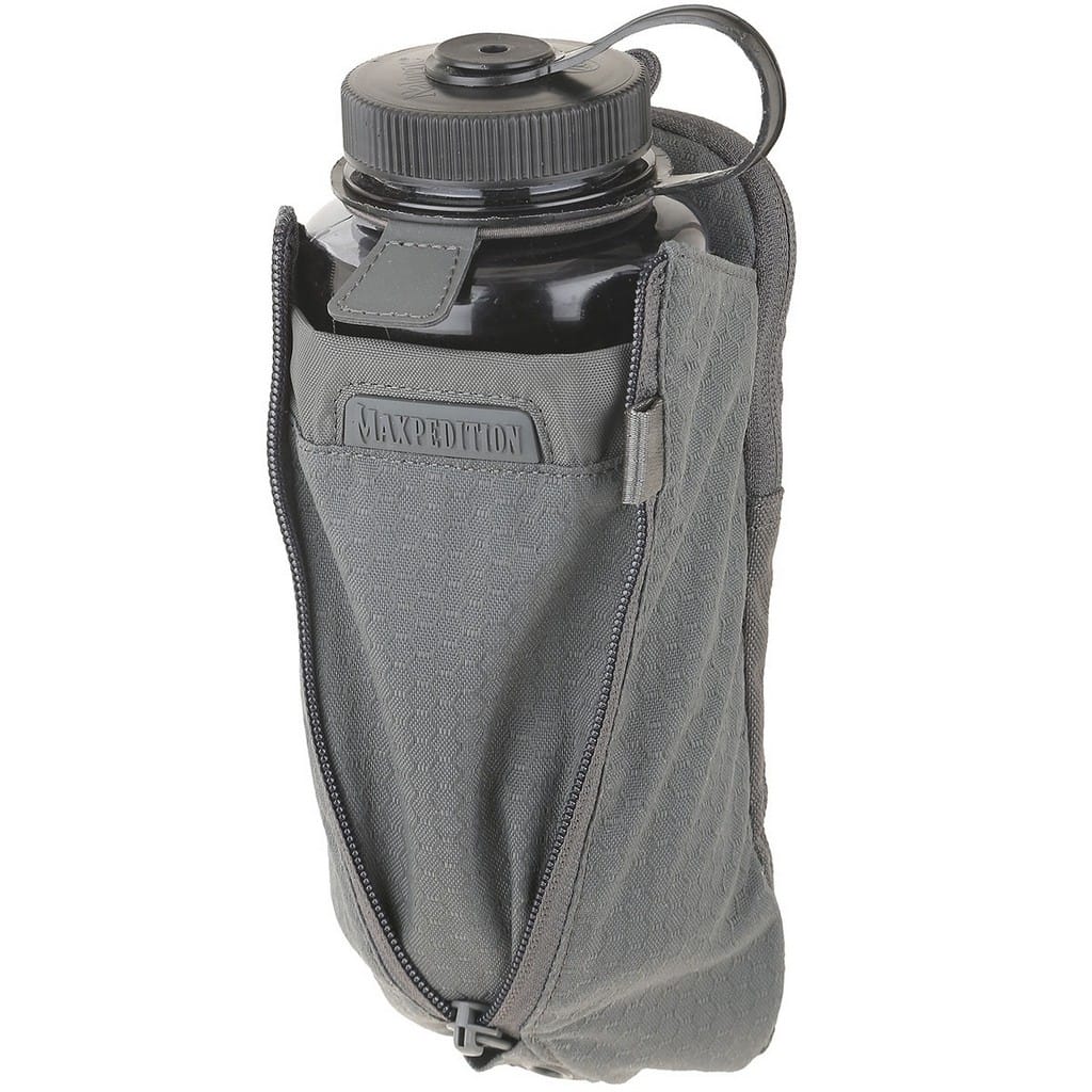 Pokrowiec firmy Maxpedition kompatybilny z systemem Molle, pozwalający na wygodny montaż do plecaków czy toreb. Pasuje do powszechnie dostępnych butelek, a w tym modeli z szerokim wlewem firmy Nalgene o pojemności jednego litra. W przypadku butli z większą średnicą mamy możliwość zwiększenia szerokości komory poprzez rozsuniecie zamka błyskawicznego. Dwupozycyjny ściągacz z elastycznej linki służy do bezpiecznego zaczepienia pojemników o różnej wysokości. Tylna kieszeń zamykana na suwak zakończony wygodnym uchwytem z tworzywa dostarcza miejsce na drobne akcesoria jak tabletki do uzdatniania wody, czy podręczną apteczkę. Ogromną zaletą modelu są dwa polimerowe mocowania TacTie znajdujące się w zestawie, dzięki którym możemy doczepić pokrowiec do wyposażenia lub zamocować przy pasie. Rozwiązanie to nie wymaga dodatkowych pasków, które w przypadku innych produktów Maxpedition należy dokupić oddzielnie, aby móc je zamontować do ekwipunku.