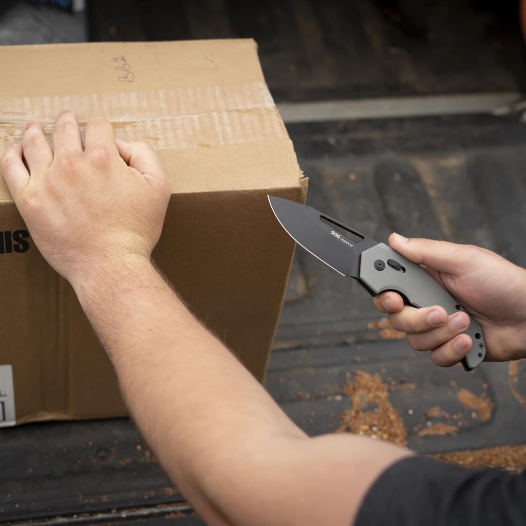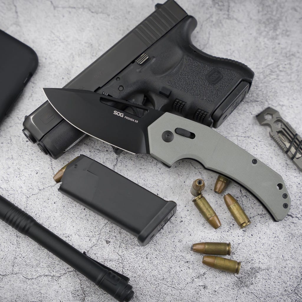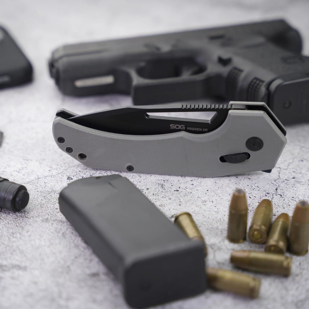 Prohen XR to funkcjonalny model, który powstał przy współpracy firmy SOG z Mikkelem Willumsenem. Stanowi doskonały wybór na towarzysza codziennej przygody, który sprawdzi się zarówno do aktywności na świeżym powietrzu, jak i do rozwiązywania zadań w domu oraz w pracy. Model posiada szerokie ostrze o uniwersalnym profilu Drop Point wykonane z wszechstronnej stali narzędziowej D2 o wysokiej zawartości węgla, poddanej kriogenicznej obróbce cieplnej. Proces ten zapewnia dobre trzymanie ostrości, zwiększa trwałość i odpowiada za łatwość konserwacji. W celu ochrony przed odblaskami i rysowaniem się powierzchni głownię pokryto czarnym azotkiem tytanu (Titanium Nitride). Klingę można szybko i sprawnie rozłożyć jedną ręką za pomocą otworu, flippera lub przy wykorzystaniu suwaka znajdującego się na rękojeści. Nad bezpieczeństwem użytkownika, gdy narzędzie jest w użyciu,czuwa innowacyjny systemem blokującym XR Lock. Karbowany grzbiet ostrza stanowi stabilne wsparcie dla kciuka, co poprawia kontrolę nad folderem. Ergonomicznie wyprofilowane okładziny chwytu zrobiono z odpornego na warunki atmosferyczne materiału G10 w szarym kolorze. Cechują się teksturowaną fakturą, która zwiększa przyczepność do dłoni użytkownika i gwarantuje pewny chwyt, nawet w wymagającej i trudnej sytuacji. Na zakończeniu umieszczono otwór umożliwiający przełożenie breloka ozdobnego lub paracordu. Konstrukcję uzupełnia dwupozycyjny klips mocujący z logo producenta, pozwalający na wygodne przenoszenie noża w kieszeni spodni lub przy wyposażeniu.