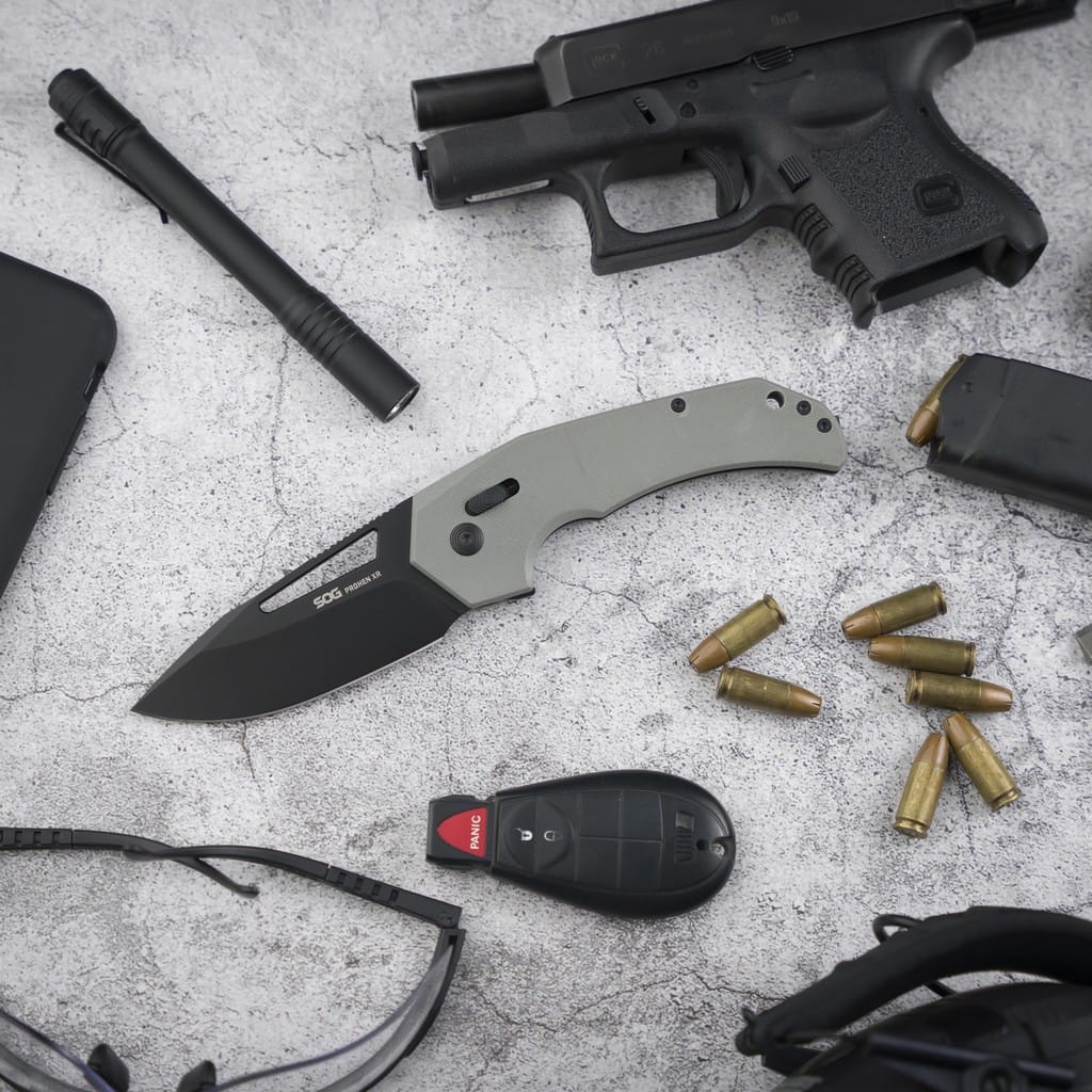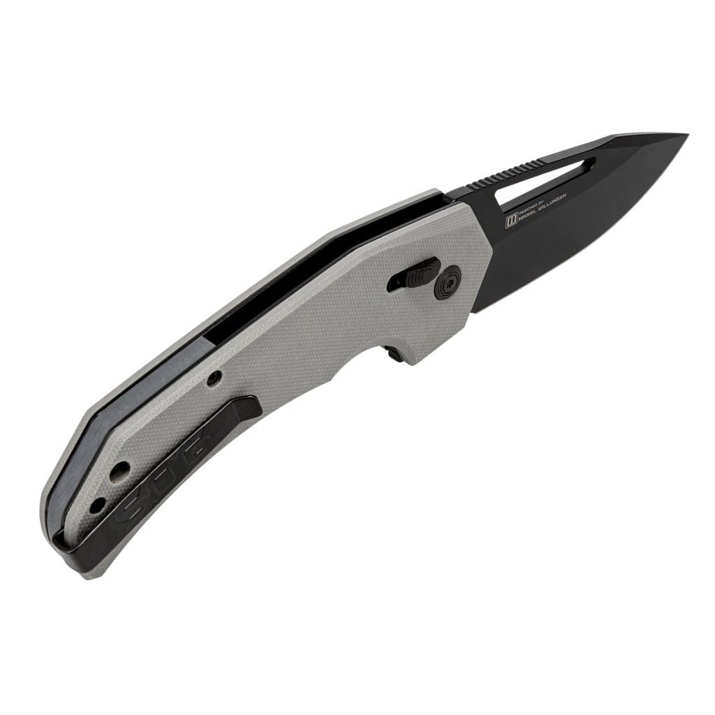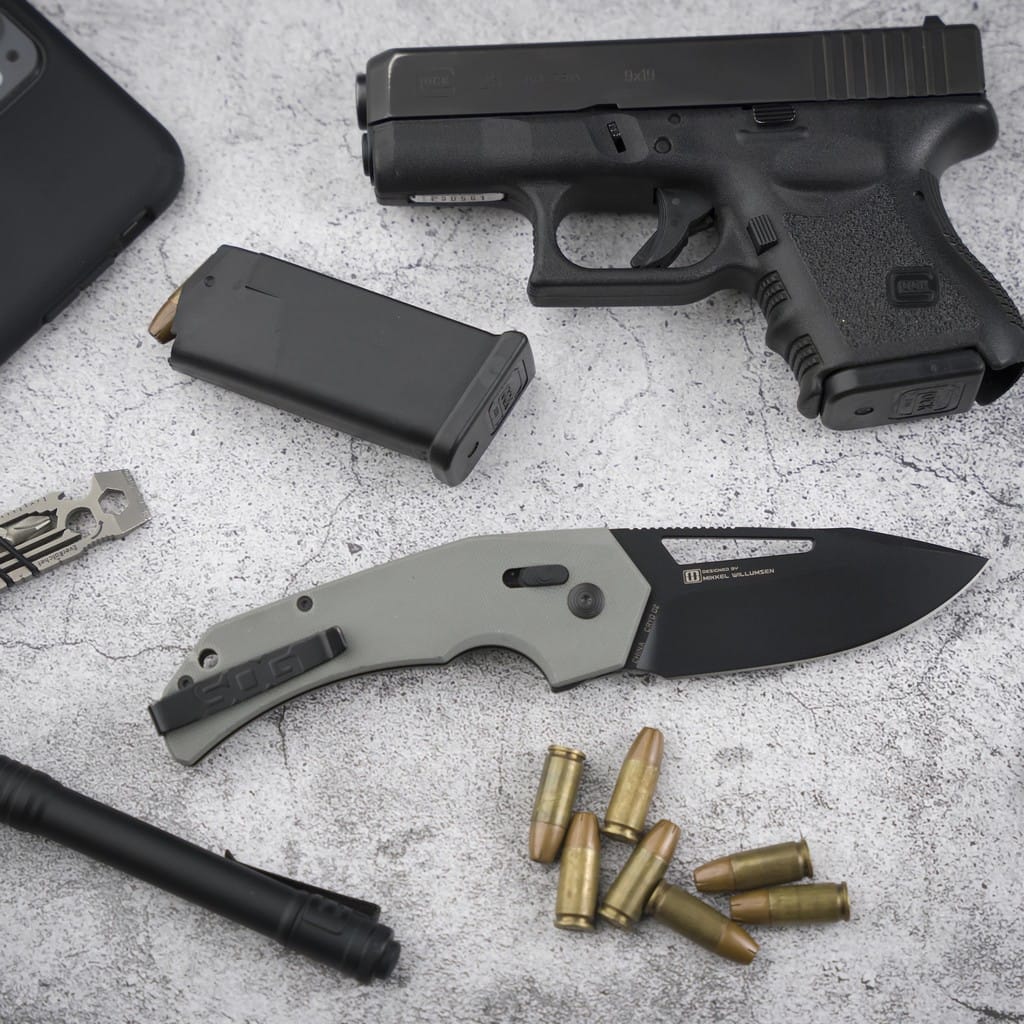 Prohen XR to funkcjonalny model, który powstał przy współpracy firmy SOG z Mikkelem Willumsenem. Stanowi doskonały wybór na towarzysza codziennej przygody, który sprawdzi się zarówno do aktywności na świeżym powietrzu, jak i do rozwiązywania zadań w domu oraz w pracy. Model posiada szerokie ostrze o uniwersalnym profilu Drop Point wykonane z wszechstronnej stali narzędziowej D2 o wysokiej zawartości węgla, poddanej kriogenicznej obróbce cieplnej. Proces ten zapewnia dobre trzymanie ostrości, zwiększa trwałość i odpowiada za łatwość konserwacji. W celu ochrony przed odblaskami i rysowaniem się powierzchni głownię pokryto czarnym azotkiem tytanu (Titanium Nitride). Klingę można szybko i sprawnie rozłożyć jedną ręką za pomocą otworu, flippera lub przy wykorzystaniu suwaka znajdującego się na rękojeści. Nad bezpieczeństwem użytkownika, gdy narzędzie jest w użyciu,czuwa innowacyjny systemem blokującym XR Lock. Karbowany grzbiet ostrza stanowi stabilne wsparcie dla kciuka, co poprawia kontrolę nad folderem. Ergonomicznie wyprofilowane okładziny chwytu zrobiono z odpornego na warunki atmosferyczne materiału G10 w szarym kolorze. Cechują się teksturowaną fakturą, która zwiększa przyczepność do dłoni użytkownika i gwarantuje pewny chwyt, nawet w wymagającej i trudnej sytuacji. Na zakończeniu umieszczono otwór umożliwiający przełożenie breloka ozdobnego lub paracordu. Konstrukcję uzupełnia dwupozycyjny klips mocujący z logo producenta, pozwalający na wygodne przenoszenie noża w kieszeni spodni lub przy wyposażeniu.