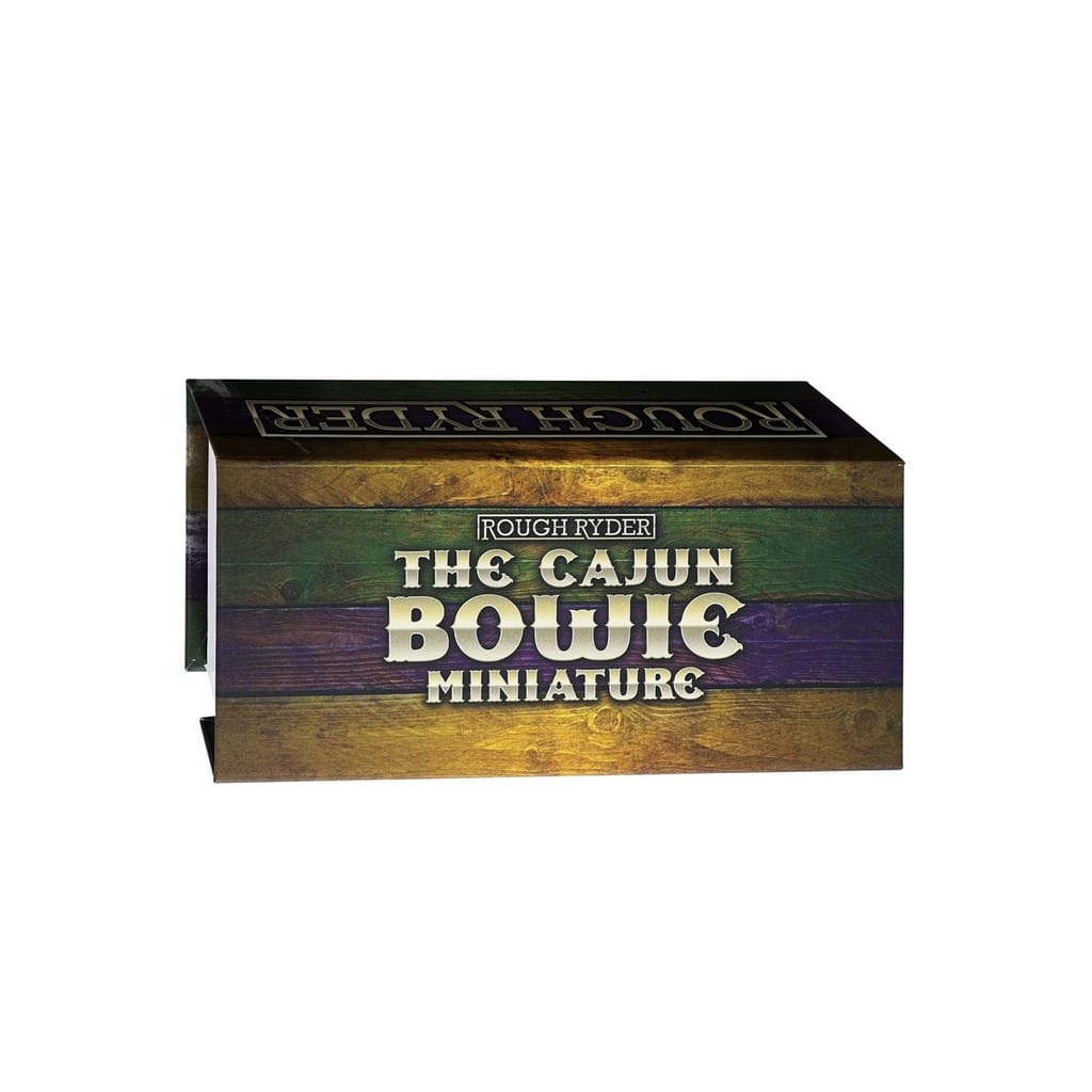 Mini Cajun Bowie to miniaturowy nóż z ostrzem stałym wyprodukowany przez amerykańską firmę Rough Rider. Narzędzie posiada konstrukcję full tang, czyli zostało zrobione z jednego kawałka stali nierdzewnej, co podnosi jego wytrzymałość. Rękojeść z kości zdobią niklowane piny, głowica oraz obustronny jelec stanowiący dodatkowo zabezpieczenie dla dłoni, przed jej przypadkowym zsunięciem się na krawędź tnącą. Ostrze o uniwersalnym profilu Clip Point wykonano ze stali nierdzewnej 440, która po stępieniu jest prosta i przyjemna w ostrzeniu. Wykończenie głowni metodą Mirror-Polished pozostawia lustrzany efekt prezentujący się niezwykle spektakularnie.