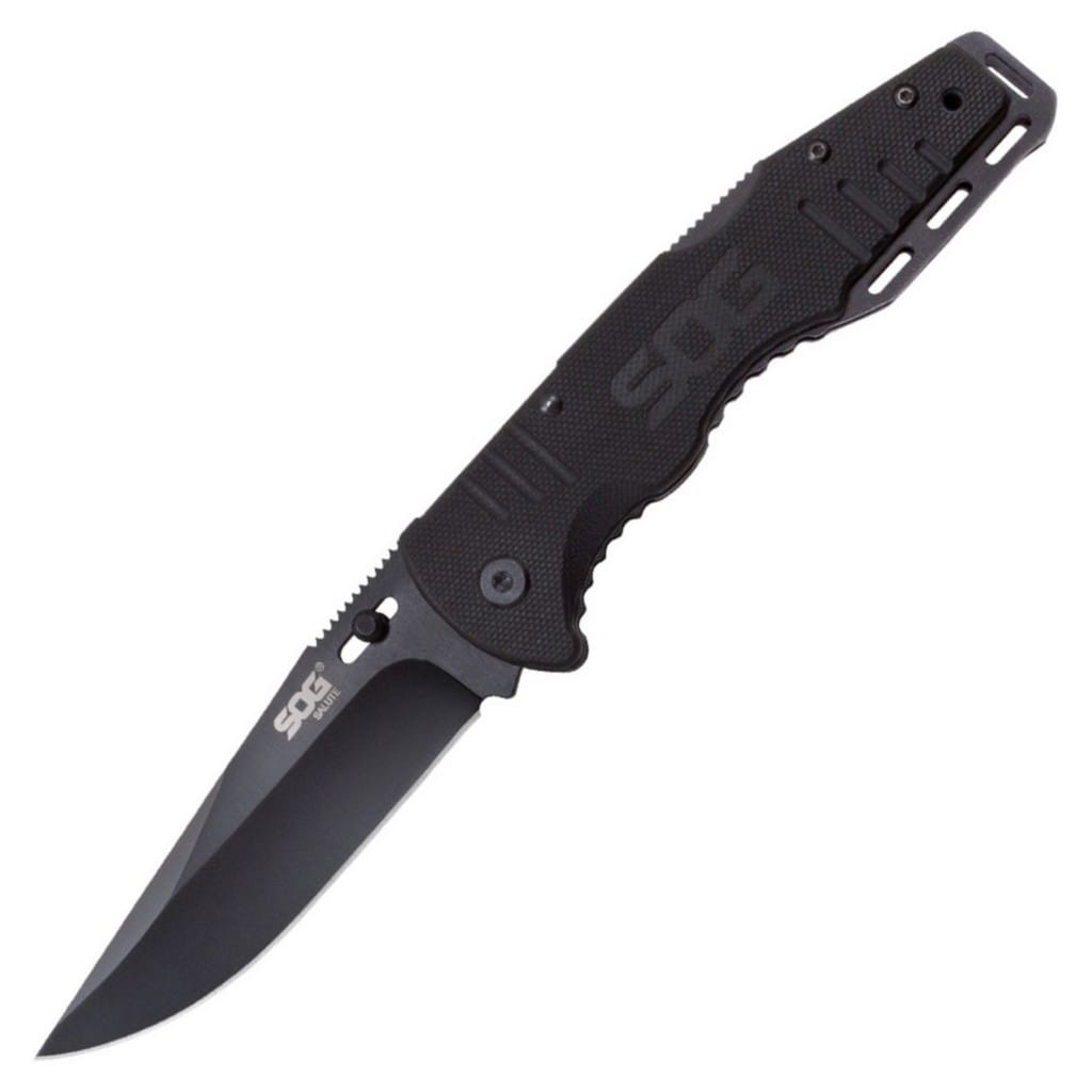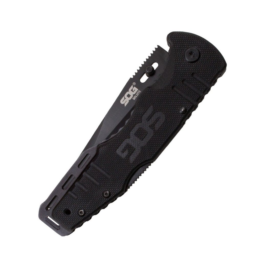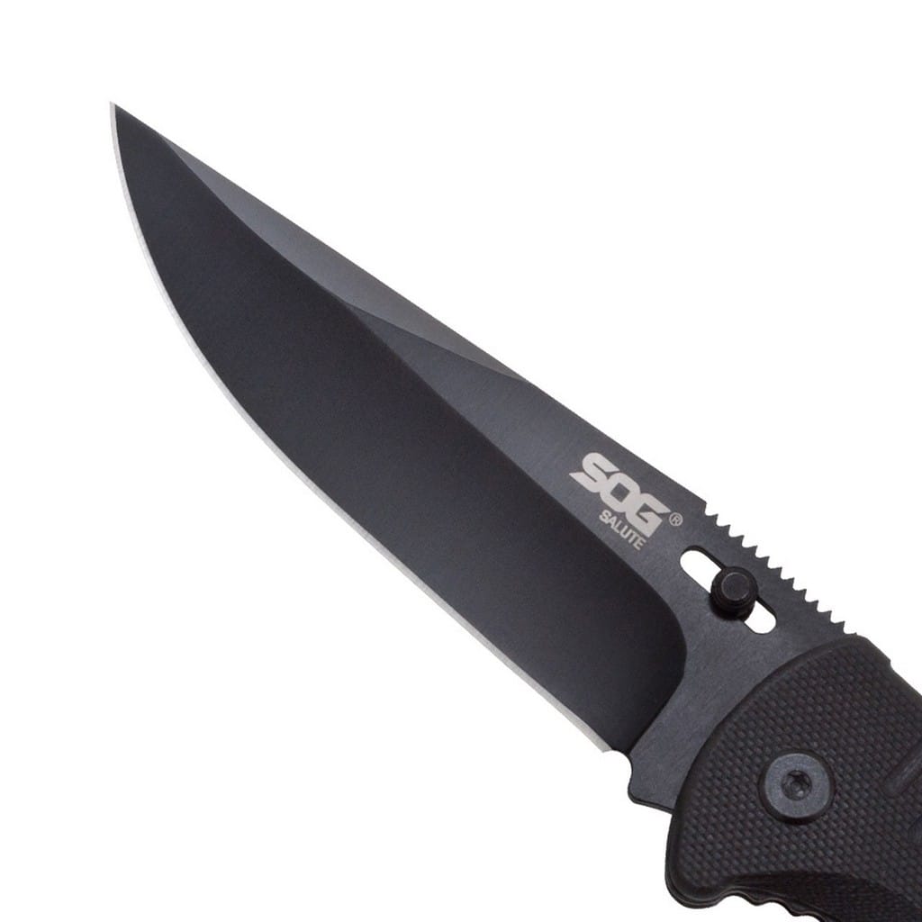Folder Salute amerykańskiej firmy Sog jest dowodem na to, że nie zawsze trzeba inwestować dużą sumę, aby otrzymać pełnowartościowy nóż o bardzo dobrych parametrach.  Ostrze zostało wykonane ze stali nierdzewnej 8Cr13MoV i pokryte czarną oksydą, która zabezpiecza przed korozją i odbijaniem się światła. Okładziny rękojeści z lekkiego i wytrzymałego tworzywa G10 skrywają wewnątrz stalowe linersy, które wzmacniają całą konstrukcję. Odpowiednie wyprofilowanie chwytu i jego antypoślizgowa, chropowata faktura sprawiają, że nóż dobrze trzyma się w dłoni. Blokada back lock solidnie blokuje ostrze w pozycji rozłożonej przed jego niekontrolowanym zamknięciem. Innowacyjnym rozwiązaniem jakiego producent dostarczył w tym kompaktowym folderze jest ruchomy kołek na głowni do otwierania noża. Możemy dzięki temu dopasować jego pozycję do własnych rąk, co znacznie poprawia komfort użytkowania. Salute posiada również szkieletowy klips mocujący z logo firmy SOG.