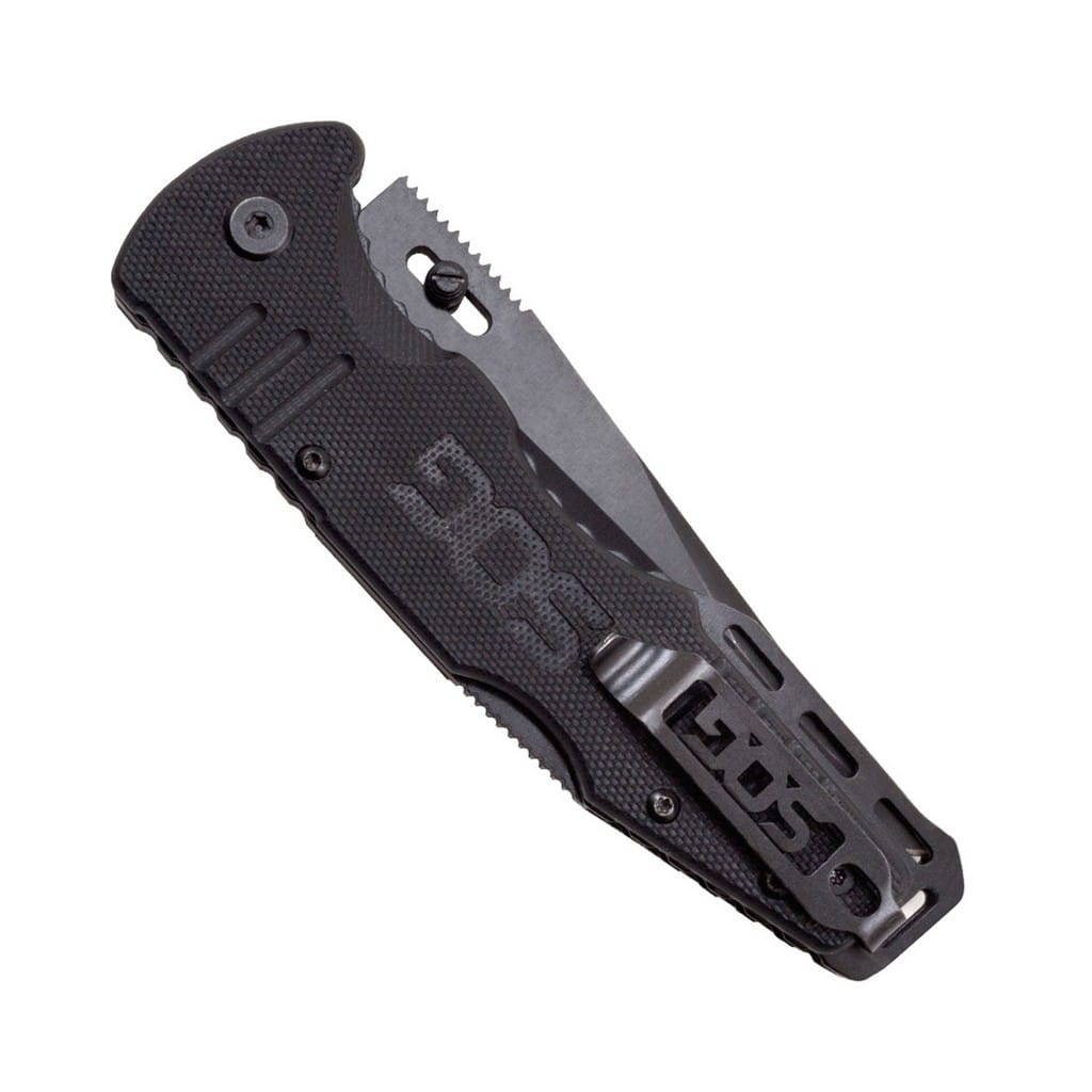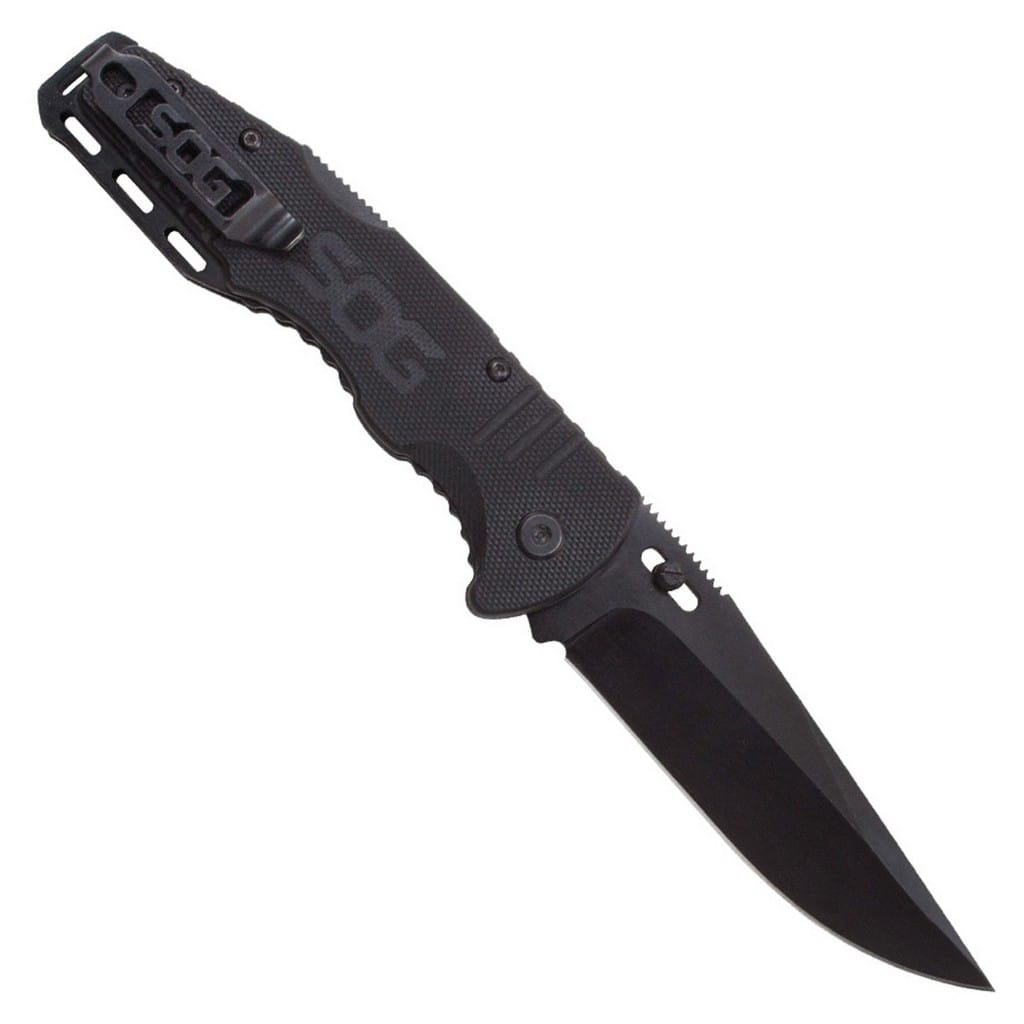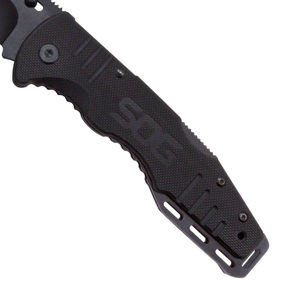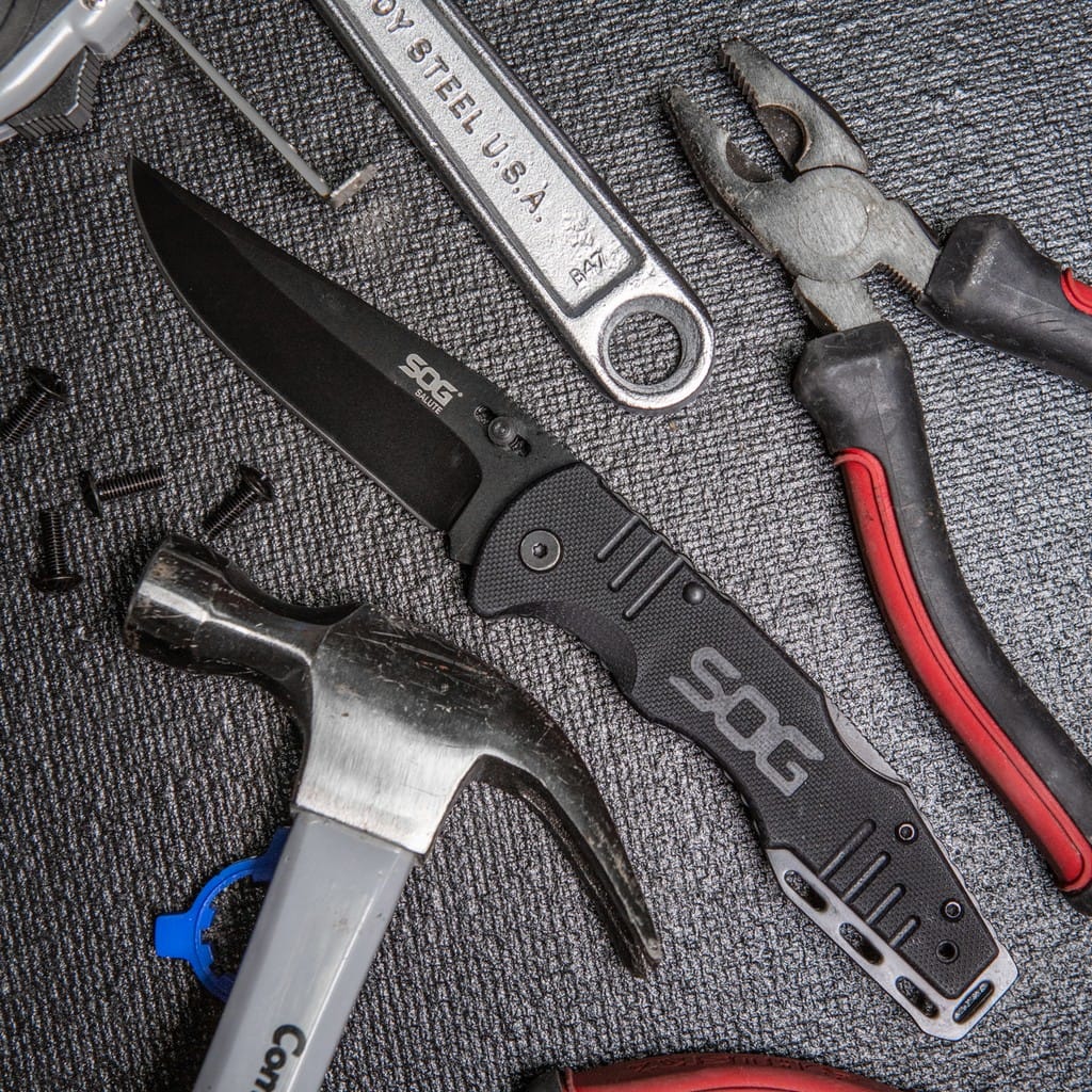 Folder Salute amerykańskiej firmy Sog jest dowodem na to, że nie zawsze trzeba inwestować dużą sumę, aby otrzymać pełnowartościowy nóż o bardzo dobrych parametrach.  Ostrze zostało wykonane ze stali nierdzewnej 8Cr13MoV i pokryte czarną oksydą, która zabezpiecza przed korozją i odbijaniem się światła. Okładziny rękojeści z lekkiego i wytrzymałego tworzywa G10 skrywają wewnątrz stalowe linersy, które wzmacniają całą konstrukcję. Odpowiednie wyprofilowanie chwytu i jego antypoślizgowa, chropowata faktura sprawiają, że nóż dobrze trzyma się w dłoni. Blokada back lock solidnie blokuje ostrze w pozycji rozłożonej przed jego niekontrolowanym zamknięciem. Innowacyjnym rozwiązaniem jakiego producent dostarczył w tym kompaktowym folderze jest ruchomy kołek na głowni do otwierania noża. Możemy dzięki temu dopasować jego pozycję do własnych rąk, co znacznie poprawia komfort użytkowania. Salute posiada również szkieletowy klips mocujący z logo firmy SOG.