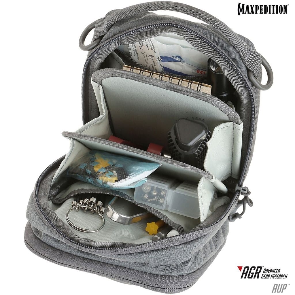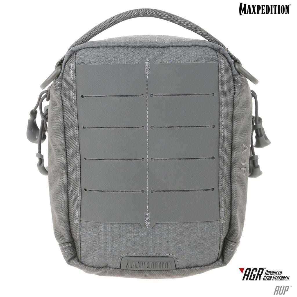 AUP z serii AGR to duża kieszeń amerykańskiej firmy Maxpedition z możliwością noszenia przy pasie. Saszetka w porównaniu do standardowych modeli producenta wyróżnia się nowoczesnym wyglądem i interesującym designem. Ogromną zaletą są dwa polimerowe mocowania TacTie znajdujące się w komplecie, dzięki którym możemy doczepić ją do plecaka, torby czy kamizelki kompatybilnych z systemem Molle. Accordion Utility Pouch jest bardzo pojemna, główna komora swoją konstrukcją przypomina akordeon czyli szereg przegródek, w które spakujemy sporą ilość wyposażenia. Przednia kieszeń posiada elastyczne taśmy na akcesoria do ich dobrej organizacji i bezpiecznego transportowania. Szeroki i łatwy dostęp do wnętrza zapewnia dwukierunkowy wysokiej jakości zamek błyskawiczny, a zamocowane na nim uchwyty pozwalają na wygodne rozsuwanie komory jedną ręką a nawet gdy dłoń jest w rękawicy. Model został również obszyty materiałem wyciętym laserowo z nylonu kompozytowego z systemem kanałów przez które można przełożyć taśmy i dołączyć dodatkowy ekwipunek.