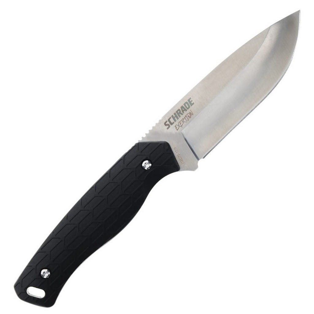 Exertion to model zaprojektowany przez entuzjastów polowań jako funkcjonalne narzędzie do pracy w terenie, na łonie natury. Charakteryzuje się konstrukcją full tang, czyli wykonaniem z jednego kawałka stali nierdzewnej AUS-10, co znacznie podnosi jego wytrzymałość użytkową. Ostrze o uniwersalnym profilu Drop Point zostało wykończone metodą Satin pozostawiającą drobne ryski lekko matujące powierzchnię, dające efekt niedokładnego wypolerowania. Nad bezpieczeństwem czuwa duży jelec, który zabezpiecza rękę przed jej przypadkowym zsunięciem się na krawędź tnącą, a także karbowany grzbiet noża stanowiący stabilne podparcie dla palców. Ergonomicznie wyprofilowana rękojeść z Kratonu gwarantuje pewny chwyt, jak również eliminuje drgania podczas intensywnych zadań. Na zakończeniu znajduje się otwór na linkę umożliwiający zamocowanie paracordu i stworzenie oplotu na nadgarstek. Do zestawu dołączono pochwę z formowanego wtryskowo tworzywa ze szlufką na pasek, aby ułatwić wygodne transportowanie noża blisko ciała. Dodatkowo liczne otwory na jej krawędzi pozwalają na doczepienie całości do plecaka lub kamizelki. Kolejnym atutem jest wbudowana ceramiczna ostrzałka, dzięki której szybko podostrzymy ostrze oraz pręt krzesiwa, z którego pomocą rozniecimy ogień, gdy jesteśmy z dala od domu i cywilizacji.
