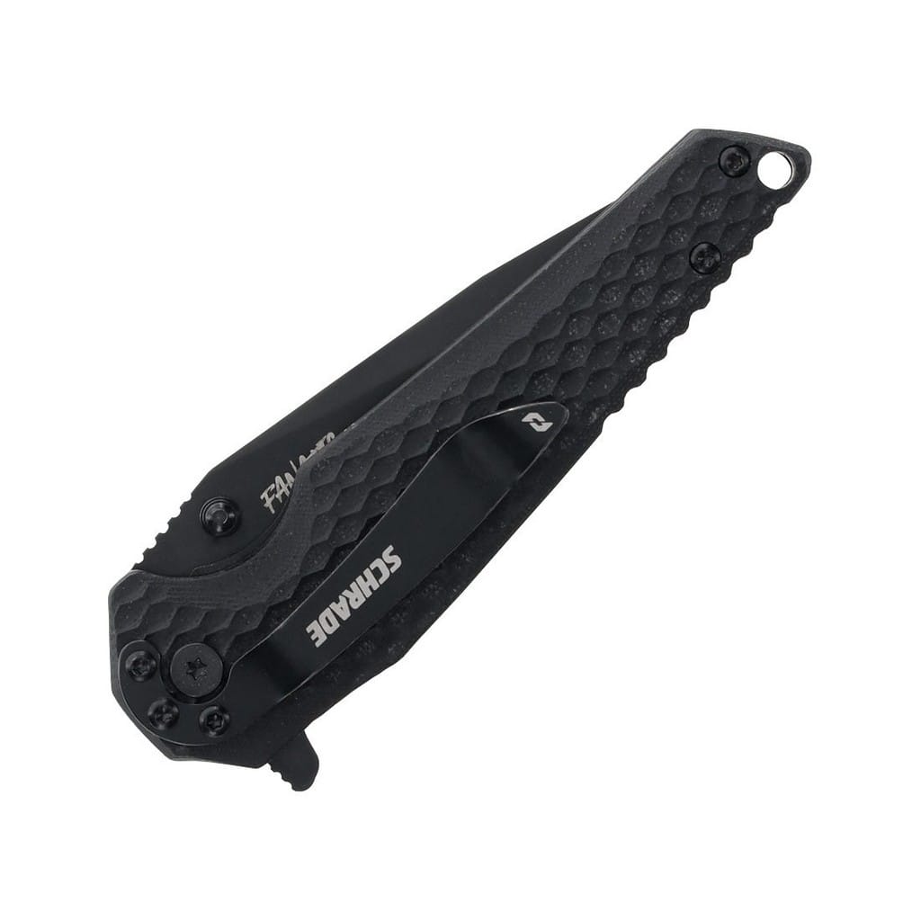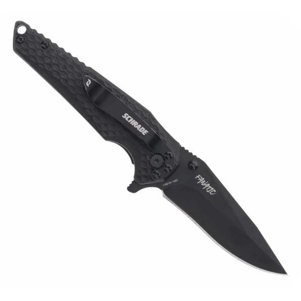 Fanatic firmy Schrade to model charakteryzujący się imponującym wykończeniem i funkcjonalnością, dlatego idealnie sprawdzi się w roli taktycznego foldera, jak i noża codziennego użytku. Ostrze o profilu Drop Point wykonano z japońskiej stali nierdzewnej AUS-8, która jest twarda i bardzo dobrze trzyma ostrość, a w celu ochrony przed korozją i odblaskami pokryto je czarną oksydą. W szybkim rozłożeniu klingi pomaga obustronny kołek na głowni lub duży flipper, pełniący jednocześnie funkcję jelca, a mechanizm łożysk kulkowych Ultra Glide wpływa na płynną pracę narzędzia. Blokada Liner Lock zabezpiecza przed przypadkowym złożeniem się noża, gdy jest w użyciu. Ergonomicznie wyprofilowana rękojeść z wytrzymałego i lekkiego tworzywa G10 posiada głębokie wcięcie pod palec, co gwarantuje pewny chwyt. Specjalna, antypoślizgowa faktura okładzin dodatkowo poprawia komfort użytkowania. Konstrukcję uzupełnia otwór na linkę, a także klips mocujący, dzięki któremu możemy wygodnie transportować folder w kieszeni spodni lub przy wyposażeniu.