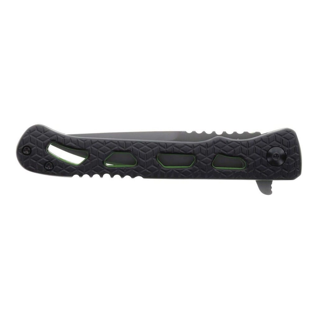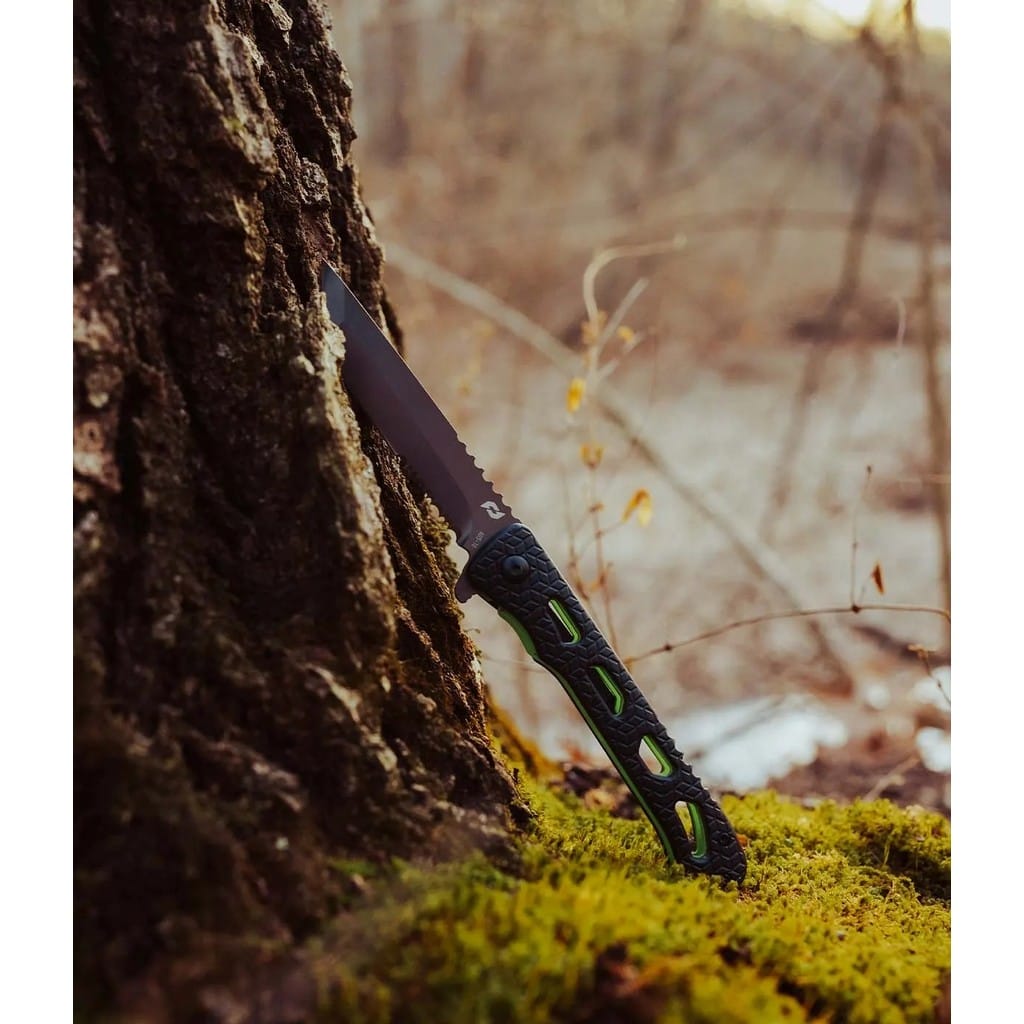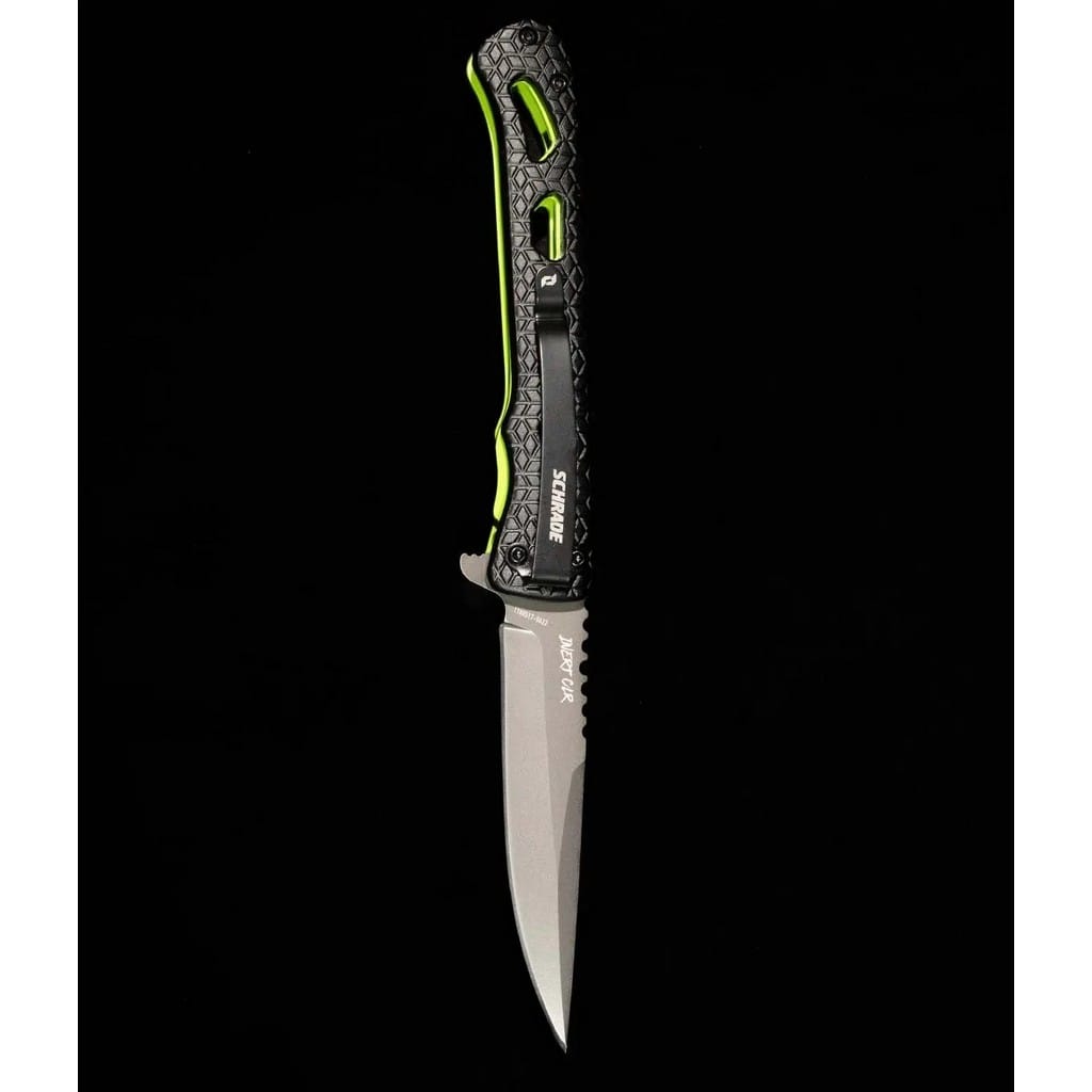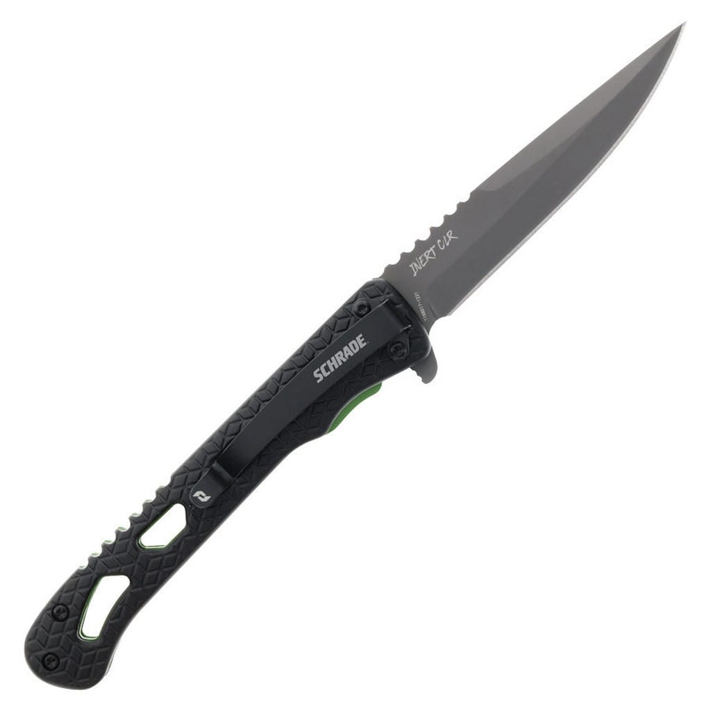 Inert CLR to smukły i zwinny folder należący do serii noży Delta producenta Schrade. Model przyciąga uwagę rękojeścią, która posiada czarne okładziny chwytu i zielone linersy. Jej szkieletowa konstrukcja minimalizuje wagę i nadaje ciekawy design całości. Głownia o uniwersalnym profilu Drop Point została wykonana z japońskiej stali nierdzewnej AUS-10 długo utrzymującej właściwą ostrość krawędzi tnącej. Pokryto ją szarym azotkiem tytanu Titanium Nitride zabezpieczającym przed korozją, odblaskami i zarysowaniami. W szybkim rozłożeniu klingi jedną ręką pomaga flipper, pełniący jednocześnie funkcję jelca, zaś mechanizm łożysk kulkowych Ultra Glide wpływa na płynną pracę narzędzia. Wytrzymała blokada Liner Lock zapewnia użytkownikowi bezpieczeństwo podczas pracy, które dodatkowo wspomaga karbowany grzbiet głowni stanowiący stabilne podparcie dla kciuka. Ergonomicznie wyprofilowana rękojeść z aluminium o antypoślizgowym wzorze gwarantuje w każdych warunkach doskonałą przyczepność do dłoni. Budowę uzupełnia klips mocujący służący do wygodnego przenoszenia foldera w kieszeni spodni lub przy wyposażeniu.