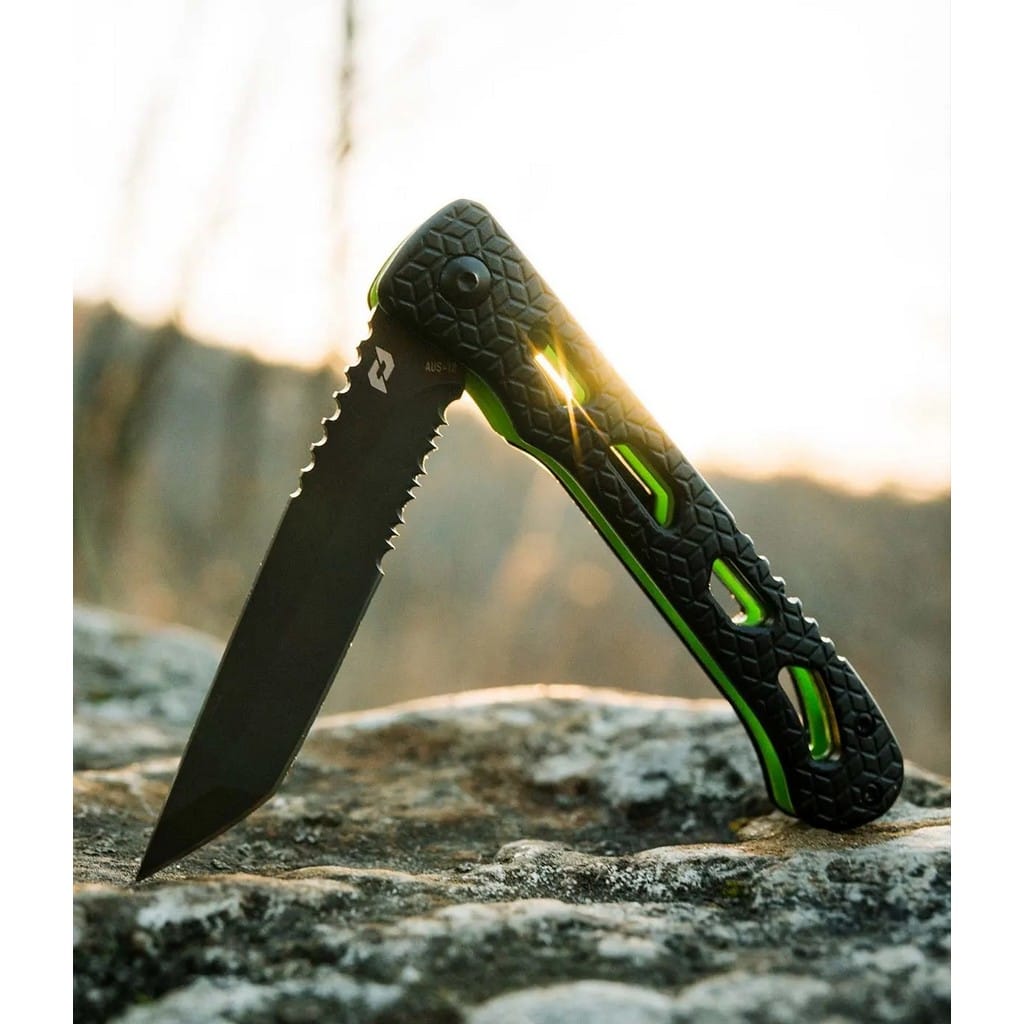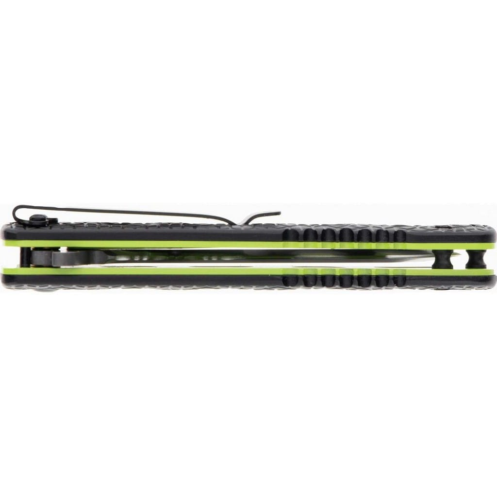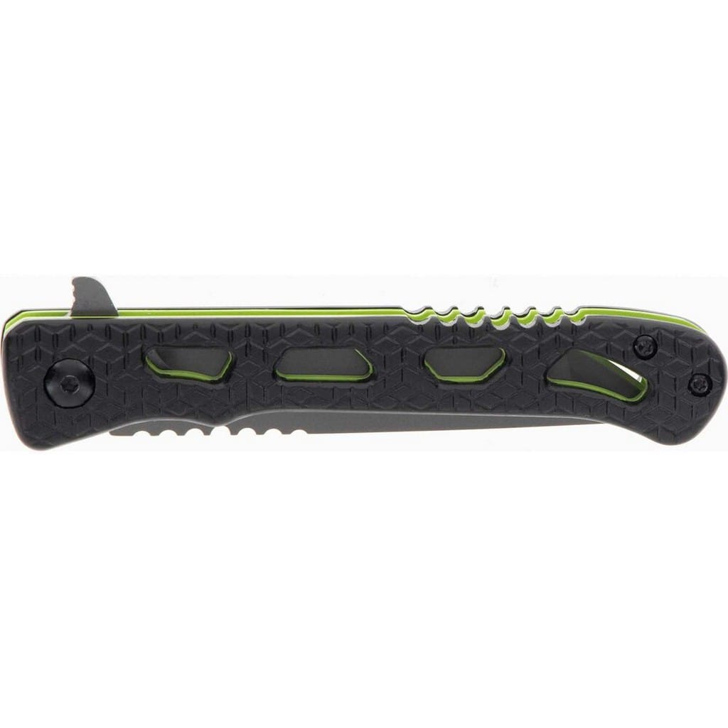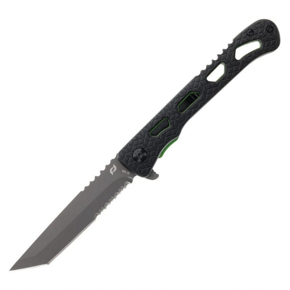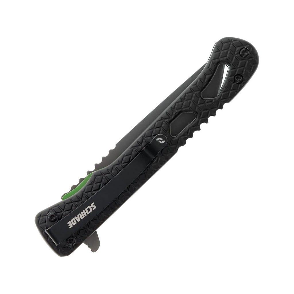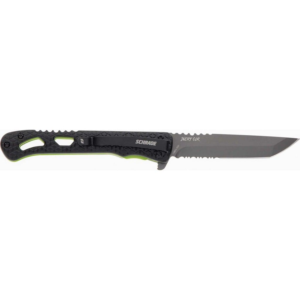 Inert CLR to smukły i zwinny folder należący do serii noży Delta producenta Schrade. Model przyciąga uwagę rękojeścią, która posiada czarne okładziny chwytu i zielone linersy. Jej szkieletowa konstrukcja minimalizuje wagę i nadaje ciekawy design całości. Głownia o taktycznym profilu Tanto wykonana z japońskiej stali nierdzewnej AUS-10 łączy zalety i uniwersalność ostrza gładkiego z ząbkowaną krawędzią tnącą. Pozwala na skuteczne cięcie zarówno miękkich przedmiotów jak i twardych lin, taśm, sznurów oraz innych podobnych materiałów. Pokryto ją szarym azotkiem tytanu Titanium Nitride zabezpieczającym przed korozją, odblaskami i zarysowaniami. W szybkim rozłożeniu klingi jedną ręką pomaga flipper, pełniący jednocześnie funkcję jelca, zaś mechanizm łożysk kulkowych Ultra Glide wpływa na płynną pracę narzędzia. Wytrzymała blokada Liner Lock zapewnia użytkownikowi bezpieczeństwo podczas pracy, które dodatkowo wspomaga karbowany grzbiet głowni stanowiący stabilne podparcie dla kciuka. Ergonomicznie wyprofilowana rękojeść z aluminium o antypoślizgowym wzorze gwarantuje w każdych warunkach doskonałą przyczepność do dłoni. Budowę uzupełnia klips mocujący służący do wygodnego przenoszenia foldera w kieszeni spodni lub przy wyposażeniu.