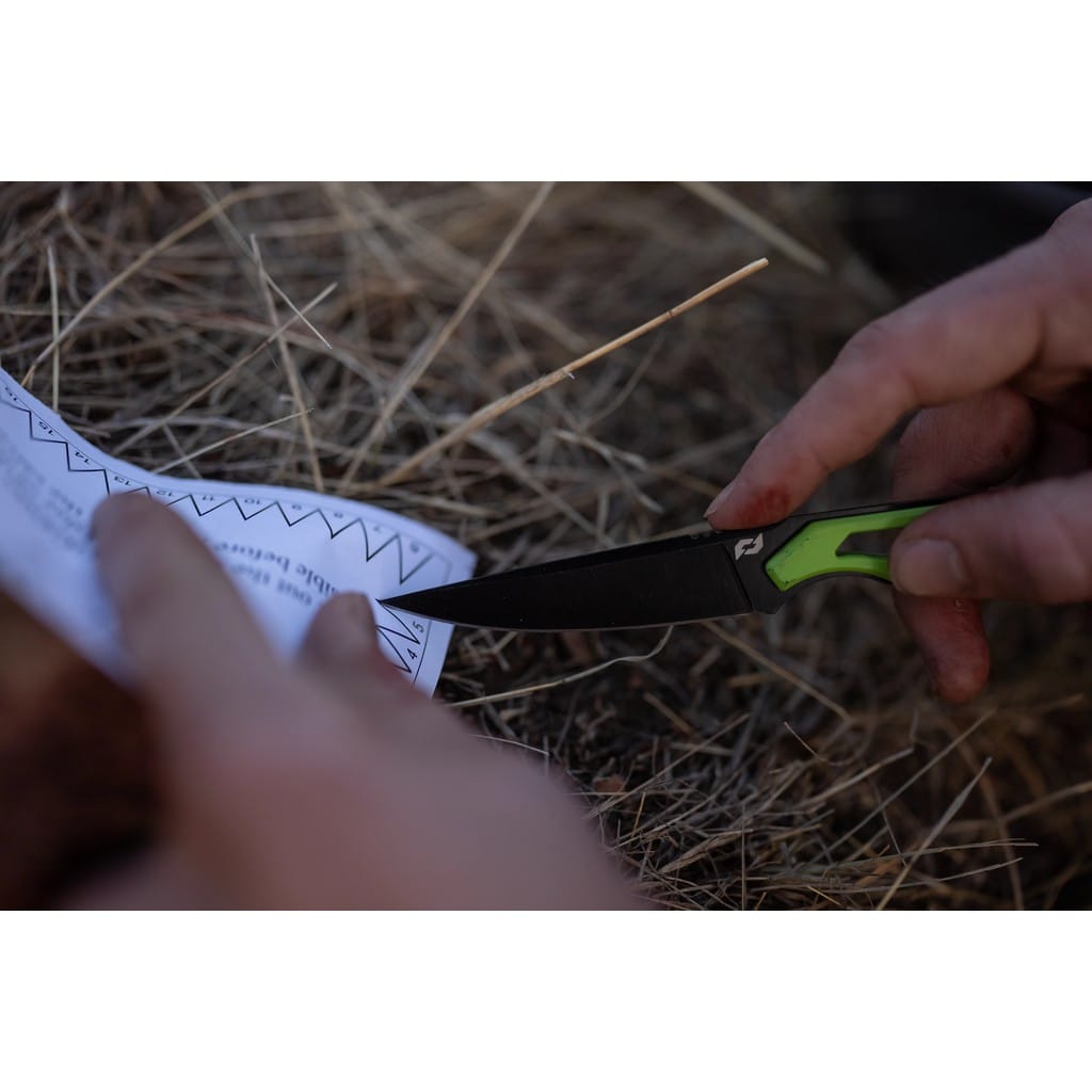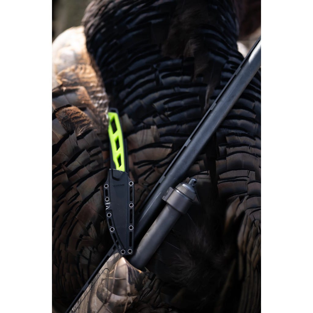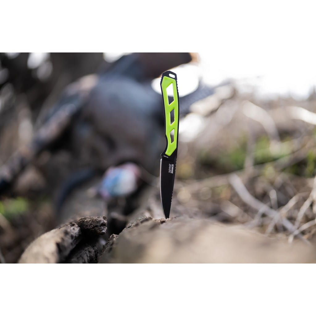 Seria narzędzi Isolate została stworzona przez firmę Schrade dla myśliwego, poszukującego solidnego i lekkiego sprzętu. Model Caper to świetny towarzysz na polowanie, który nie obciąży ekwipunku, a dzięki wytrzymałej konstrukcji full tang poradzi sobie z niejednym zadaniem. Wąskie ostrze o profilu Drop Point zrobiono ze stali nierdzewnej AUS-10 i pokryto czarną oksydą zabezpieczającą przed odblaskami i negatywnym działaniem czynników zewnętrznych. Karbowania na grzbiecie noża, stanowiące stabilne wsparcie dla palców, poprawiają bezpieczeństwo podczas pracy. Szkieletowa rękojeść minimalizuje wagę konstrukcji, lecz nadal gwarantuje pewny chwyt. Okładziny wykonano z antypoślizgowego tworzywa w jaskrawym kolorze, który ułatwi odnalezienie narzędzia, gdy zgubimy je w terenie. Na zakończeniu znajduje się otwór na linkę umożliwiający przełożenie paracordu i stworzenie oplotu na nadgarstek. Do zestawu dołączono pochwę z formowanego tworzywa, z wbudowaną ceramiczną ostrzałką. Z jej pomocą możemy wygodnie transportować nóż na pasku spodni, blisko ciała oraz szybko naostrzyć krawędź tnącą, gdy ulegnie stępieniu.