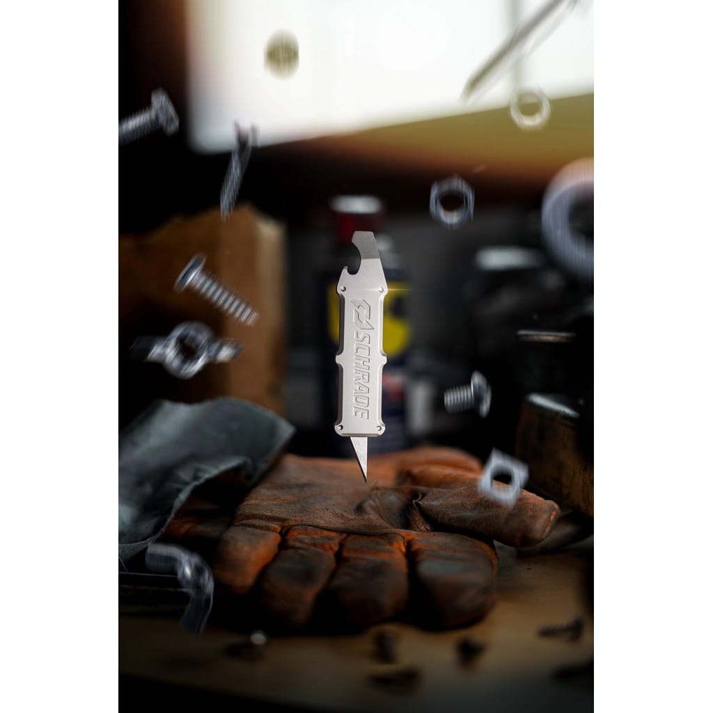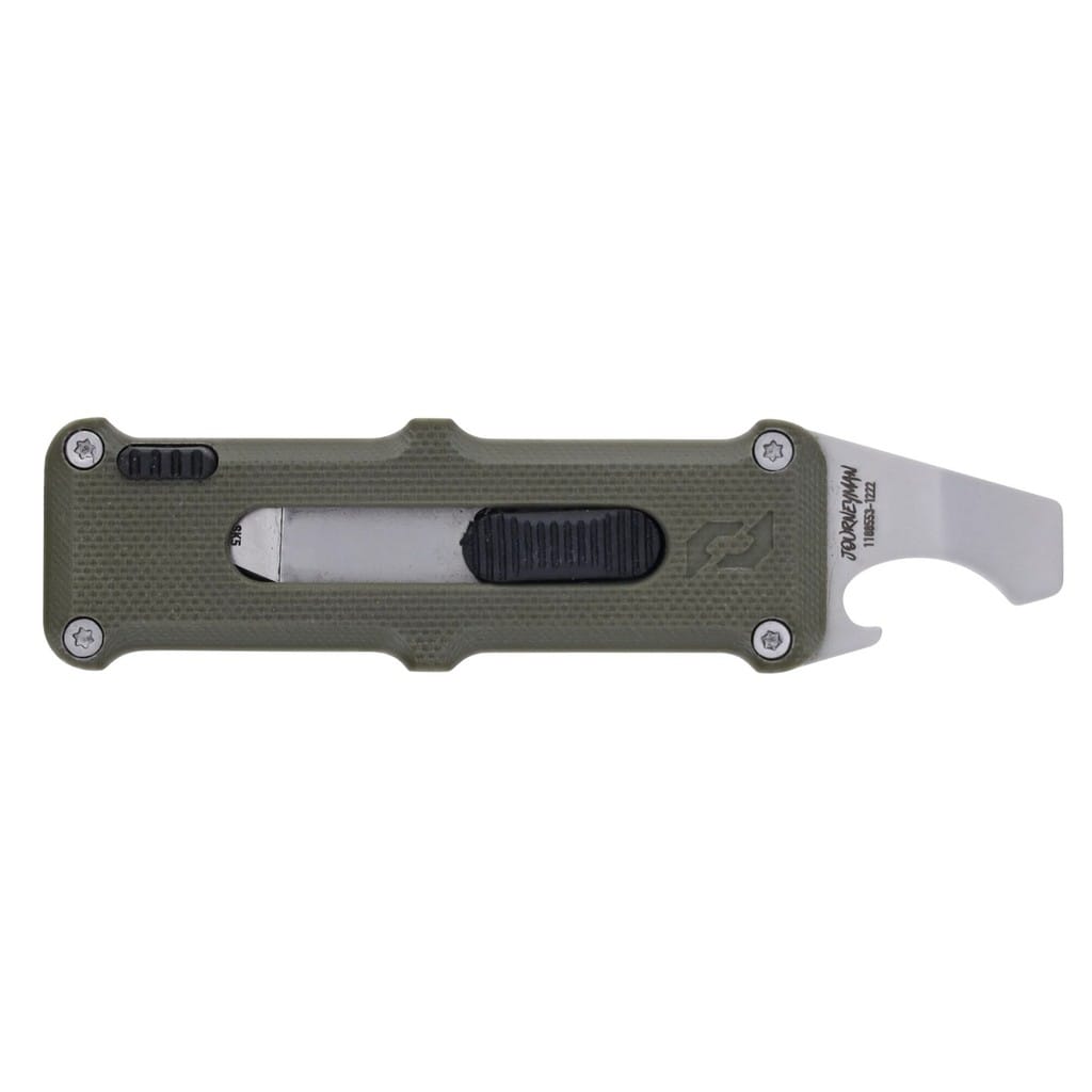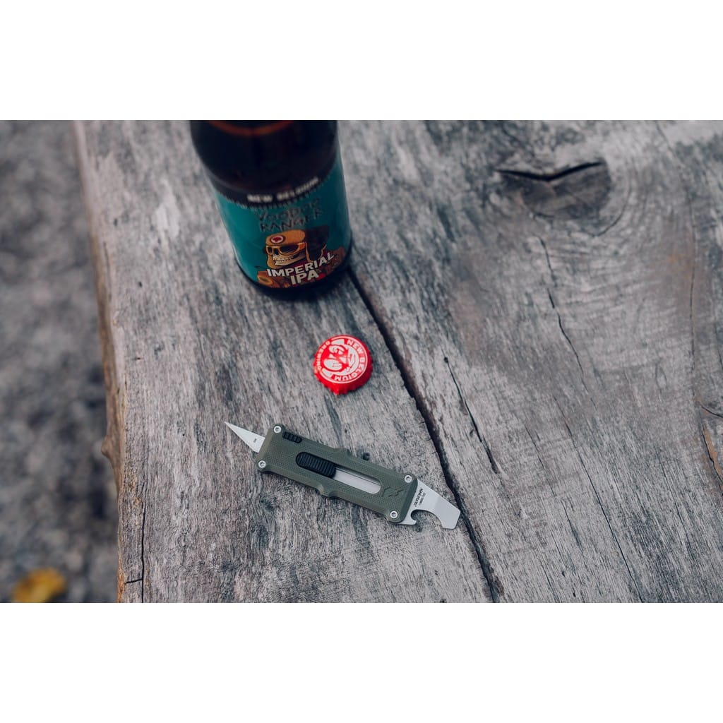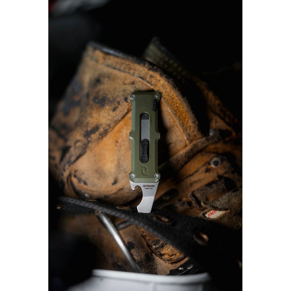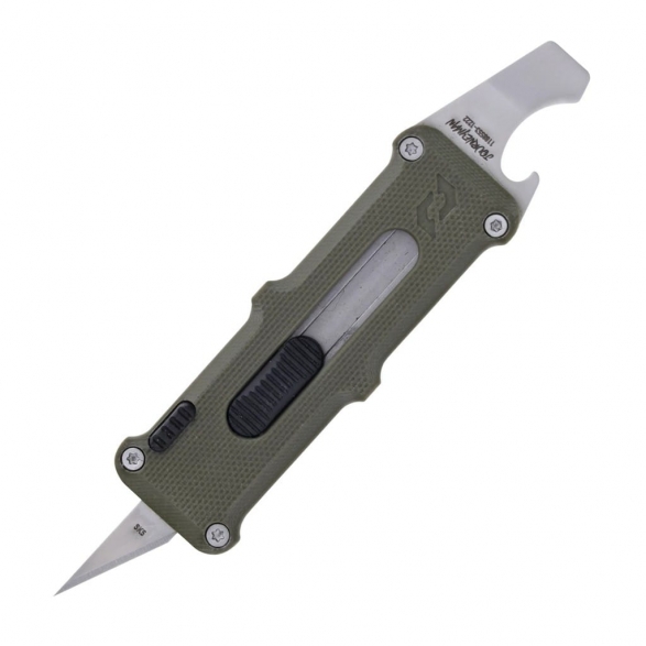 Journeyman firmy Schrade to niewielki nóż z wysuwanym i wymiennym ostrzem, posiadający również mini łom i otwieracz do butelek. Całość z powodzeniem zmieścimy w kieszeni spodni lub podręcznej torebce. Jedną ze stron rękojeści wykonano z aluminium z wygrawerowanym logo producenta. Drugą stronę stanowi zielone tworzywa G10 o antypoślizgowej fakturze, zwiększającej przyczepność do dłoni użytkownika. W zestawie znajduje się zapasowe ostrze, które z łatwością wymienimy po odkręceniu czterech śrubek, gdy ulegnie stępieniu.