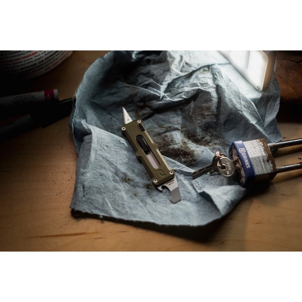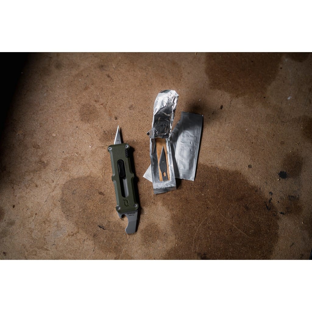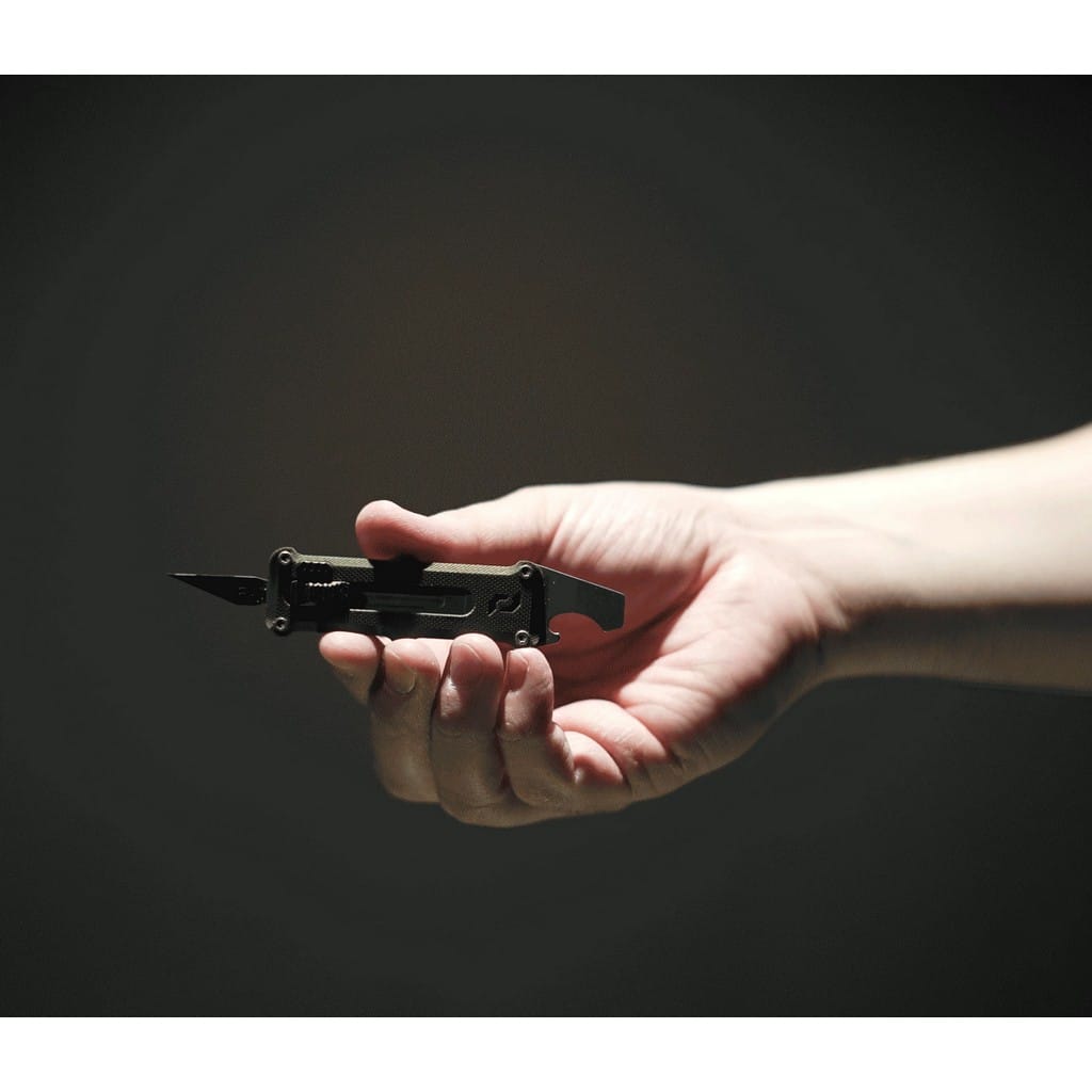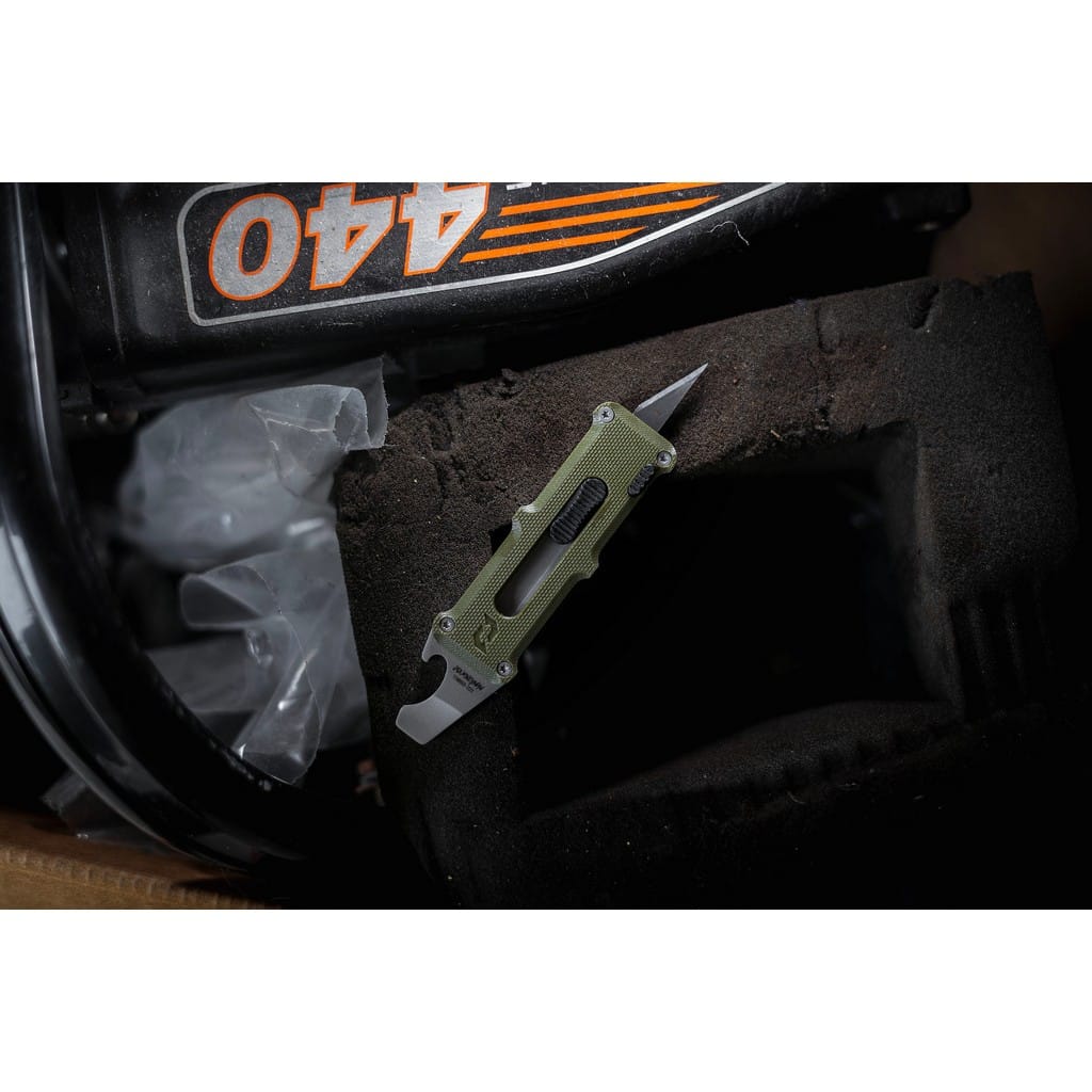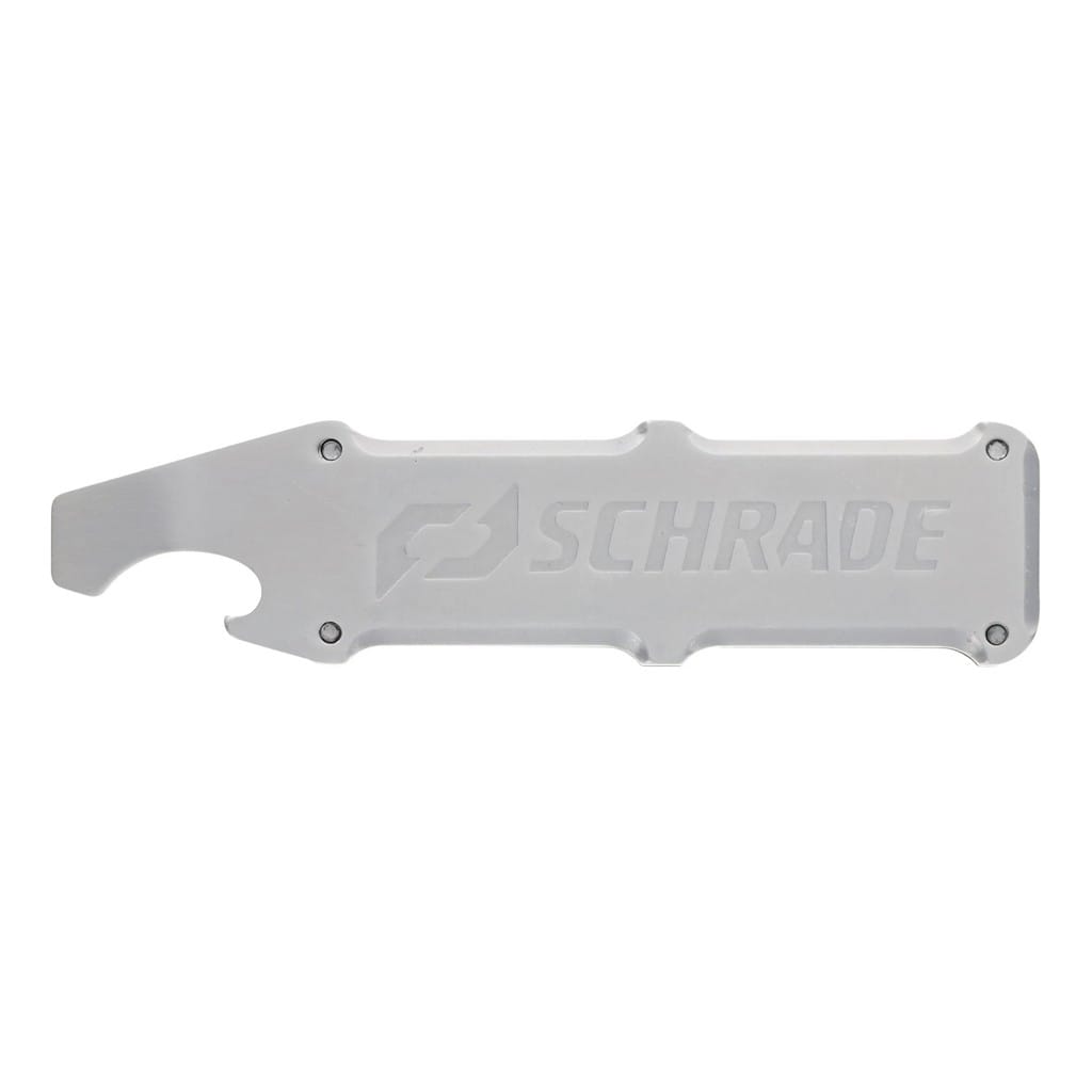 Journeyman firmy Schrade to niewielki nóż z wysuwanym i wymiennym ostrzem, posiadający również mini łom i otwieracz do butelek. Całość z powodzeniem zmieścimy w kieszeni spodni lub podręcznej torebce. Jedną ze stron rękojeści wykonano z aluminium z wygrawerowanym logo producenta. Drugą stronę stanowi zielone tworzywa G10 o antypoślizgowej fakturze, zwiększającej przyczepność do dłoni użytkownika. W zestawie znajduje się zapasowe ostrze, które z łatwością wymienimy po odkręceniu czterech śrubek, gdy ulegnie stępieniu.