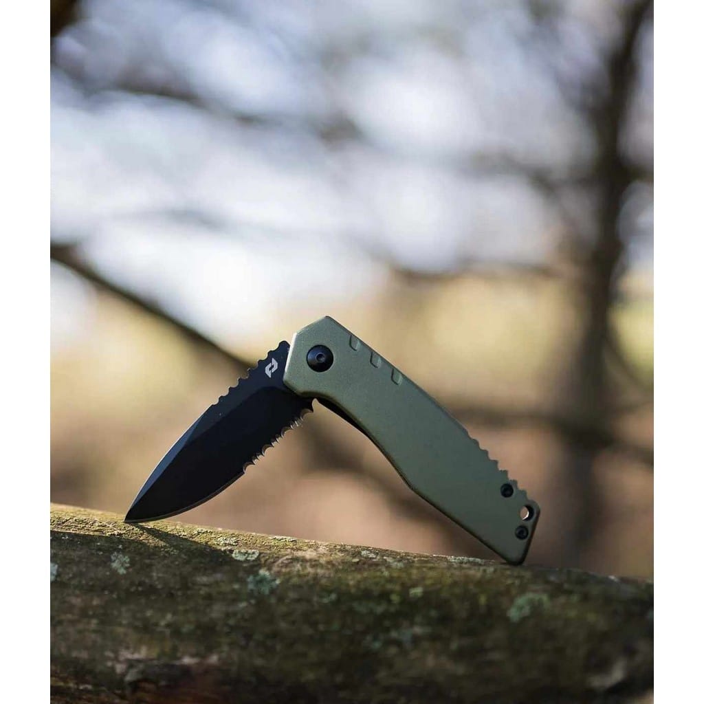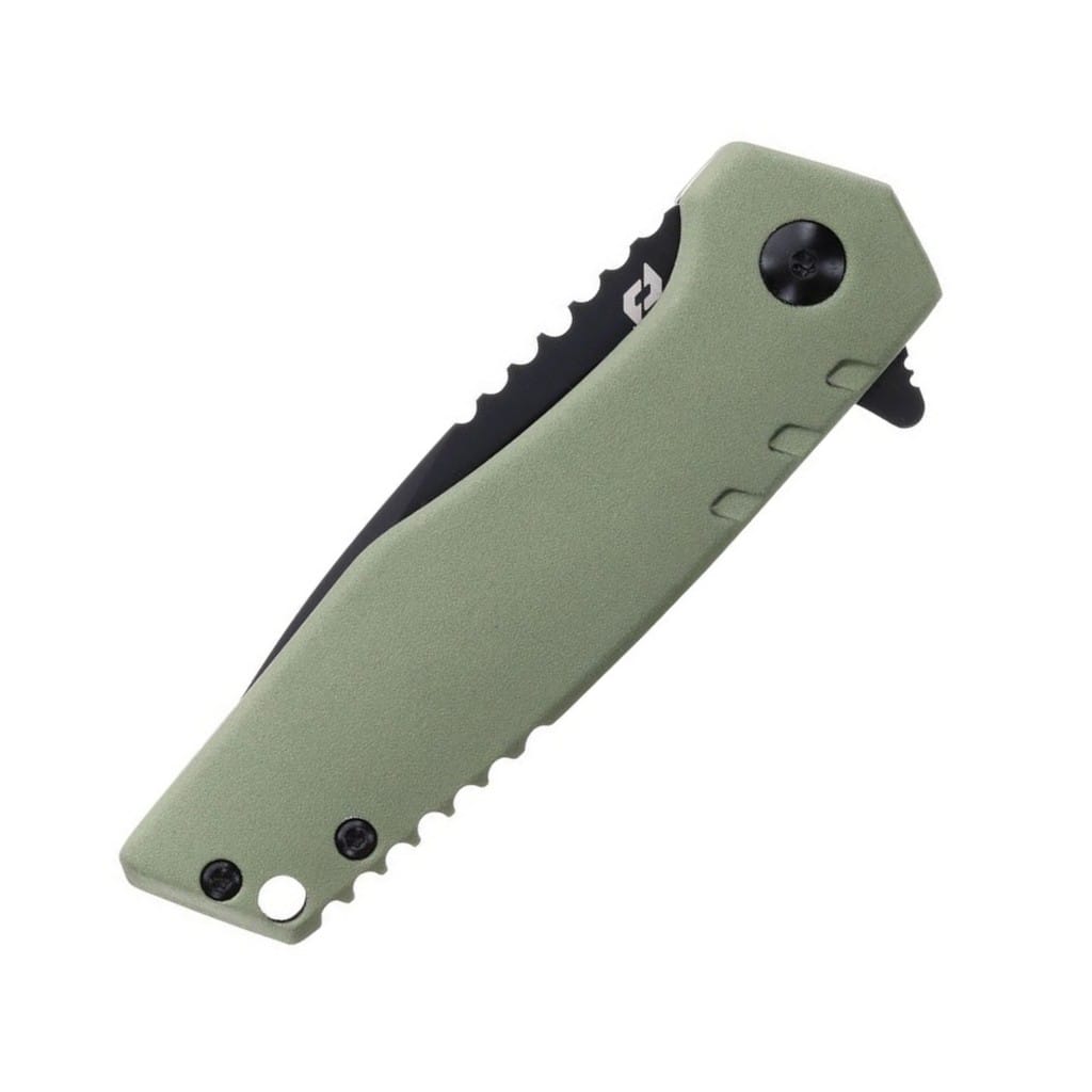 Outback firmy Schrade to folder o wyjątkowych umiejętnościach, stworzony do codziennego użytku. To czym wyróżnia się wśród innych konkurentów, to wspomaganie wysuwania ostrza Nitro Assisted, dzięki któremu model w ułamku sekundy będzie gotowy do działania. W szybkim rozłożeniu narzędzia pomoga flipper, pełniący jednocześnie funkcję jelca. Głownia typu Drop Point wykonana ze stali nierdzewnej AUS-10 łączy zalety i uniwersalność ostrza gładkiego z ząbkowaną krawędzią tnącą. Pozwala na skuteczne cięcie zarówno miękkich przedmiotów jak i twardych lin, taśm, sznurów oraz innych podobnych materiałów. W celu ochrony przed korozją i odblaskami klingę pokryto czarną oksydą, co dodatkowo zwiększa drapieżność tego modelu. Karbowany grzbiet noża stanowi stabilne podparcie dla palców, zaś blokada Liner Lock czuwa nad bezpieczeństwem użytkownika i chroni przed przypadkowym złożeniem się ostrza, gdy jest w użyciu. Wyprofilowana, aluminiowa rękojeść urzeka pięknym zielonym kolorem oraz zapewnia komfort pracy. Konstrukcję uzupełnia otwór na linkę, jak również klips mocujący służący do wygodnego transportowania foldera w kieszeni spodni lub przy wyposażeniu.