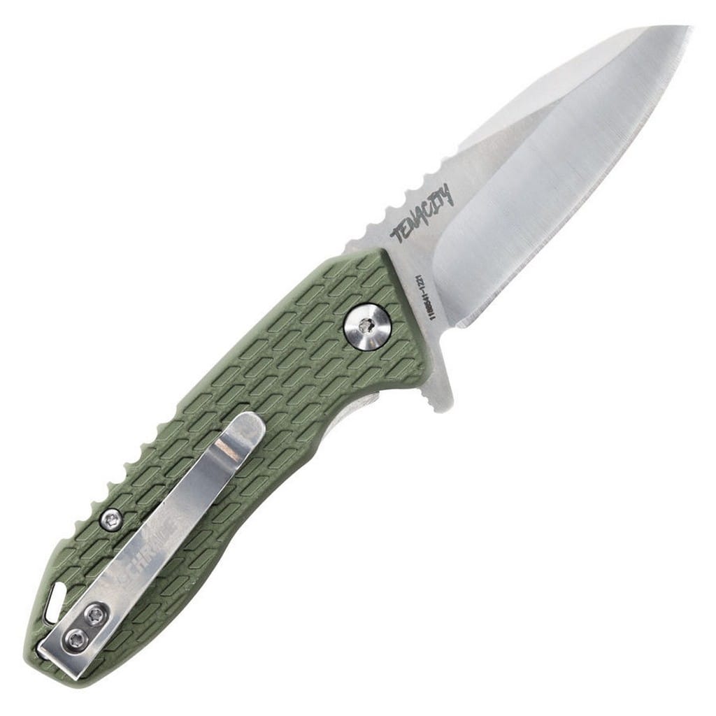 Tenacity to kompaktowy nóż zaprojektowany przez amerykańską firmę Schrade z myślą o codziennym użytkowaniu. Ostrze o zmodyfikowanym profilu Drop Point wykonano ze stali nierdzewnej AUS-10 i wykończone metodą Satin, co pozostawia efekt niedokładnego wypolerowania, dzięki drobnym ryskom delikatnie matującym powierzchnię głowni. W szybkim rozłożeniu klingi pomaga duży flipper, pełniący jednocześnie funkcję jelca, a mechanizm łożysk kulkowych Ultra Glide wpływa na płynną pracę narzędzia. Karbowany grzbiet foldera stanowi stabilne podparcie dla palców, zaś blokada Liner Lock czuwa nad bezpieczeństwem użytkownika, zapobiegając przed przypadkowym złożeniem się głowni, gdy jest w użyciu. Do stalowych linersów przymocowano odpowiednio wyprofilowane okładziny chwytu zrobione z aluminium anodyzowanego na zielono. Wytłoczony na rękojeści wzór poprawia przyczepność do dłoni, a także dodaje charakteru konstrukcji. Całość uzupełnia otwór na linkę oraz klips mocujący, dzięki któremu możemy wygodnie transportować nóż w kieszeni spodni lub przy wyposażeniu.