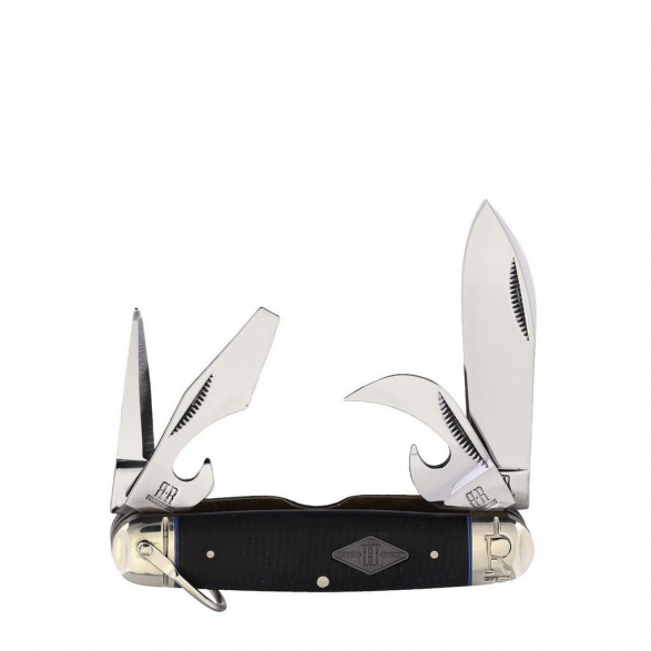 Wielofunkcyjny scyzoryk należący do serii Classic Carbon II amerykańskiej firmy Rough Rider. Model oprócz tradycyjnego ostrza do cięcia posiada również inne narzędzia takie jak otwieracz do puszek i butelek, śrubokręt płaski oraz przebijak. Wszystkie te elementy zostały wykonane ze stali narzędziowej T-10. Wykończenie głowni metodą Mirror-Polished pozostawia lustrzany efekt prezentujący się niezwykle spektakularnie. Na jednym z boków każdej klingi znajduje się ozdobione charakterystycznymi nacięciami zagłębienie na paznokieć służące do otwierania noża przy wykorzystaniu blokady sprężynowej. Gładkie okładziny rękojeści z Micarty w kolorze czarnym wzbogacono niebieskimi podkładkami i przymocowano do miedzianych linersów. Konstrukcję uzupełniają nikowane piny oraz błyszczące bolstery, a także kółko mocujące. Produkt stanowi doskonały wybór na model EDC, który sprosta większości codziennych prac począwszy od obierania jabłka, otwierania puszek z jedzeniem, a skończywszy na cięciu przewodów elektrycznych. Bez problemu zmieści się w kieszeni spodni lub doczepimy go do pęku kluczy, tak, aby mieć go zawsze pod ręką gotowego do działania. Scyzoryki Rough Rider to proste i niezawodne nożyki, które zadowalają użytkowników stosunkiem ceny do jakości wykonania. Firma posiada szeroki wybór zarówno kształtów ostrzy jak i materiałów rękojeści co pozwoli każdemu miłośnikowi rozpoczynającemu kompletowanie swojej kolekcji znaleźć ulubiony i najlepiej odpowiadający indywidualnym preferencjom model.