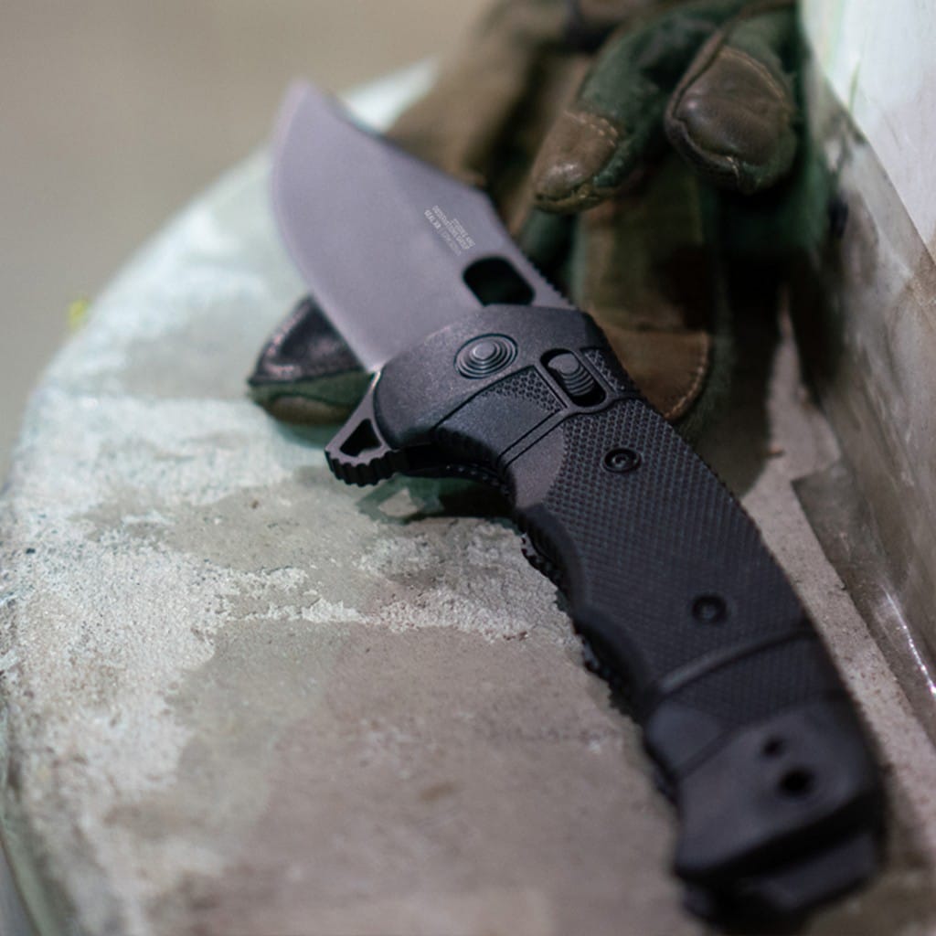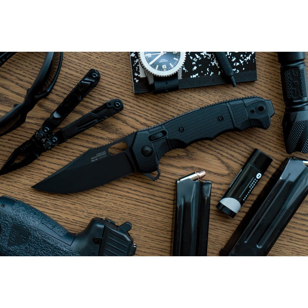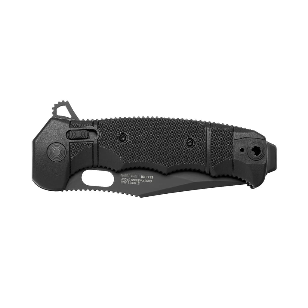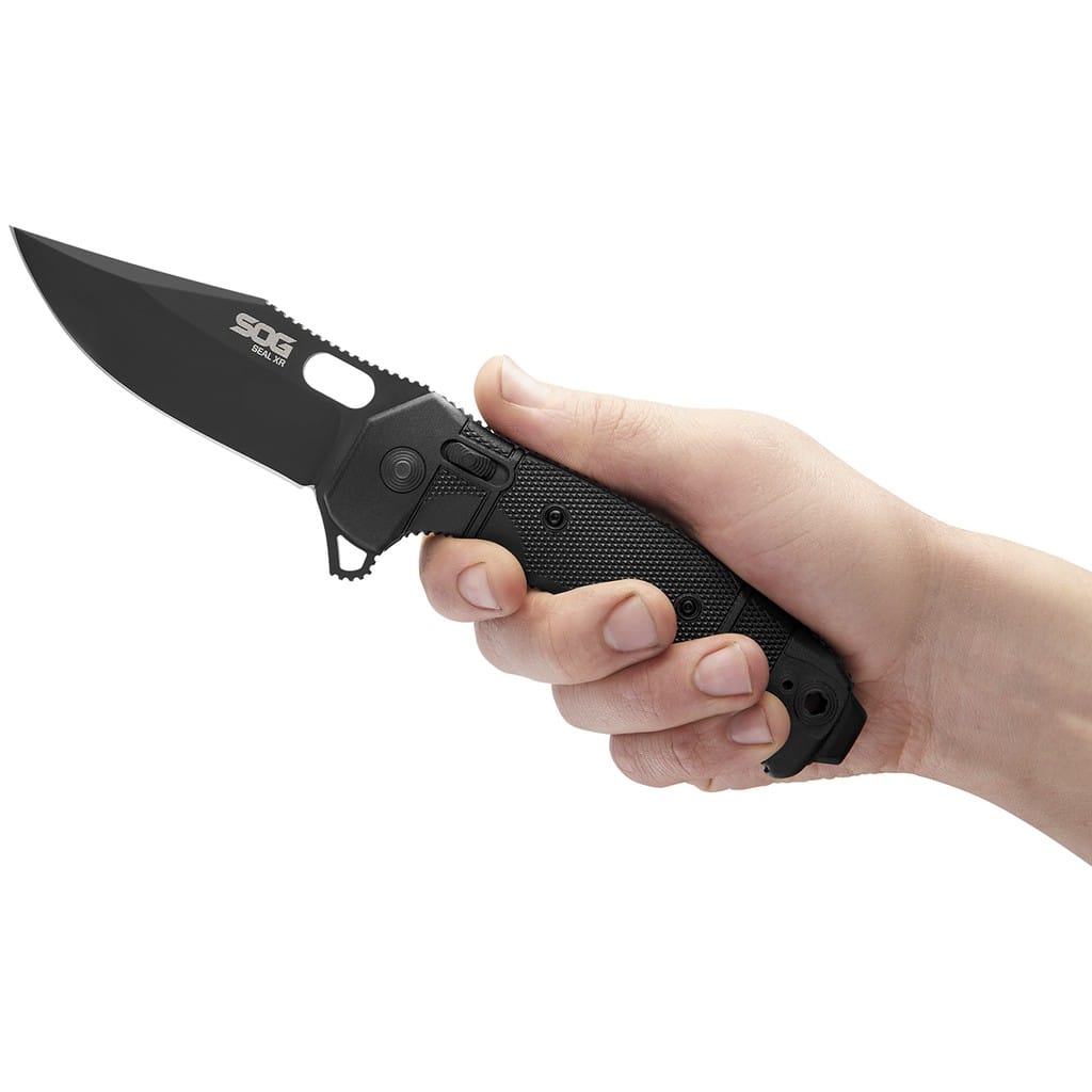 Seal XR to wielkoformatowy folder, który kontynuuje funkcjonalność noży Seal z ostrzem stałym. Model został zaprojektowany, przetestowany i zoptymalizowany w porozumieniu z profesjonalnymi użytkownikami. Firma Sog bazując na stali wysokiej jakości, jaką jest CPM S35VN, wykonała głownię o zwiększonej wytrzymałości długo utrzymującej ostrą krawędź odporną na zużycia, a jednocześnie łatwą w ponownym ostrzeniu. Dodatkowo ostrze pokryto czarną, matową powłoką Cerakote zabezpieczającą przed korozją i odblaskami. Folder charakteryzuje się innowacyjnym systemem blokującym XR, co pozwala rozłożyć nóż jedną ręką na trzy rożne sposoby. Wykorzystując duży flipper pełniący jednocześnie funkcję jelca, za pomocą otworu na ostrzu lub przesuwnym guzikiem na rękojeści. Bezpieczeństwo i komfort pracy poprawiają karbowane krawędzie narzędzia oraz odpowiednio wyprofilowany chwyt z nylonu wzmocnionego włóknem szklanym.Specjalna faktura rękojeści gwarantuje dobrą przyczepność nawet, gdy dłoń jest mokra lub zabrudzona. Uzupełnienie konstrukcji stanowi otwór na linkę oraz dwupozycyjny klips mocujący do wygodnego transportowania noża w kieszeni lub przy wyposażeniu. Wyprodukowany w USA model Seal XR to nie lada gratka dla wszystkich kolekcjonerów i miłośników folderów taktycznych.