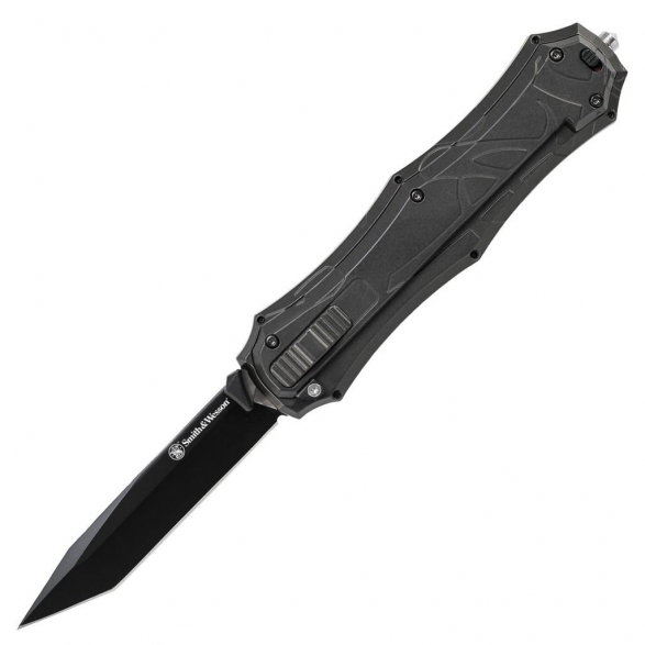 SWOTF9TB firmy Smith & Wesson to składany nóż taktyczny o ciekawym wzornictwie i nowatorskiej budowie. Ostrze o charakterystyce Tanto zostało wykonane z wysokiej jakości japońskiej stali nierdzewnej AUS-8 i pokryte farbą zabezpieczającą przed korozją. Aluminiowa rękojeść w czarnym kolorze o ergonomicznym kształcie gwarantują pewny chwyt w każdych warunkach. Model z serii OTF otwiera się automatycznie po pierwotnym zwolnieniu blokady poprzez przesunięcie zamka w dół, aż odsłoni się czerwona kropka, a następnie przesunięciu do przodu suwaka znajdującego się z przodu rękojeści. Ostrze posiada specjalny mechanizm wspomagający otwieranie, dzięki czemu nóż jest gotowy do użycia w mgnieniu oka. Uzupełnieniem konstrukcji jest zbijak do szyb przydatny w awaryjnej sytuacji oraz klips umożliwiający przymocowanie noża do kieszeni lub ekwipunku.