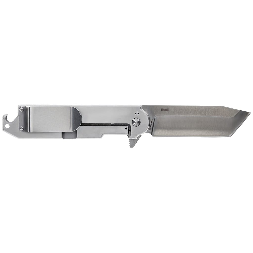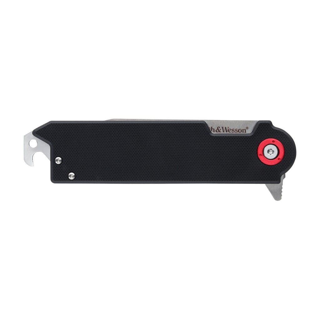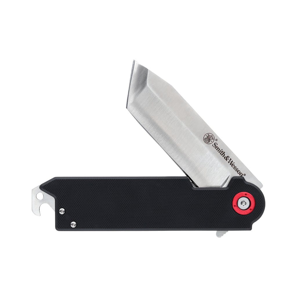 Big Benji firmy Smith & Wesson to pełnowymiarowa wersja swojego mniejszego brata. Ten funkcjonalny model doskonale sprawdzi się jako nóż EDC w domu i w terenie. Ostrze o profilu Tanto zostało wykonane ze stali nierdzewnej 8Cr13MoV. Wykończenie jej metodą Satin pozostawia drobne ryski lekko matujące powierzchnię, co daje efekt niedokładnego wypolerowania. W szybkim rozłożeniu klingi pomaga duży flipper, pełniący jednocześnie funkcję jelca, a mechanizm łożysk kulkowych Ultra Glide wpływa na płynną pracę narzędzia. Niezawodna blokada Frame Lock zapewnia użytkownikowi bezpieczeństwo podczas pracy. Rękojeść to połączenie stali na jednej ze stron z tworzywem G10 o antypoślizgowej fakturze na drugiej. Czerwony pierścień wokół głównej śruby stanowi element ozdobny nadający charakteru całej konstrukcji. Na zakończeniu znajduje się otwór na linkę umożliwiający przełożenie paracordu lub breloka ozdobnego. Dodatkowo wbudowany otwieracz do kapsli pozwala cieszyć się smakiem naszego ulubionego napoju podczas aktywności na świeżym powietrzu. Całość uzupełnia szeroki klips mocujący, który oprócz funkcji wygodnego noszenia noża w kieszeni spodni, może pełnić rolę spinacza do banknotów.