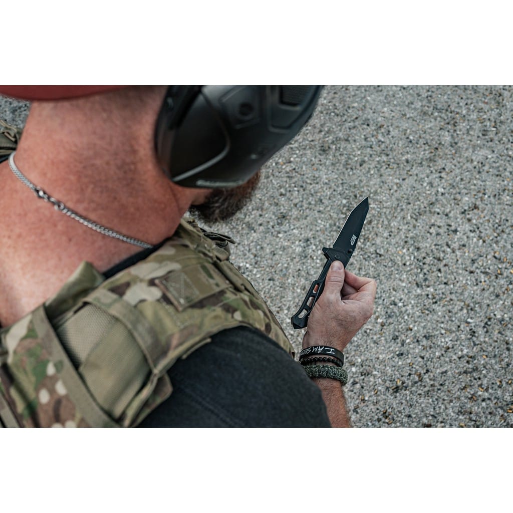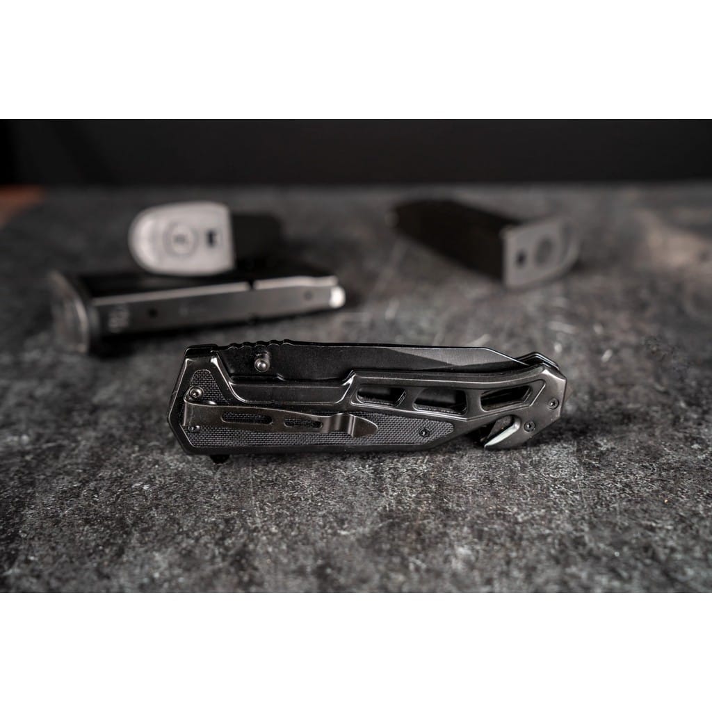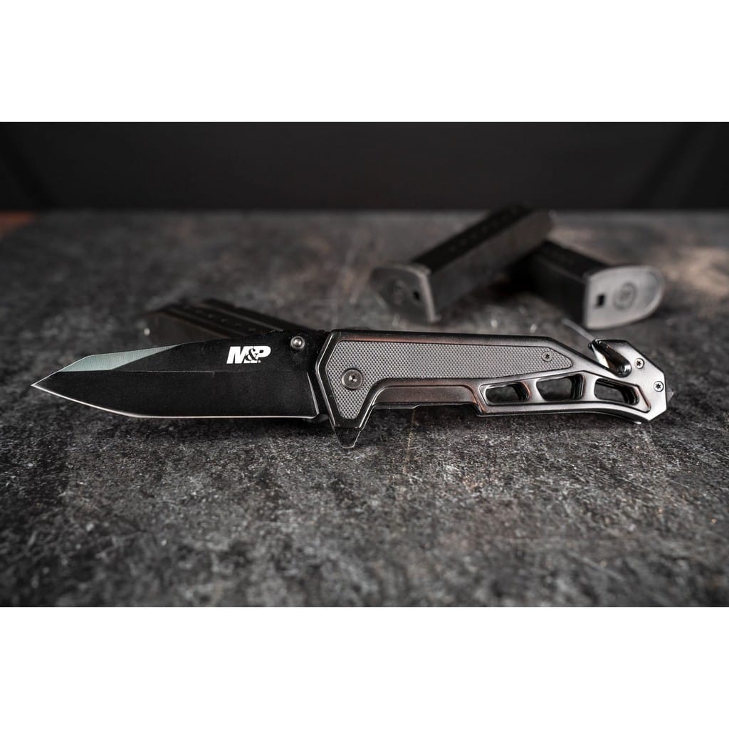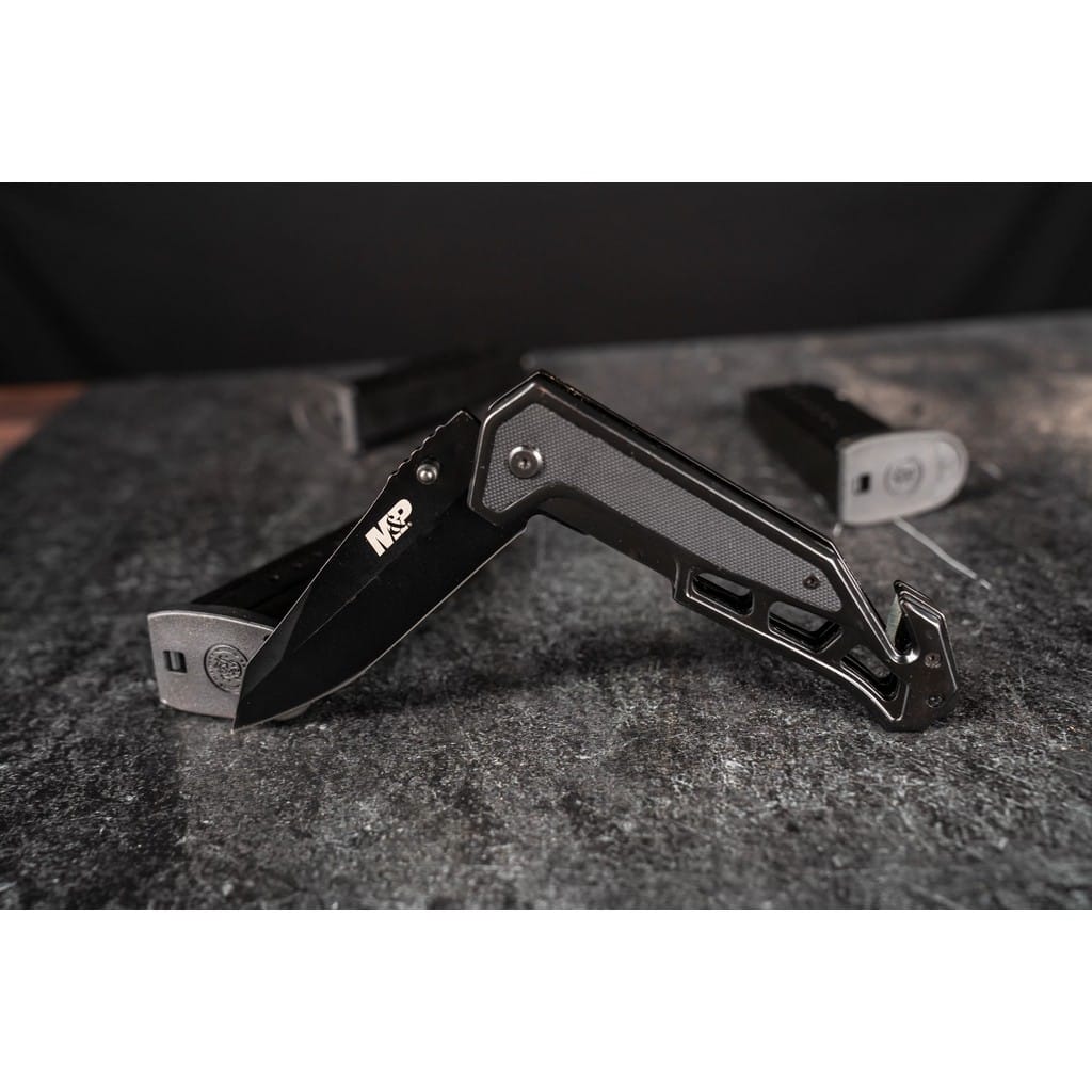 Nóż ratunkowy należący do serii Military & Police firmy Smith & Wesson z wbudowanym zbijakiem do szyb oraz ostrzem do cięcia lin i pasów bezpieczeństwa. Model został zaprojektowany przez jedną z najbardziej rozpoznawalnych firm na całym świecie zajmującą się produkcją broni palnej. Doskonale nadaje się jako funkcjonalne narzędzie do codziennego użytku dla policjanta, ratownika, strażaka, a także dla wszystkich miłośników militariów. Gładka głownia o profilu Tanto została zrobiona ze stali nierdzewnej 7Cr17MoV i pokryta czarną oksydą chroniącą przed korozją i odblaskami. Szybkie i sprawne rozłożenie foldera jedną ręką umożliwia obustronny kołek lub flipper pełniący jednocześnie funkcję jelca. Dodatkowo wspomaganie wysuwania ostrza w postaci wewnętrznej sprężyny, sprawia że model jest gotowy do działania w ułamku sekundy. Bezpieczeństwo pracy, gdy nóż jest w użyciu zapewnia klasyczny mechanizm Liner Lock. Karbowany grzbiet głowni stanowi stabilne podparcie dla kciuka, co ułatwia wykonywanie zadań wymagających większej precyzji. Ergonomicznie wyprofilowana rękojeść ze stali i wytrzymałego tworzywa G10 posiada wcięcie pod palec co gwarantuje pewny chwyt w każdych warunkach. Dodatkowo konstrukcję uzupełnia klips mocujący do wygodnego przenoszenia narzędzia w kieszeni spodni lub przy wyposażeniu.