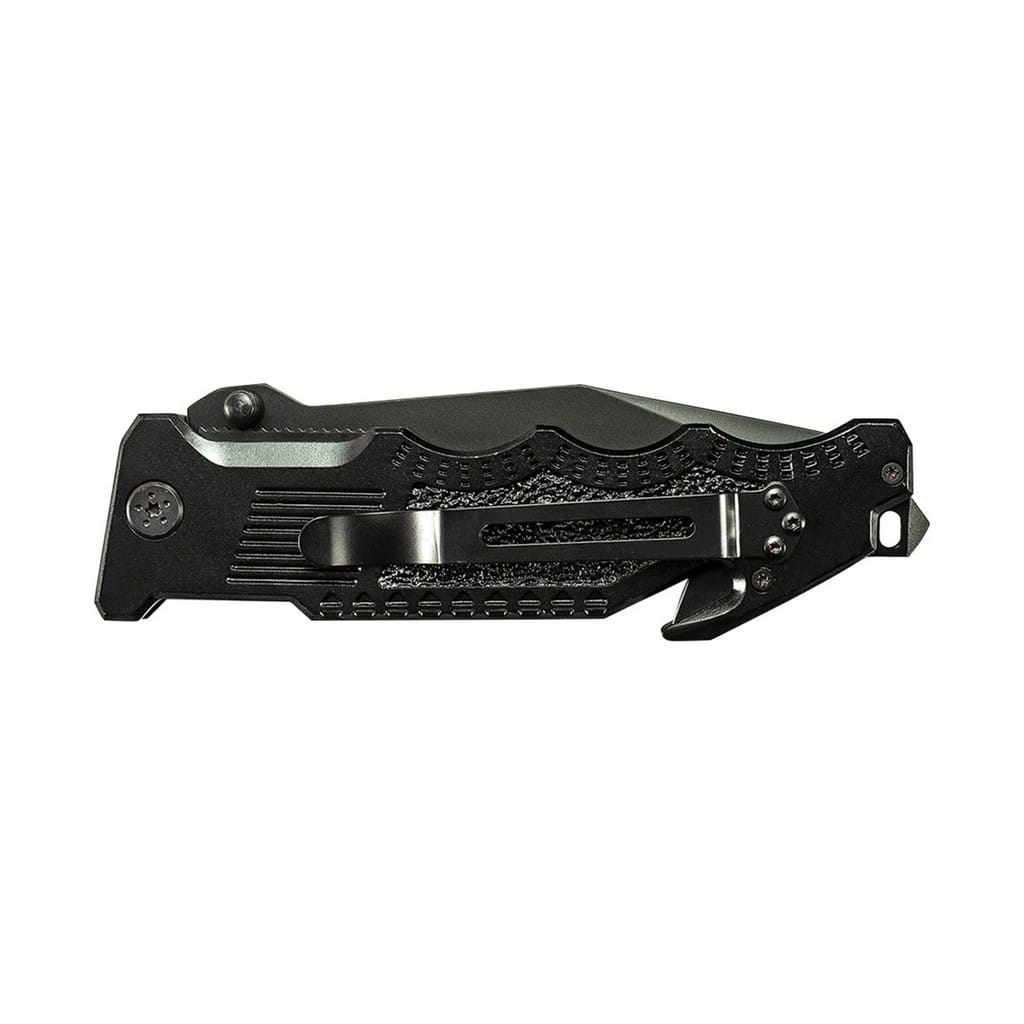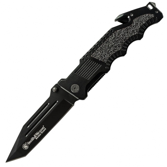 Duży nóż taktyczny z serii Border Guard zaprojektowany przez popularnego producenta broni palnej, firmę Smith & Wesson. Folder posiada gładkie ostrze o profilu Tanto zrobione ze stali nierdzewnej 7Cr17MoV pokrytej czarną oksydą, chroniącą przed korozją i odblaskami. Szybkie i sprawne rozłożenie narzędzia jedną ręką umożliwia obustronny kołek. Bezpieczeństwo pracy, gdy folder jest w użyciu zapewnia klasyczny mechanizm Liner Lock. Ergonomicznie wyprofilowaną rękojeść zrobiono z aluminium o chropowatej fakturze poprawiającej przyczepność do dłoni, co gwarantuje pewny chwyt w każdych warunkach. Na zakończeniu znajduje się ostrze do cięcia pasów, zbijak do szyb oraz otwór na linkę umożliwiający przełożenie paracordu lub breloka ozdobnego. Dodatkowo konstrukcję uzupełnia klips mocujący do wygodnego przenoszenia narzędzia w kieszeni spodni lub przy wyposażeniu.