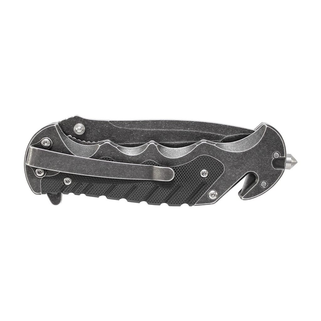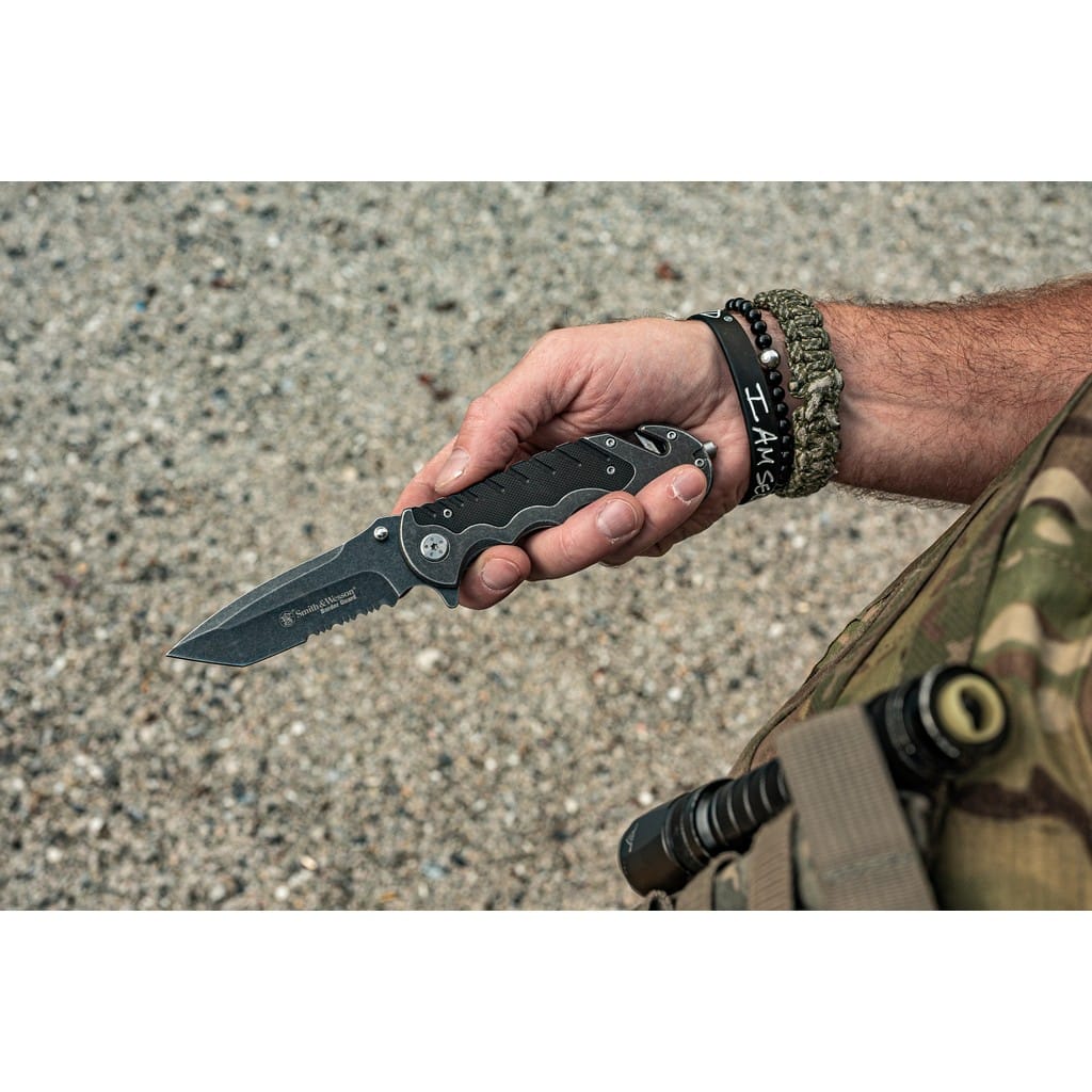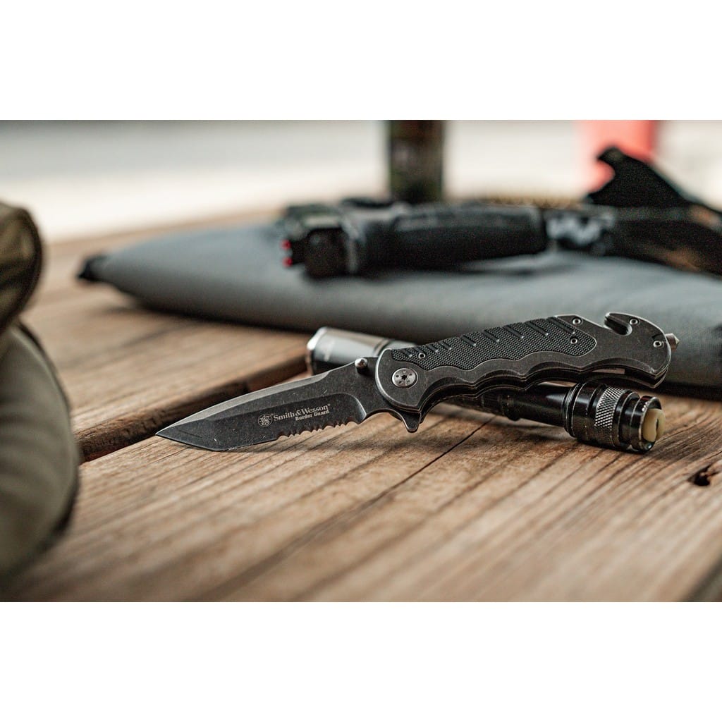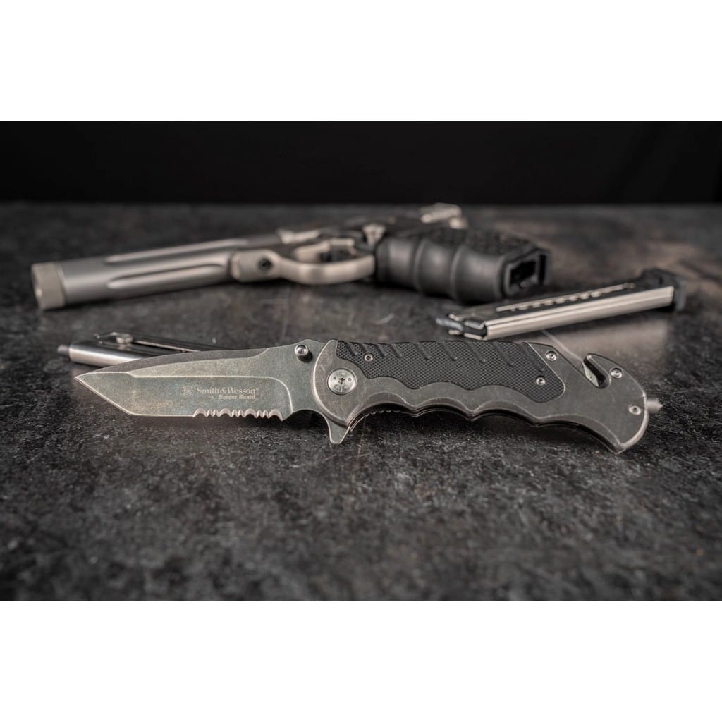 Nóż taktyczny z serii Border Guard zaprojektowany przez popularnego producenta broni palnej, firmę Smith & Wesson. Folder posiada ostrze o profilu Tanto zrobione ze stali nierdzewnej 7Cr17MoV i wykończone na czarno metodą Stonewash, pozostawiającą nieregularną powłokę świetnie maskującą rysy i zadrapania powstające podczas użytkowania. Głownia łączy zalety i uniwersalność ostrza gładkiego z ząbkowaną krawędzią tnącą. Pozwala to na skuteczne cięcie zarówno miękkich przedmiotów jak i twardych lin, taśm, sznurów oraz innych podobnych materiałów. Szybkie i sprawne rozłożenie narzędzia jedną ręką umożliwia obustronny kołek oraz duży flipper, pełniący jednocześnie funkcję jelca. Bezpieczeństwo pracy, gdy folder jest w użyciu zapewnia klasyczny mechanizm Liner Lock oraz karbowany grzbiet klingi dający stabilne podparcie dla kciuka. Ergonomicznie wyprofilowaną rękojeść zrobiono ze stali i wytrzymałego tworzywa G10 o antypoślizgowej fakturze poprawiającej przyczepność do dłoni, co gwarantuje pewny chwyt w każdych warunkach. Na zakończeniu znajduje się ostrze do cięcia pasów, zbijak do szyb oraz otwór na linkę umożliwiający przełożenie paracordu lub breloka ozdobnego. Dodatkowo konstrukcję uzupełnia klips mocujący do wygodnego przenoszenia narzędzia w kieszeni spodni lub przy wyposażeniu.