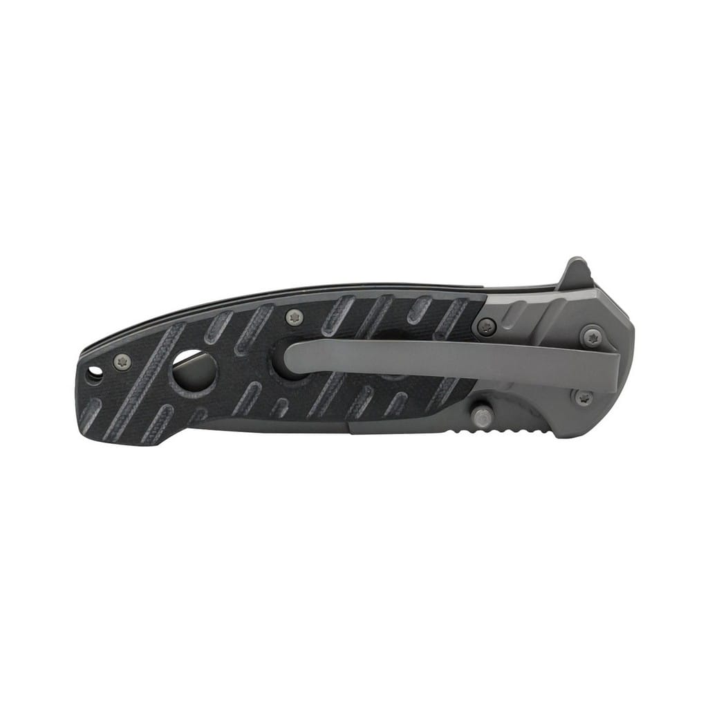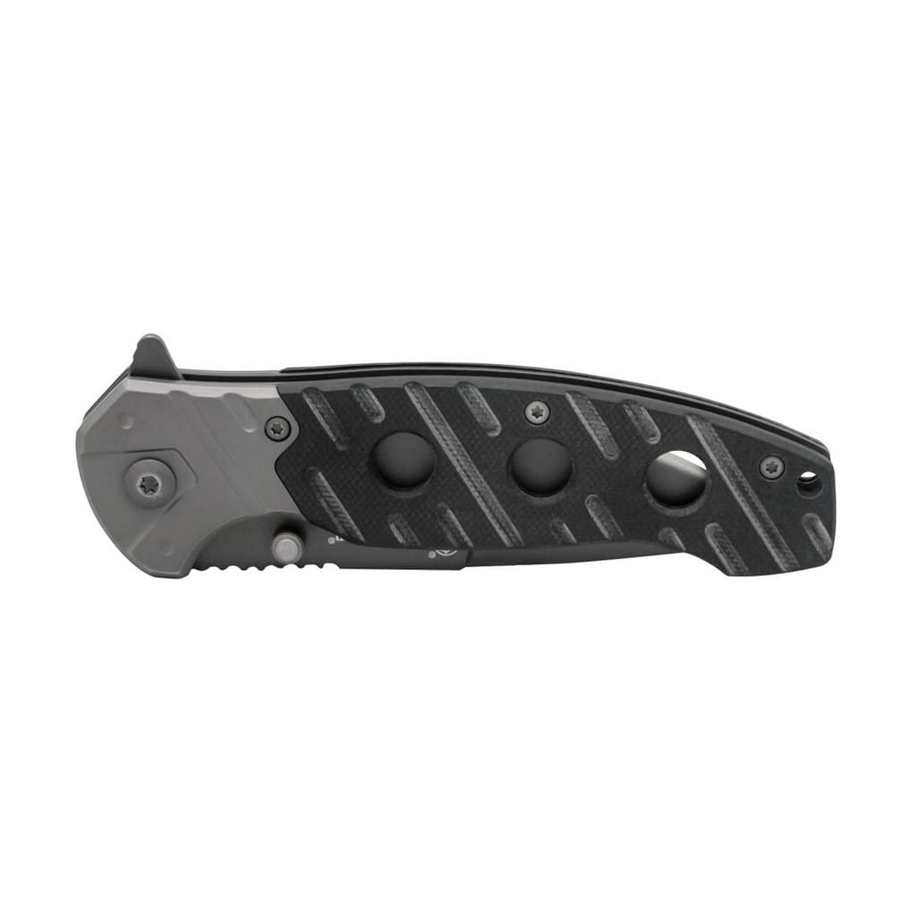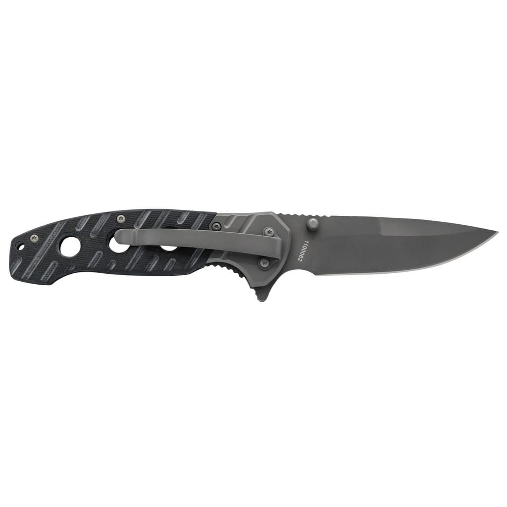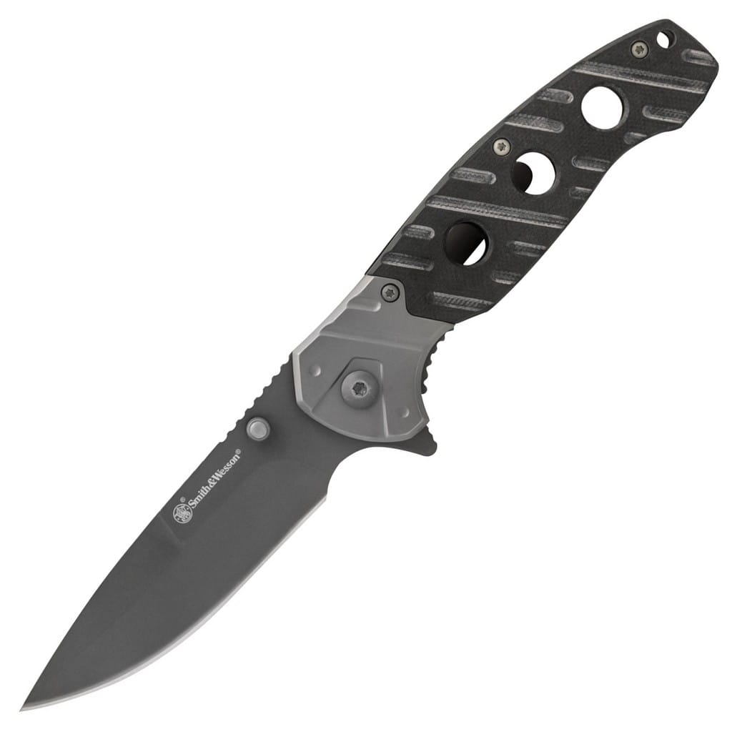 Funkcjonalny nóż EDC legendarnego producenta broni palnej, firmy Smith & Wesson zaprojektowany do codziennego użytku. Model stanowi doskonałą propozycję dla miłośników militariów poszukujących narzędzia do codziennej pracy w domu i w terenie. Gładkie ostrze o charakterystyce Drop Point zostało zrobione ze stali nierdzewnej 8Cr13MoV. Pokryto ją szarą powłoką Titanium Nitride (TiNi) chroniącą przed odblaskami i zarysowaniami. W szybkim wysunięciu klingi jedną ręką pomaga obustronny kołek lub flipper, pełniący jednocześnie funkcję jelca asekurującego palce przed ich przypadkowym zsunięciem się na krawędź tnącą. Karbowany grzbiet głowni daje stabilne wsparcie dla kciuka, co ułatwia wykonywanie zadań wymagających większej precyzji. Blokada Liner Lock dba o bezpieczeństwo użytkownika czuwając nad przypadkowym złożeniem się narzędzia. Rękojeść to połączenie stali z wytrzymałym tworzywem G10 z charakterystycznymi trzema otworami zmniejszającymi wagę konstrukcji. Odpowiednie wyprofilowanie chwytu i antypoślizgowa faktura gwarantują dobrą przyczepność do dłoni. Na zakończeniu znajduje się otwór na linkę umożliwiający przełożenie paracordu lub breloka ozdobnego. Całość dopełnia klips mocujący do wygodnego przenoszenia noża w kieszeni spodni lub przy wyposażeniu.