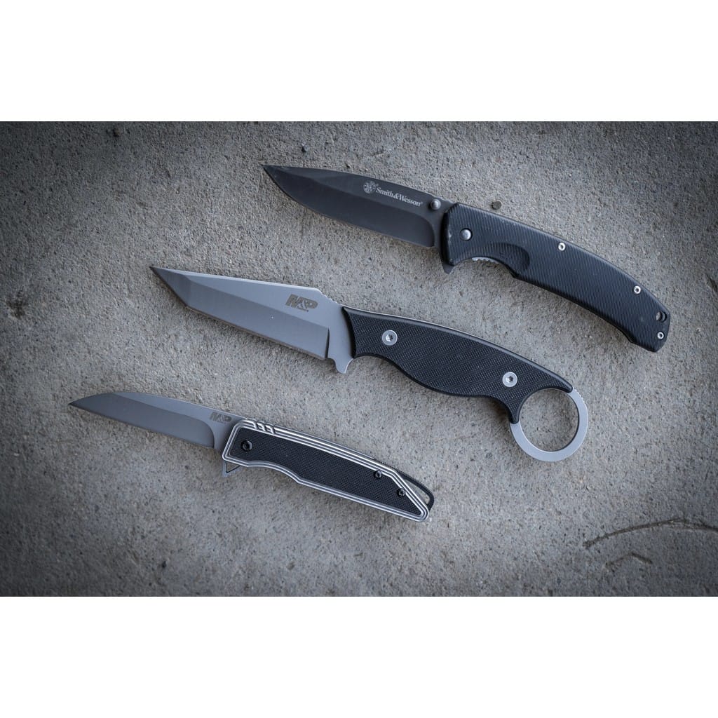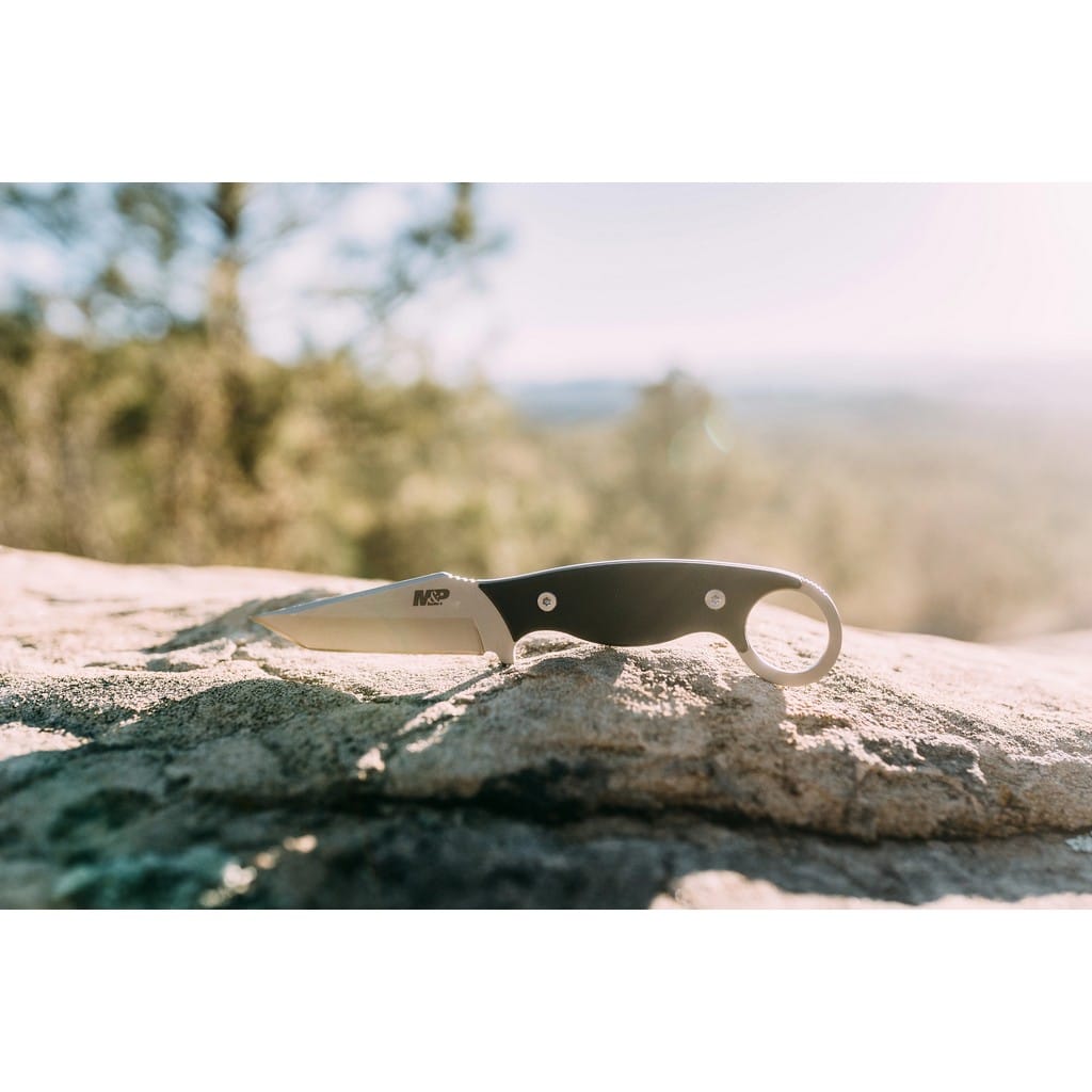 Taktyczny nóż wyprodukowany przez legendarnego producenta broni palnej - firmę Smith & Wesson. Model o konstrukcji full tang został wykonany z jednego kawałka stali nierdzewnej 9Cr18MoV, która znacznie zwiększa wytrzymałość i możliwości narzędzia. Głownia Tanto wzorowana na japońskich mieczach posiada odporny na uszkodzenia mechaniczne czubek. Taki profil ostrza doskonale sprawdzi się do pchnięć i podważania. Klingę wykończono poprzez piaskowanie, czyli metodą beablast, która pozostawia matową powłokę. Okładziny chwytu z lekkiego tworzywa G10 o antypoślizgowej fakturze i czarnym kolorze przymocowano śrubami do stalowego szkieletu. Na zakończeniu znajduje się okrągła głowica na palec, która jednocześnie przedłuża chwyt. W zestawie występuje również pochwa z tworzywa wyposażona w obrotowy klips mocujący. Dzięki niej możemy wygodnie przenosić nóż na pasku blisko ciała pod dowolnym kątem, wedle indywidualnych preferencji użytkownika.